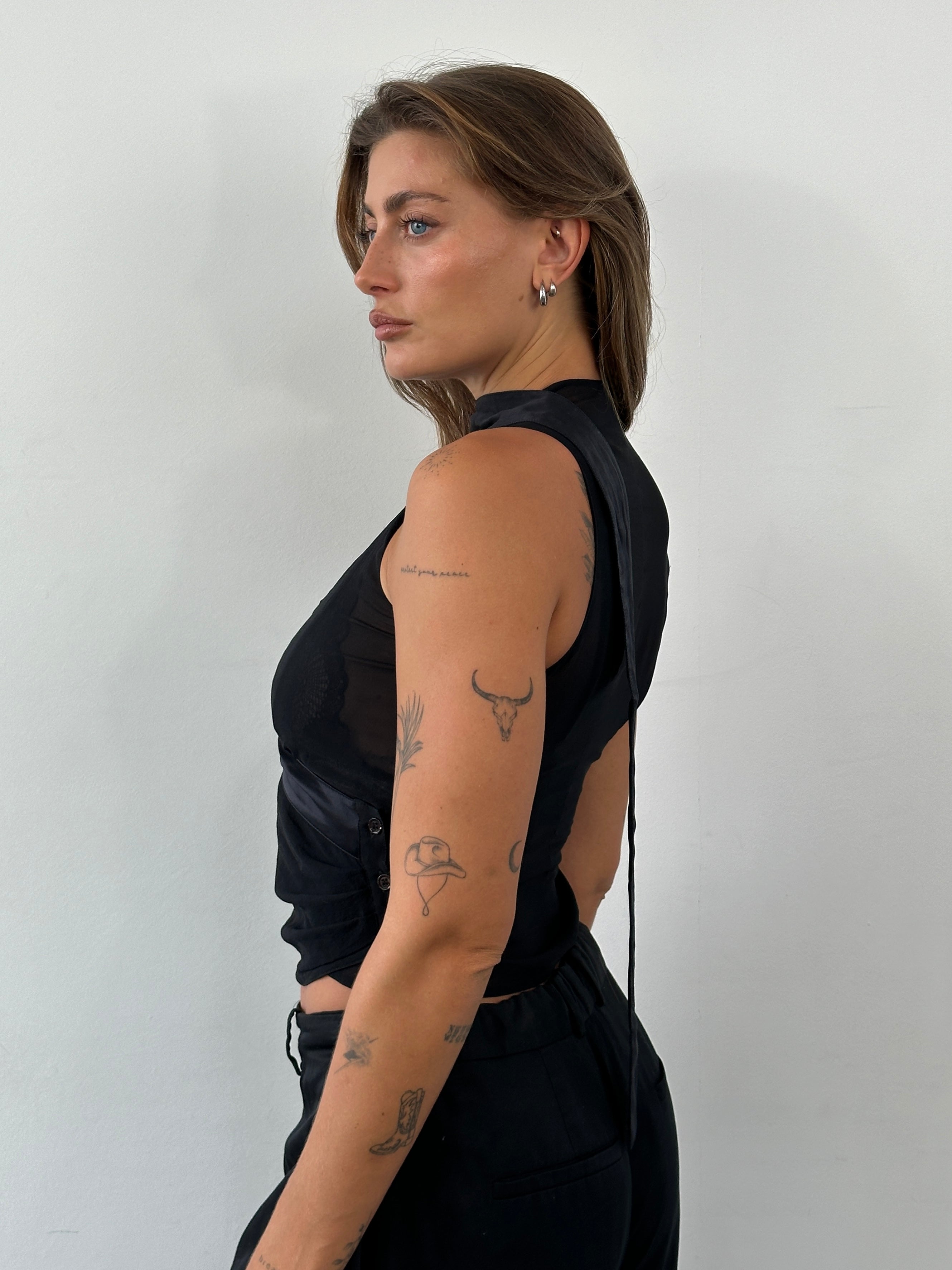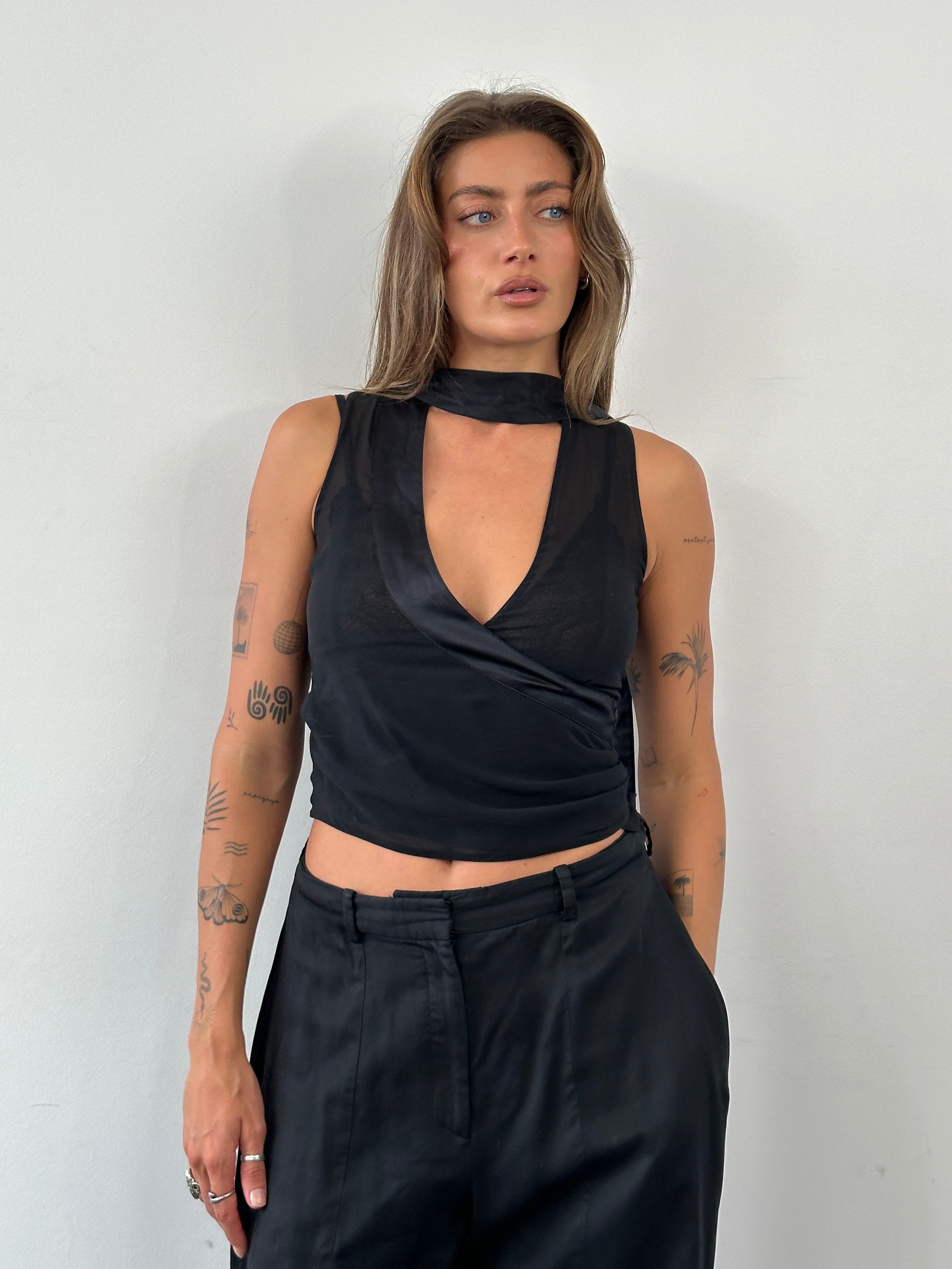Sheer silk wrap top by Emporio Armani, featuring a sculpted neckline with an integrated scarf tie and fluid sheer back.