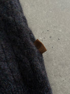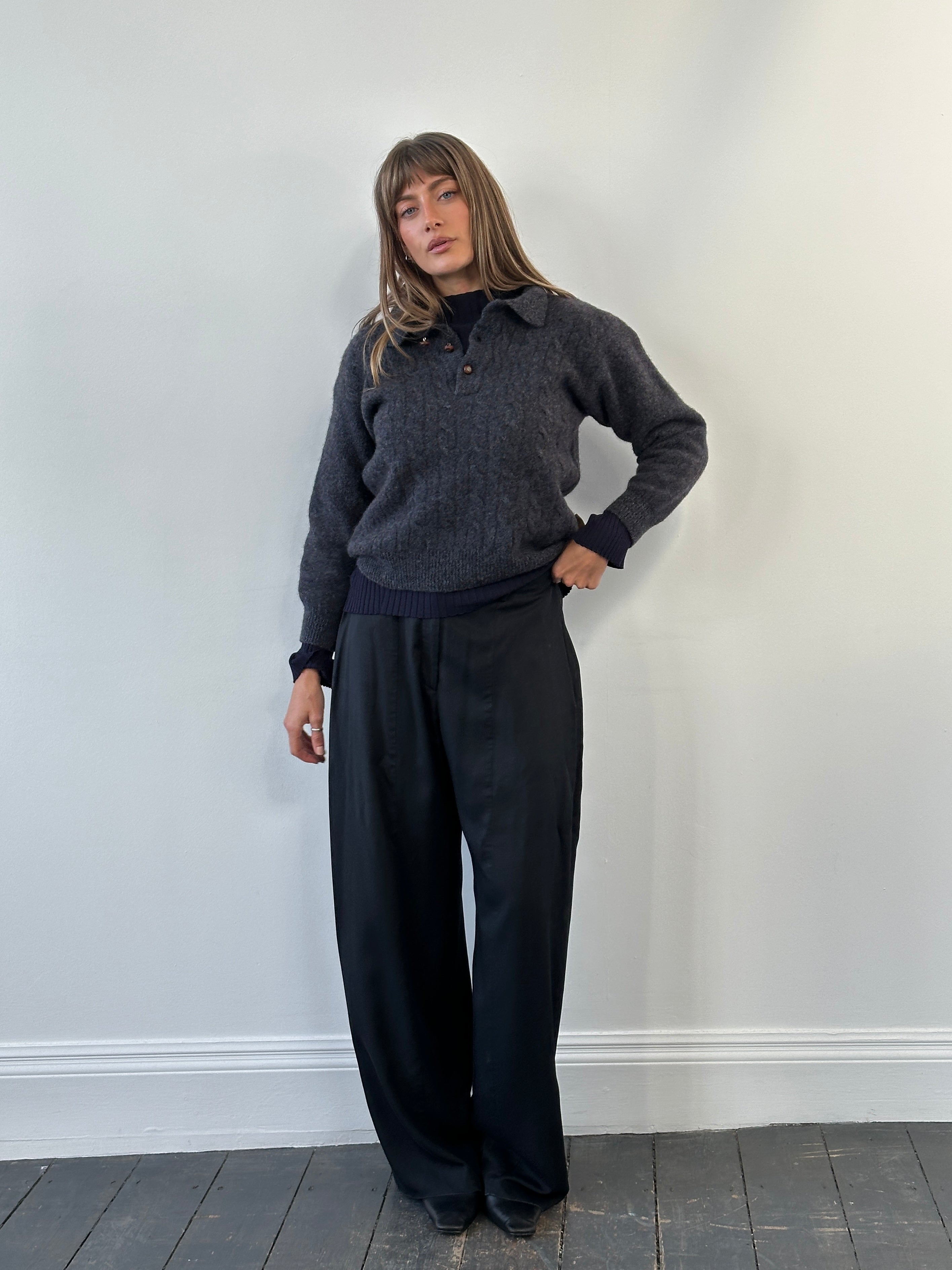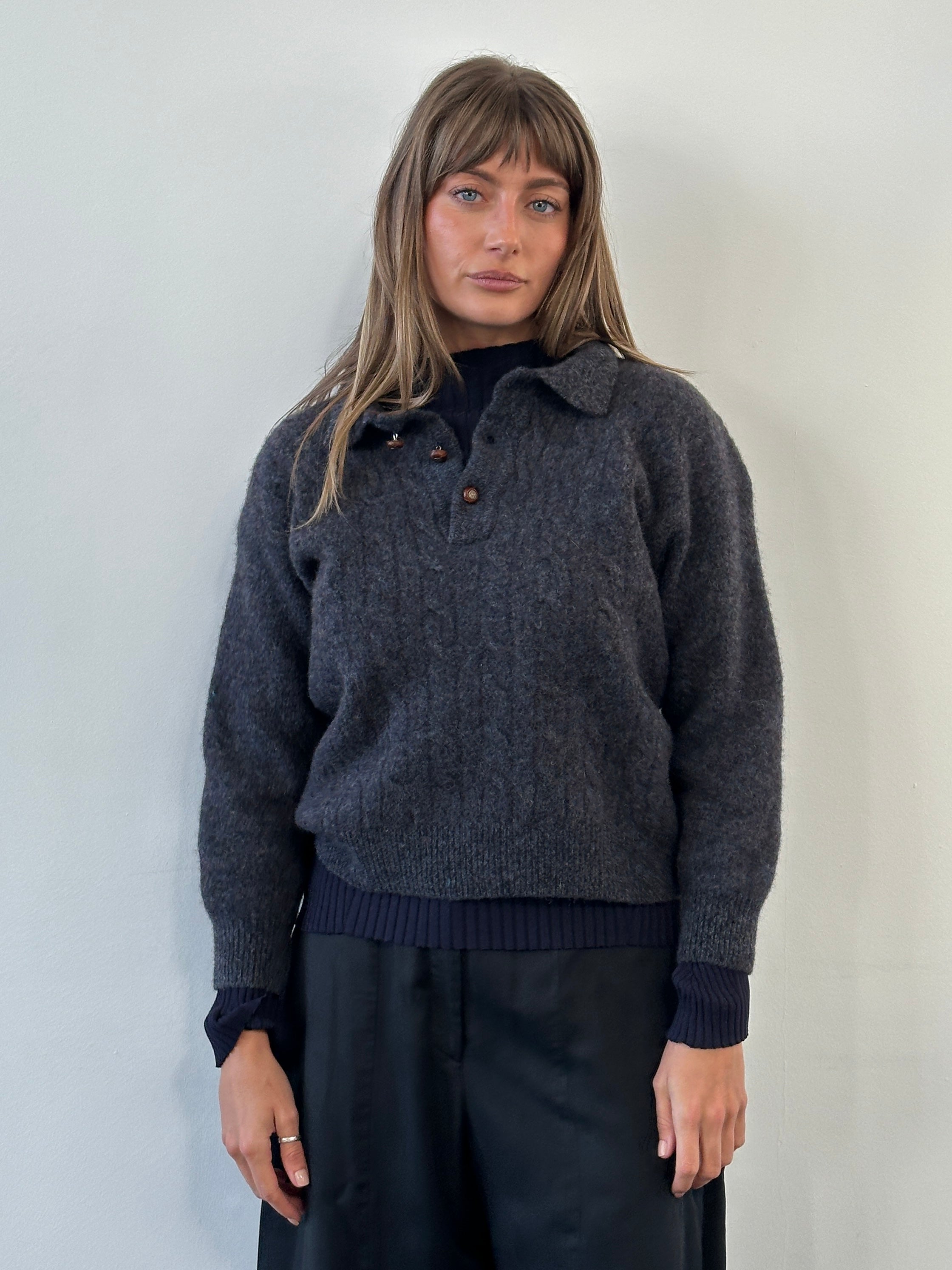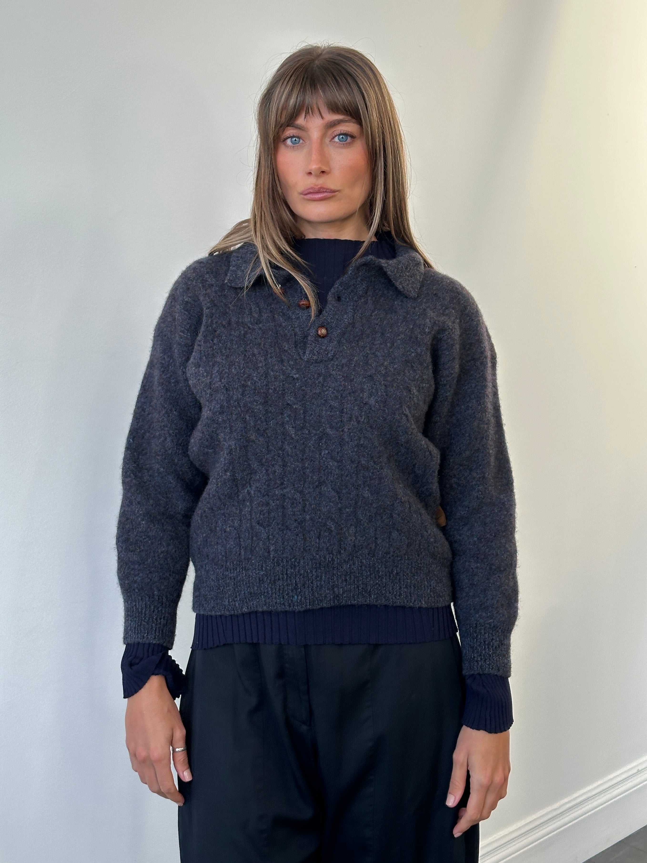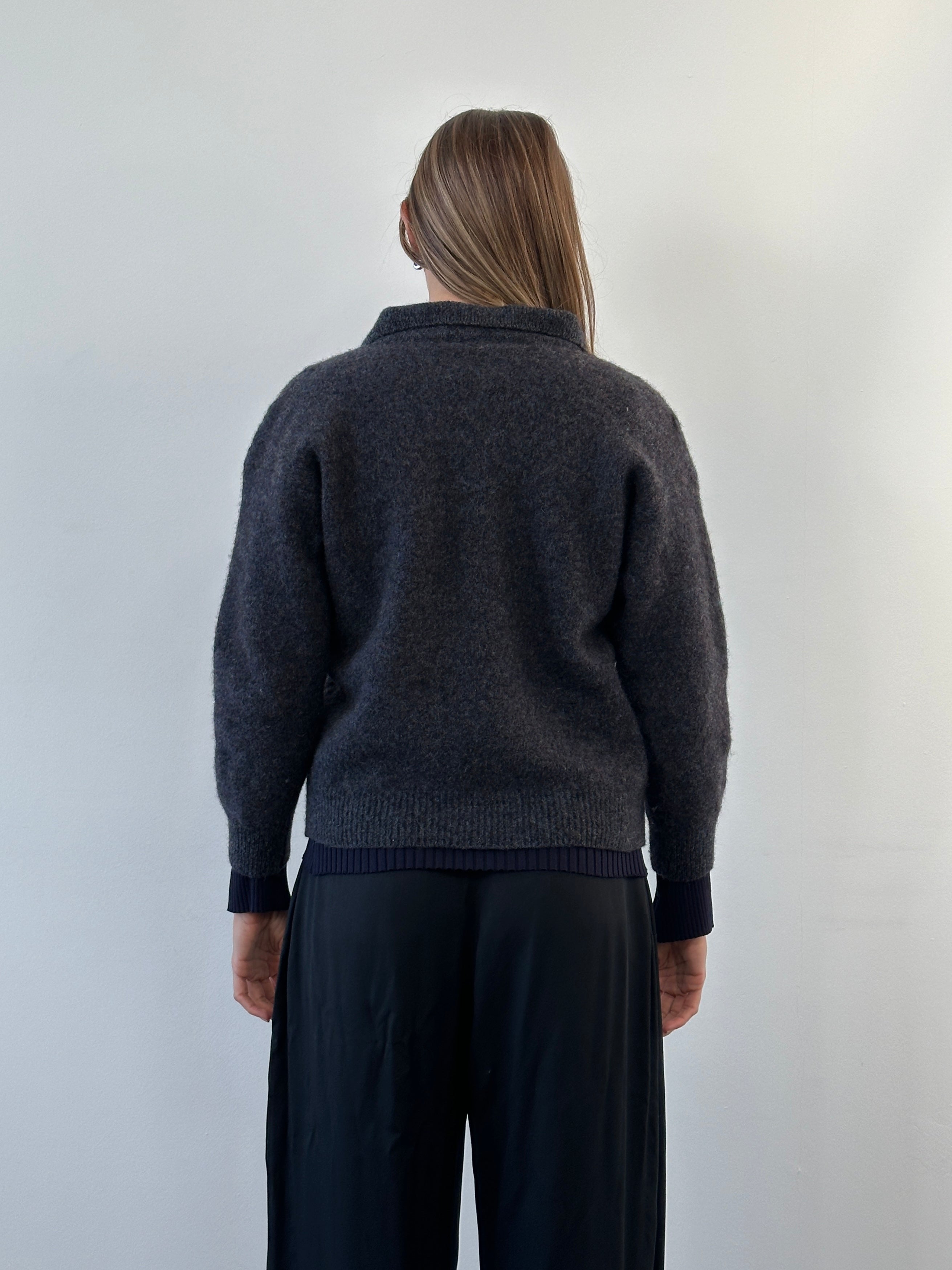 Vintage Valentino Studio 1990s wool knit in a soft navy & purple tone, featuring a classic polo neckline and logo engraved tortoiseshell buttons.