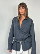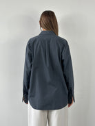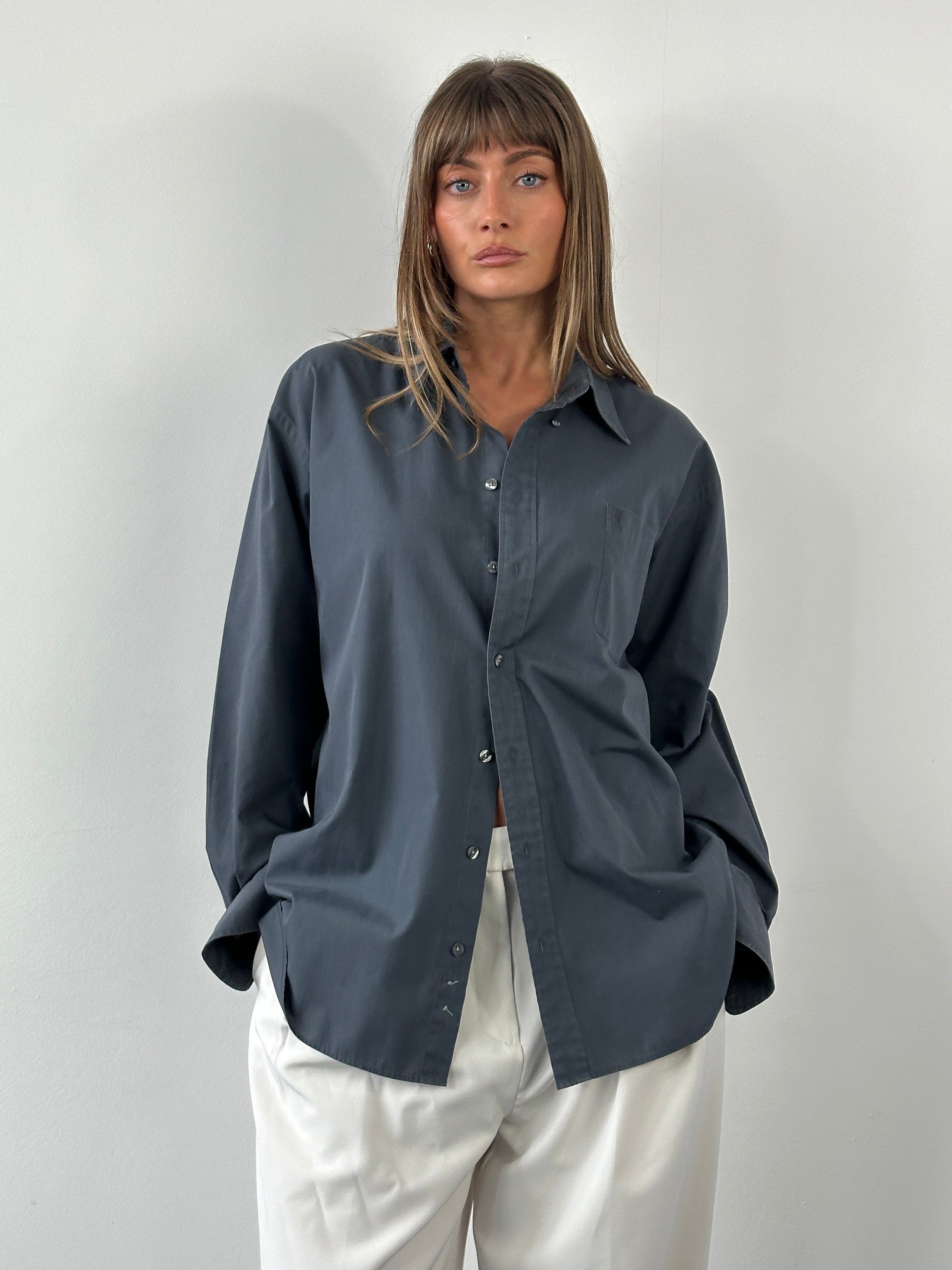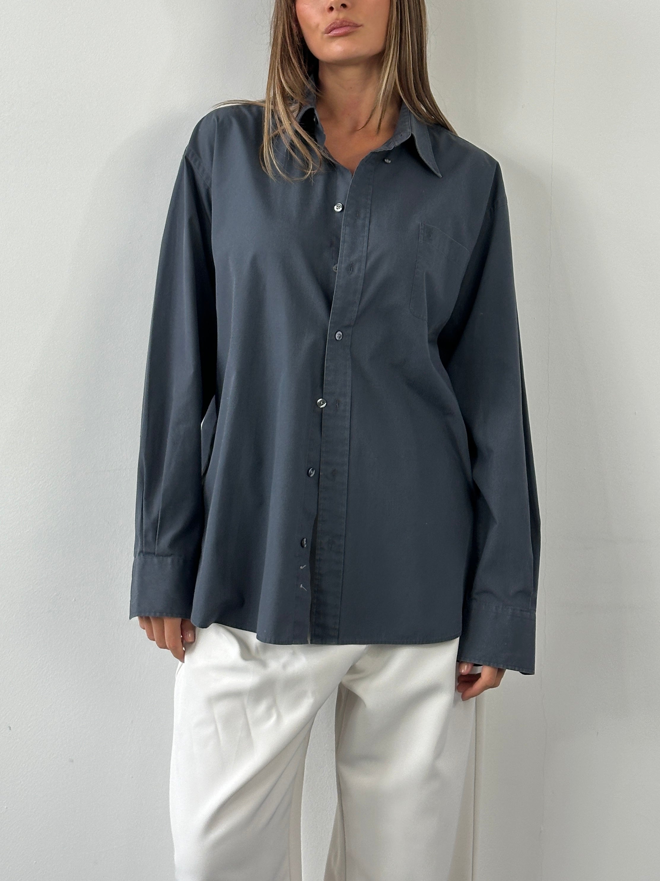 Vintage Yves Saint Laurent Pour Homme shirt in a muted blue grey tone, crafted from a smooth cotton blend fabric with a structured collar and single chest pocket. A minimal and refined staple from the YSL 1990s ready-to-wear menswear line.