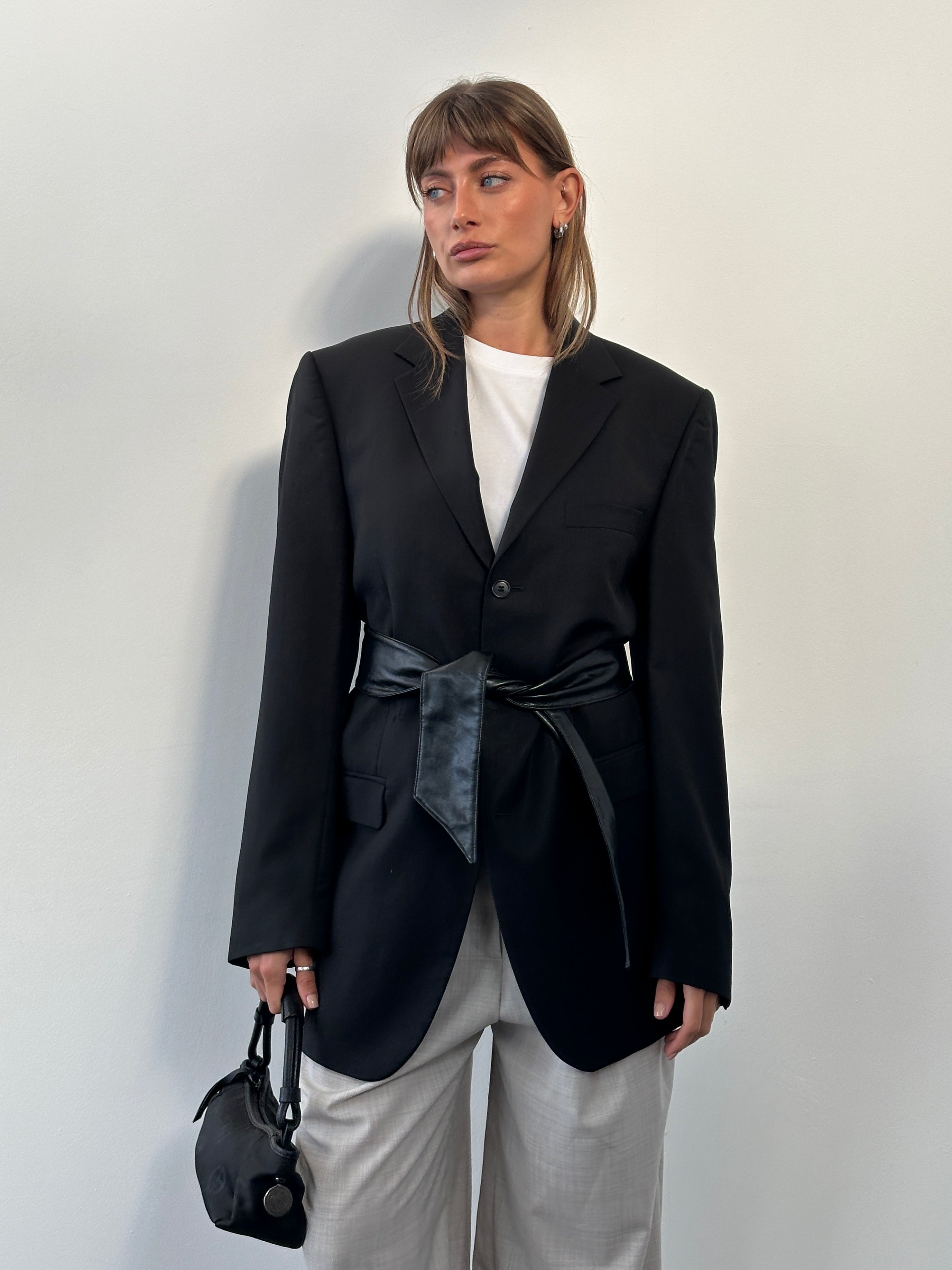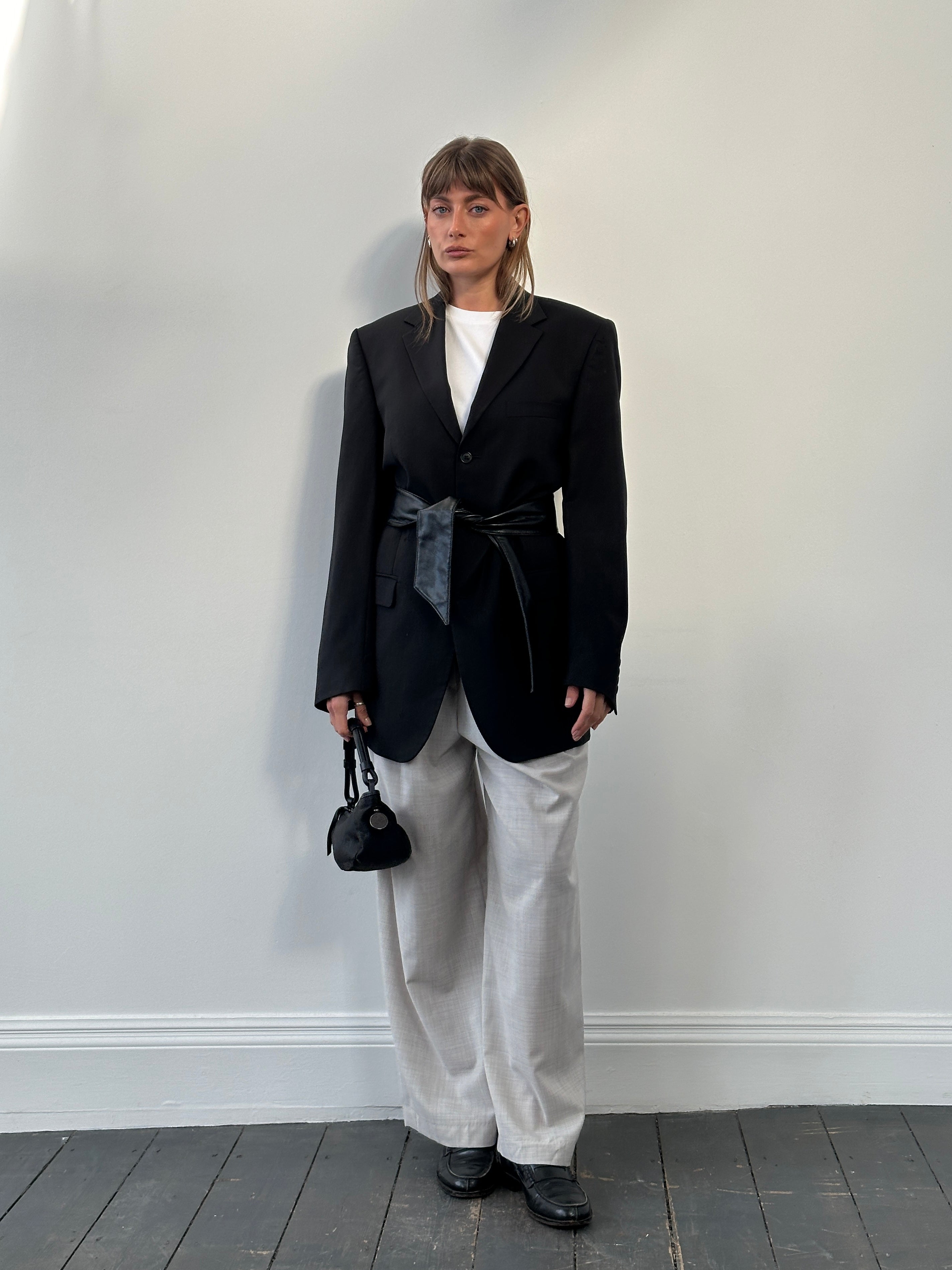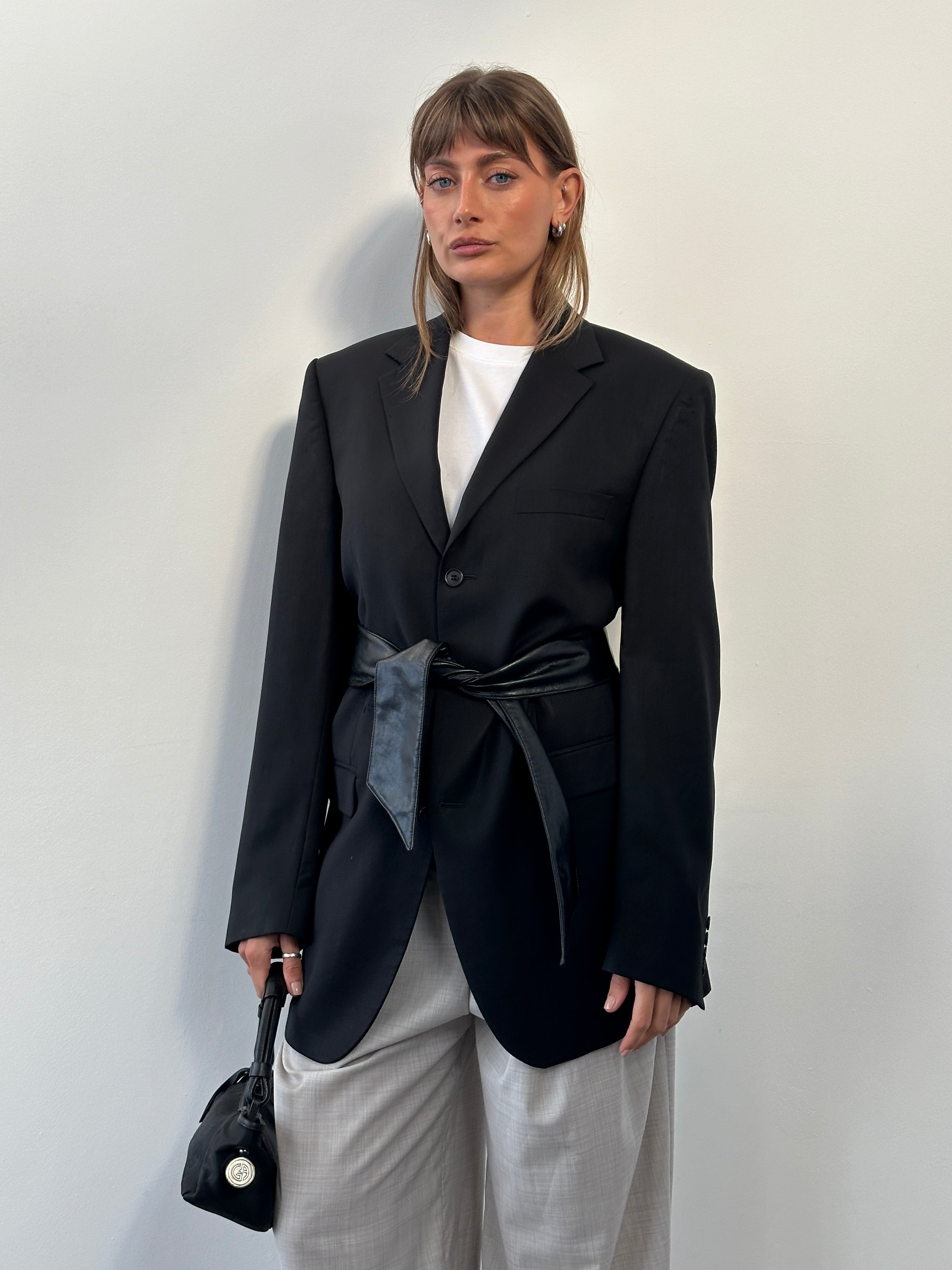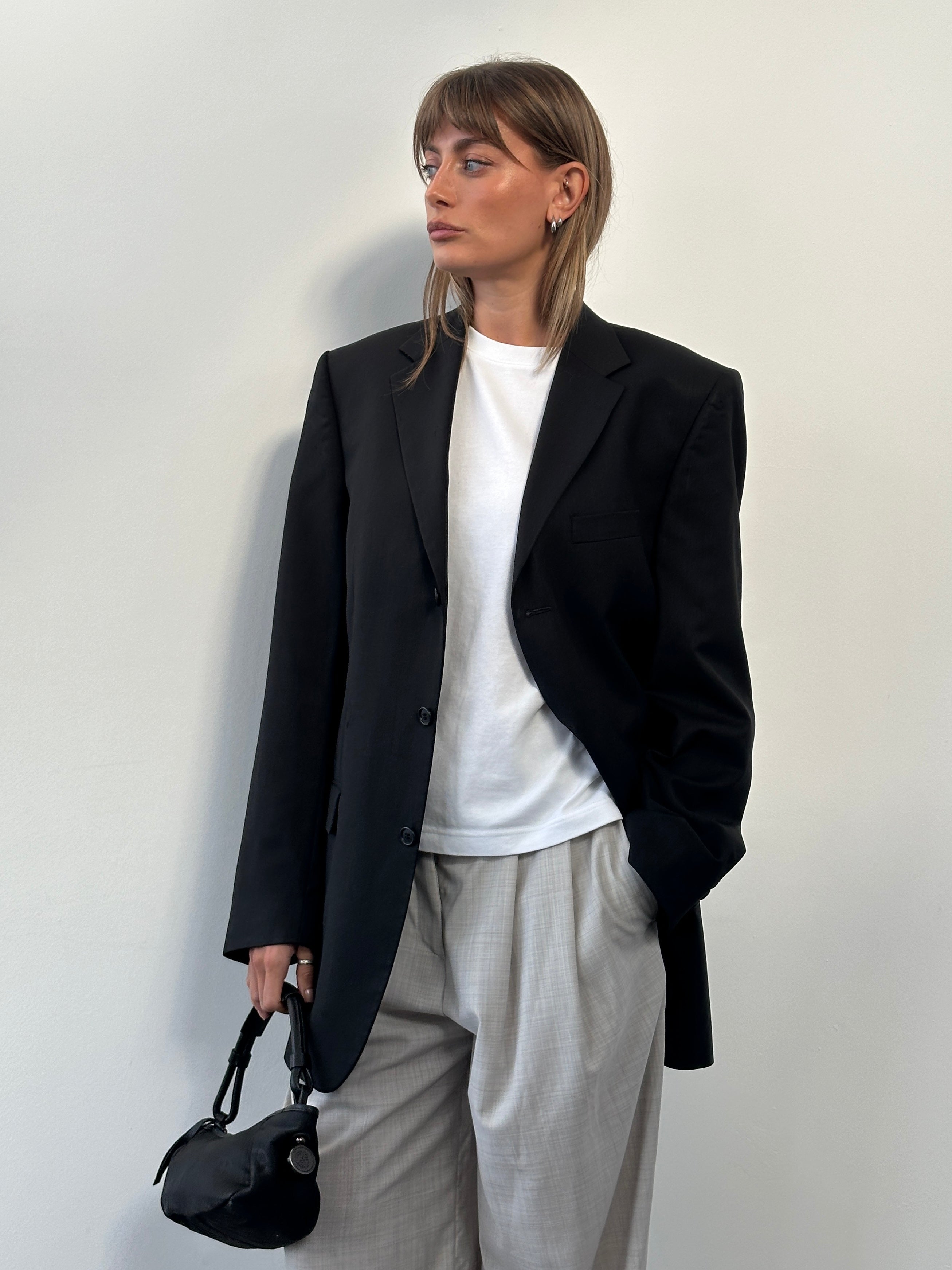 Vintage Yves Saint Laurent Pour Homme single-breasted blazer in a black, tailored from pure new wool with a structured silhouette and lightweight drape. A refined ready-to-wear piece from YSL’s 1990s menswear line.