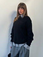 Vintage black V neck knit from the 1990s Armani Jeans line featuring tonal embroidery at the chest and a relaxed slouchy fit. A minimal everyday classic with a clean quiet luxury feel.