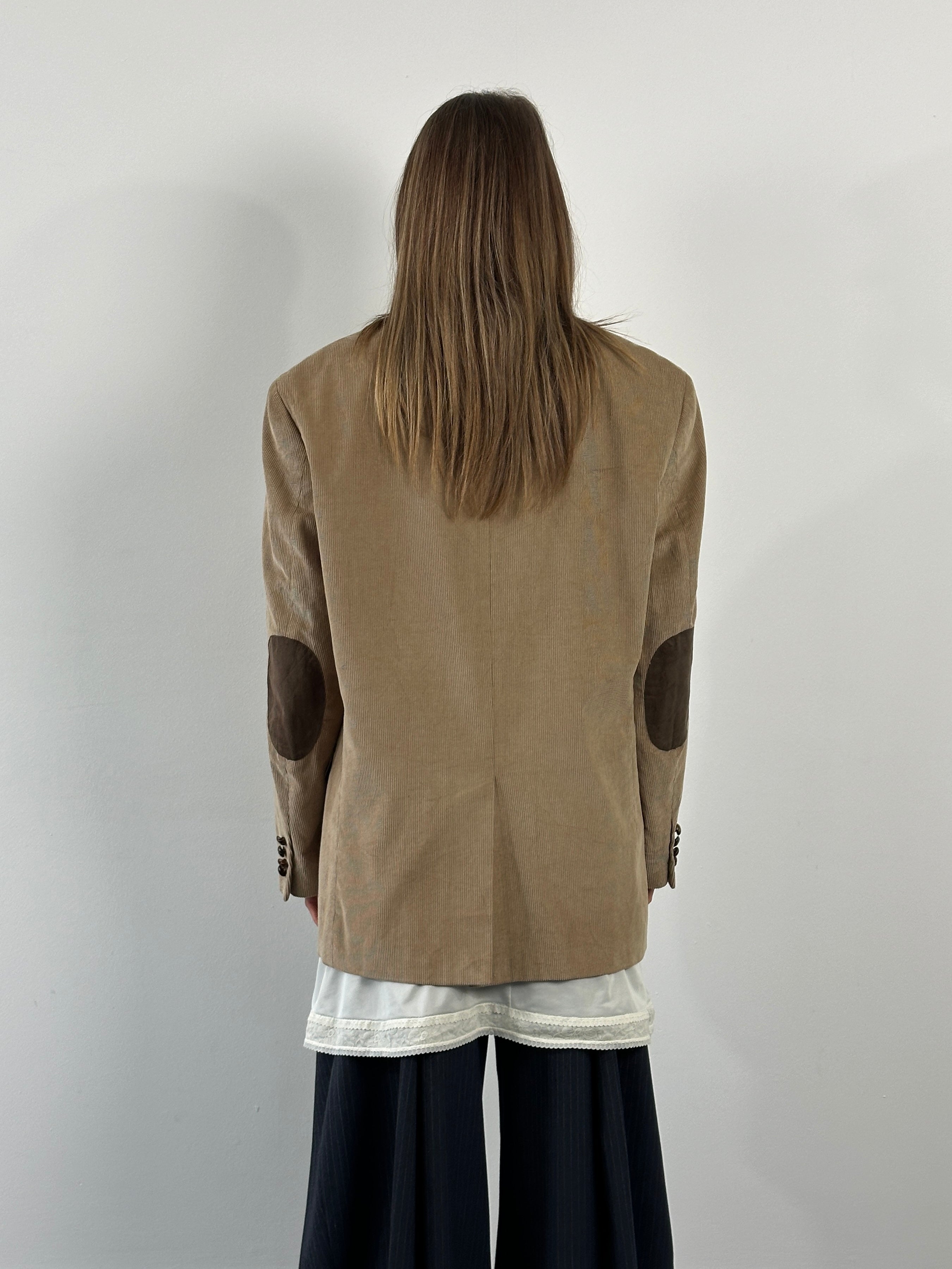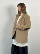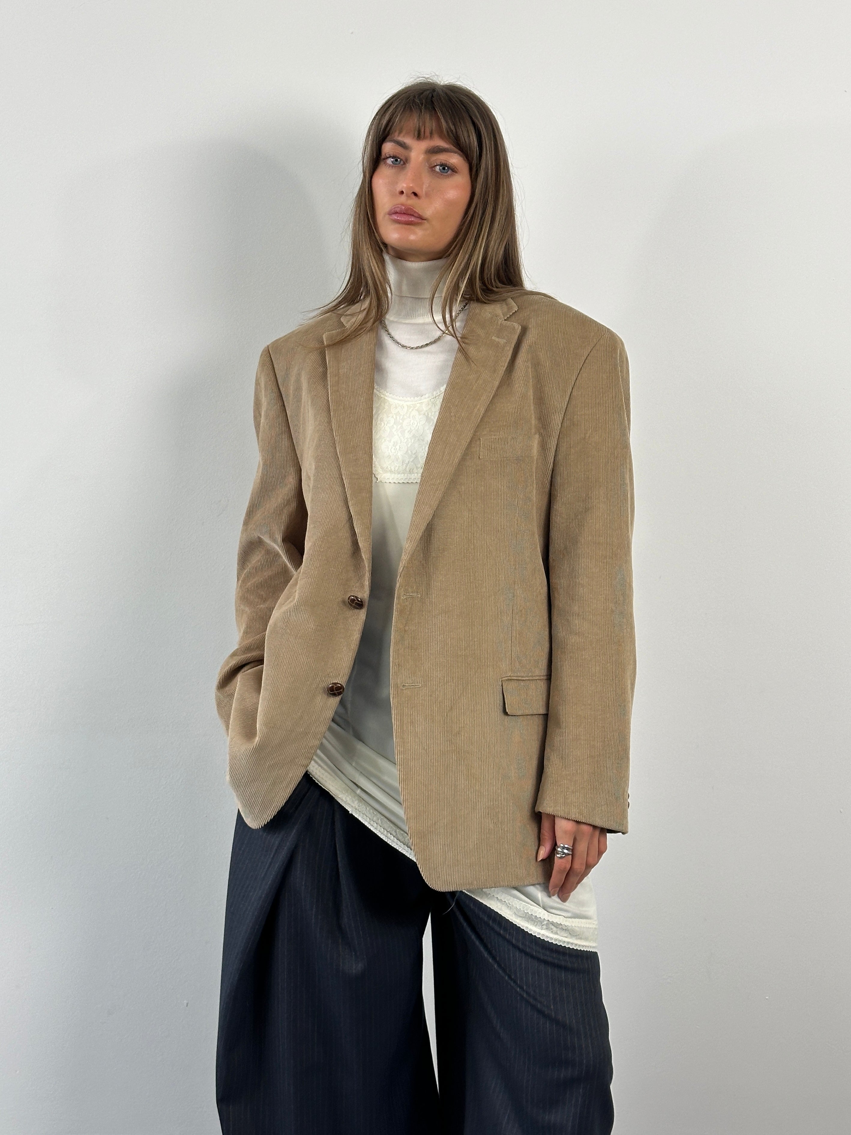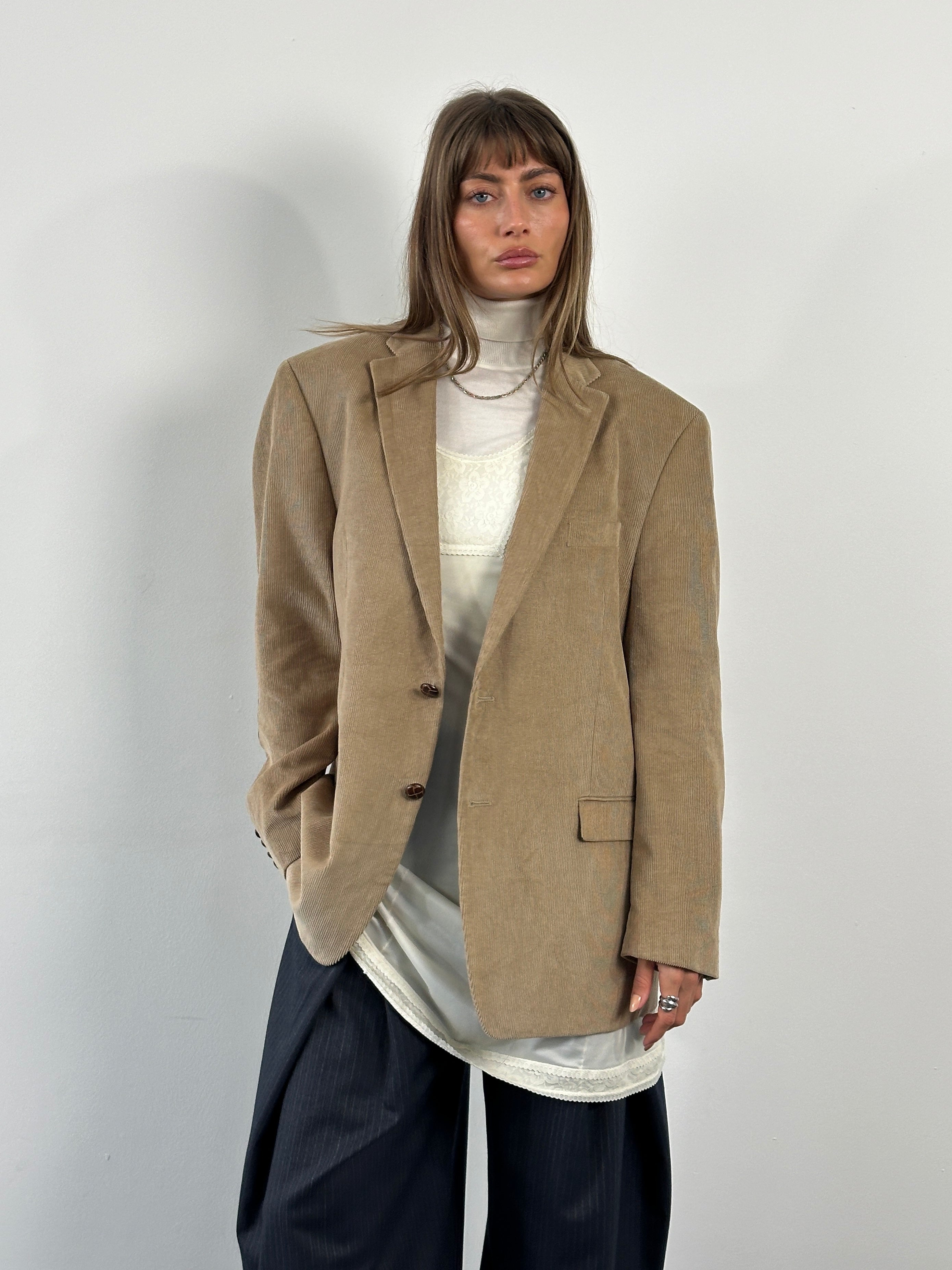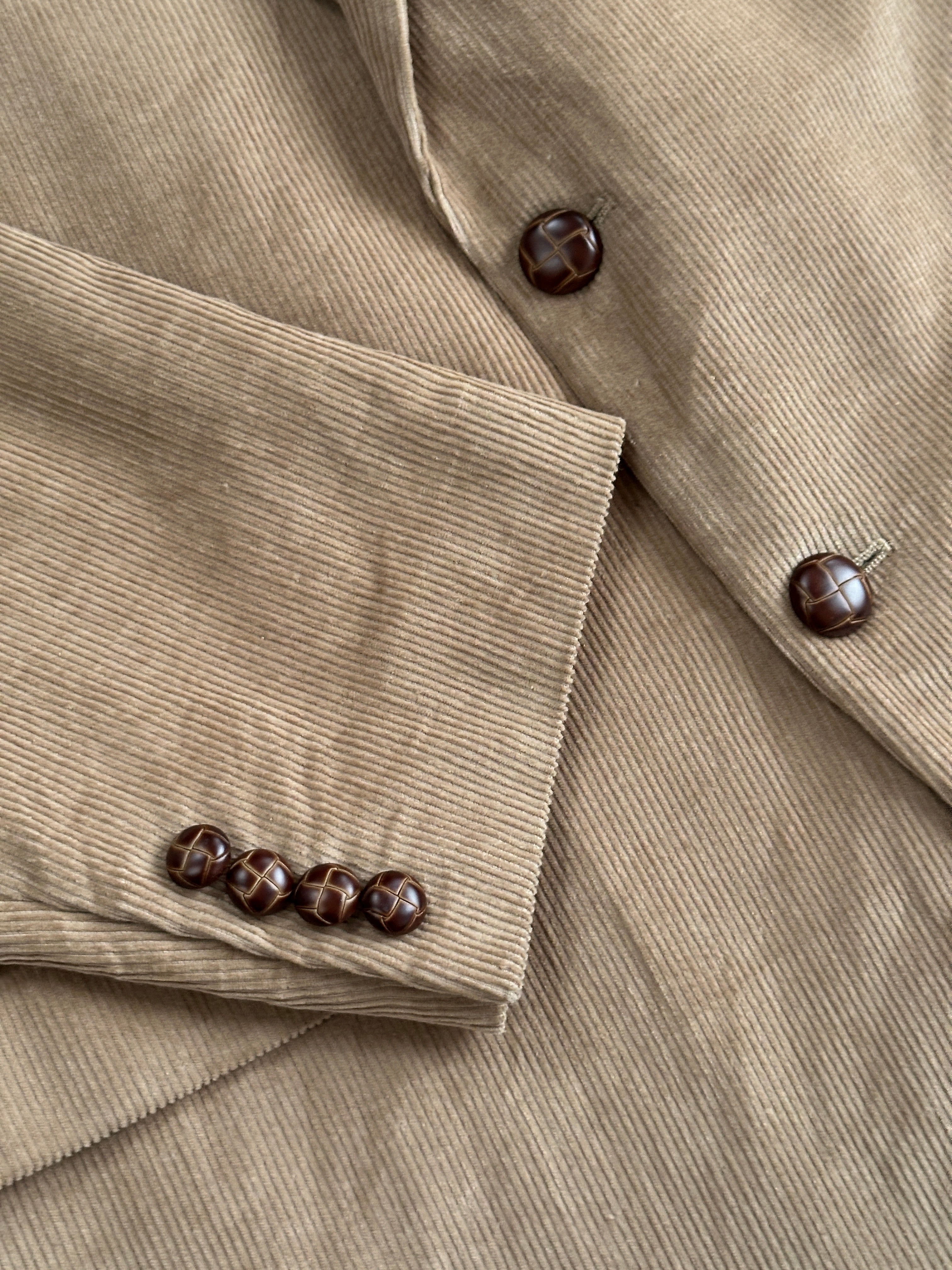 A vintage 2000s Chaps single breasted blazer in a soft beige corduroy with a patterned paisley lining. A relaxed tailored piece with classic proportions and subtle heritage detailing.