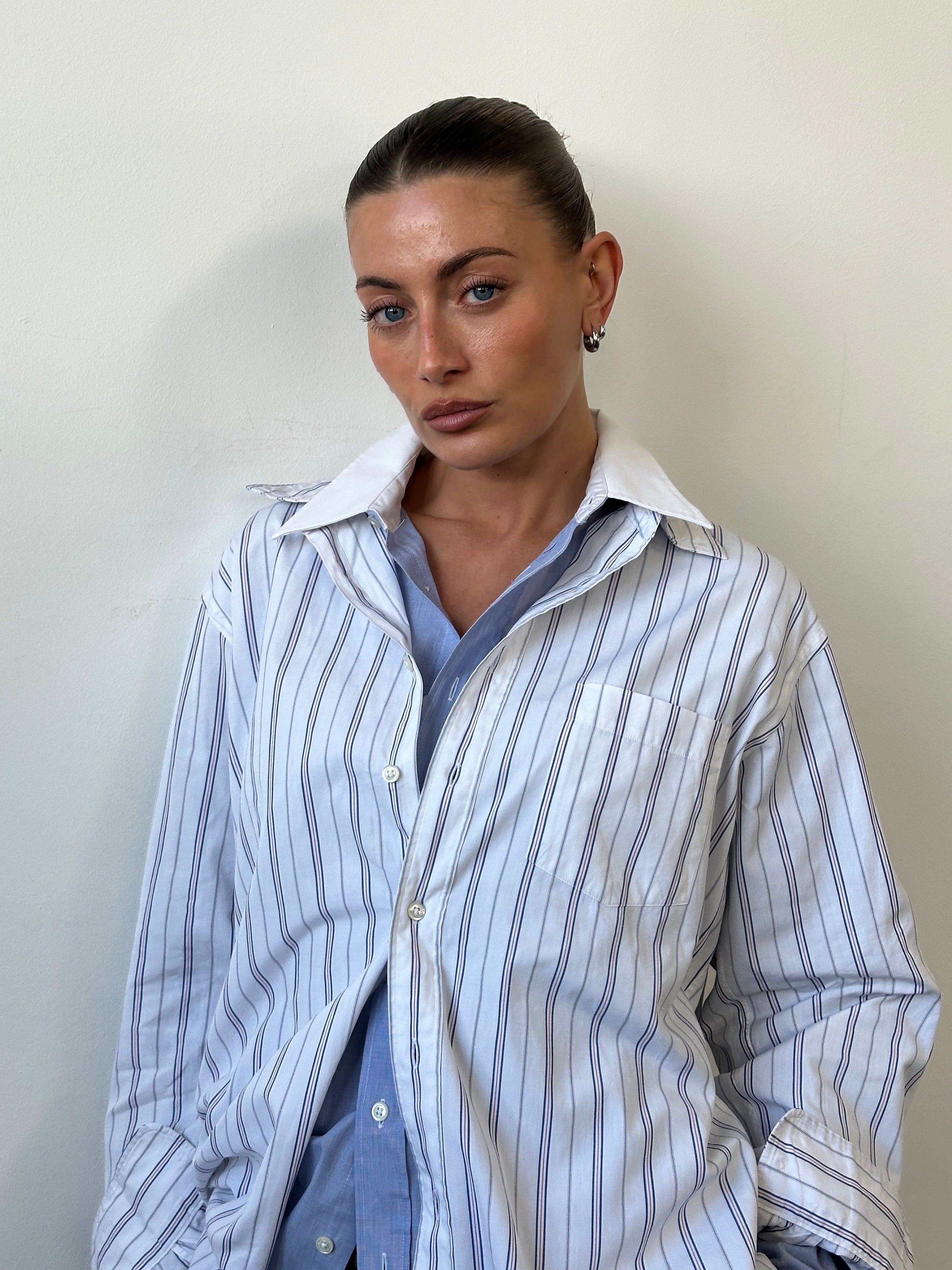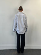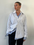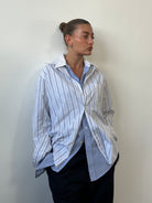 A white Christian Dior 1980s shirt crafted from pure cotton with fine vertical striping in soft blue and warm orange tones. Cut with a relaxed straight silhouette and finished with a chest pocket.