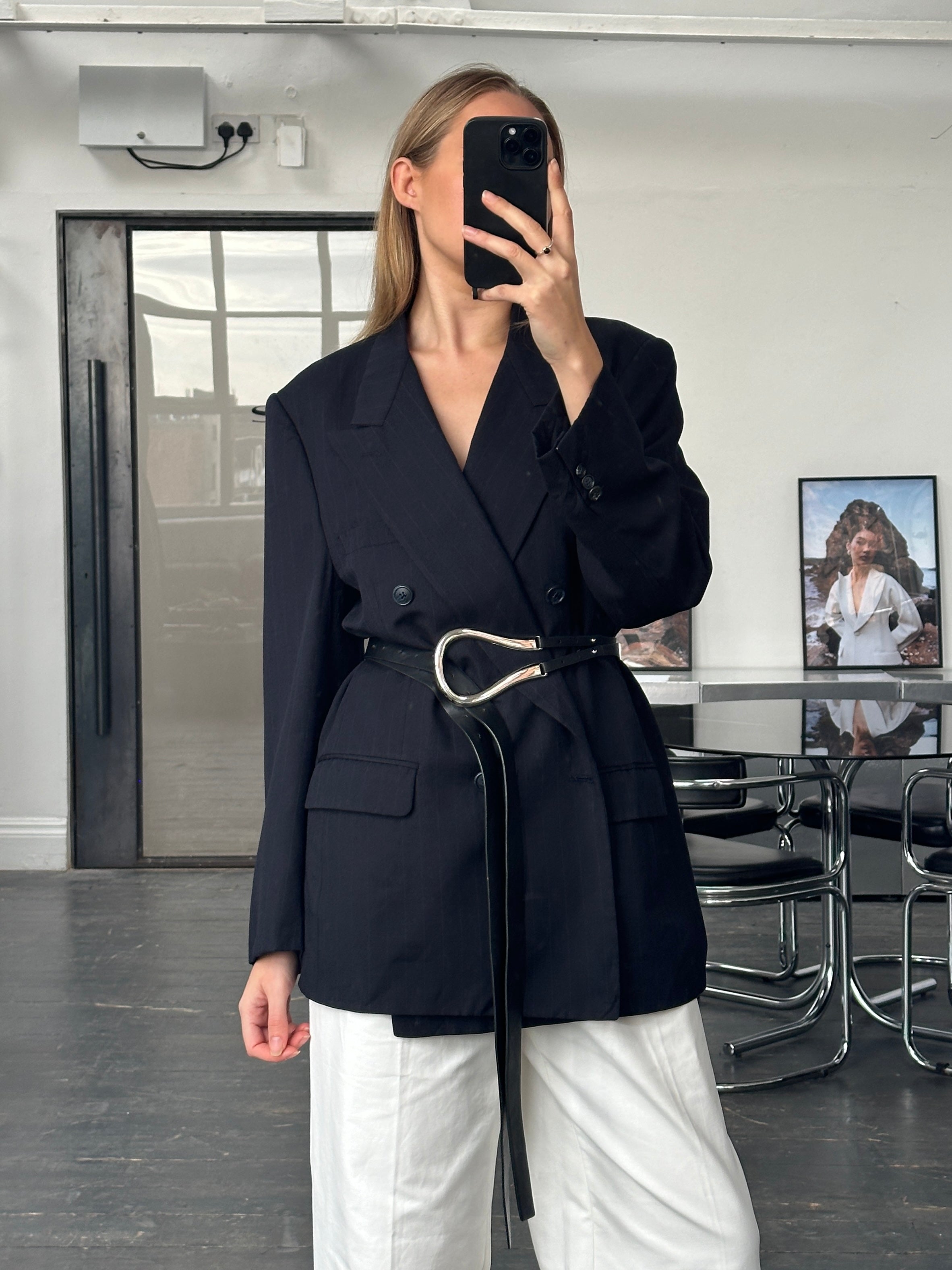 Vintage 1980s navy pinstripe Christian Dior Monsieur blazer in a double breasted cut with a structured silhouette and subtle sheen. Finished with classic peak lapels and a full CD-monogram lining for a refined tailored feel.