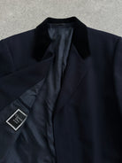 A refined vintage 1980s navy Christian Dior Monsieur overcoat with a concealed front placket and soft velvet trim at the collar. The silhouette is long and structured, finished with a smooth CD-monogram satin lining.