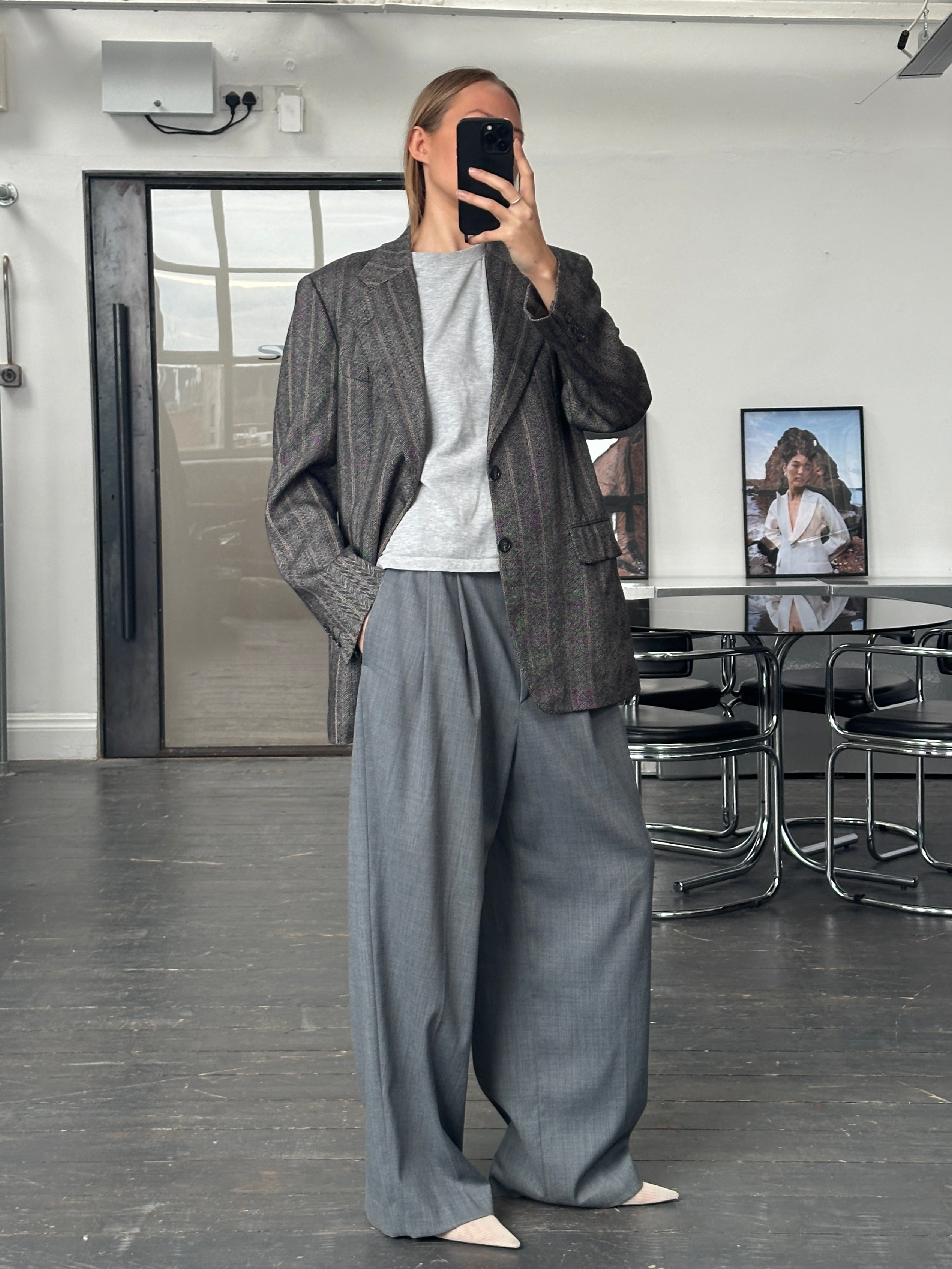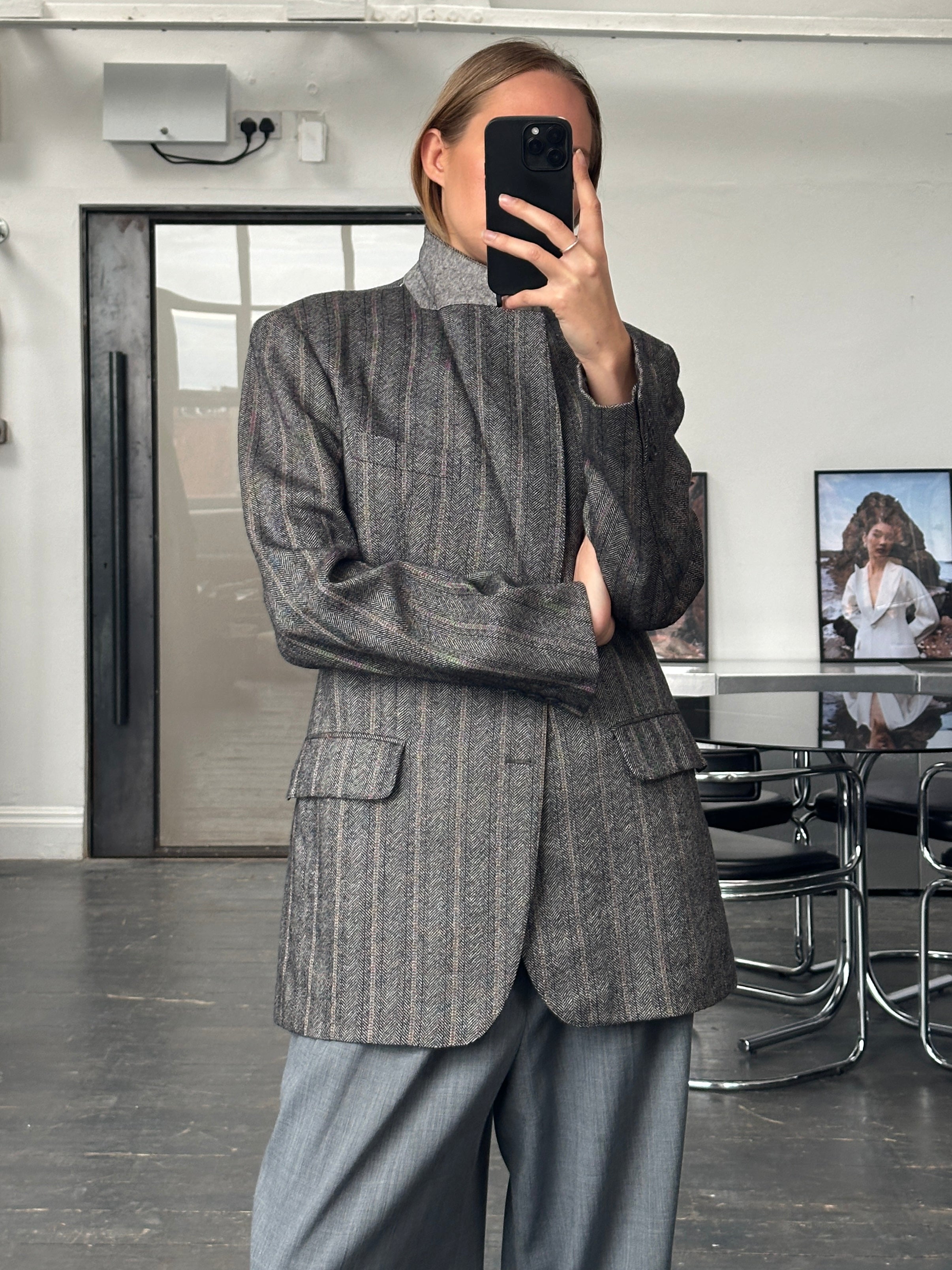 Vintage grey tone Christian Dior Monsieur Paris blazer featuring a subtle herringbone tweed effect with a fine orange stripe running through the weave. Finished with a two button front and full CD monogram lining for a refined tailored look.