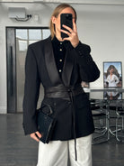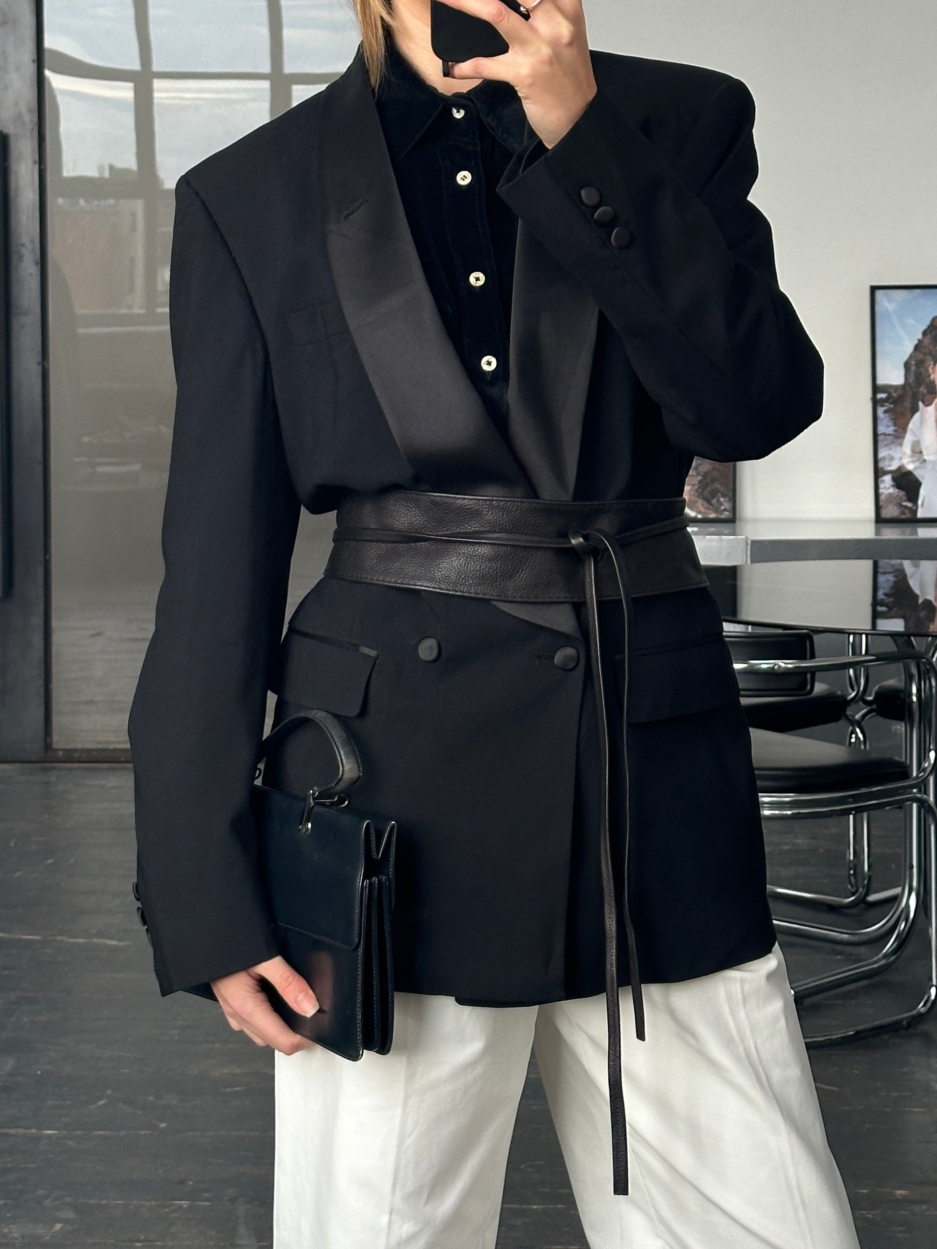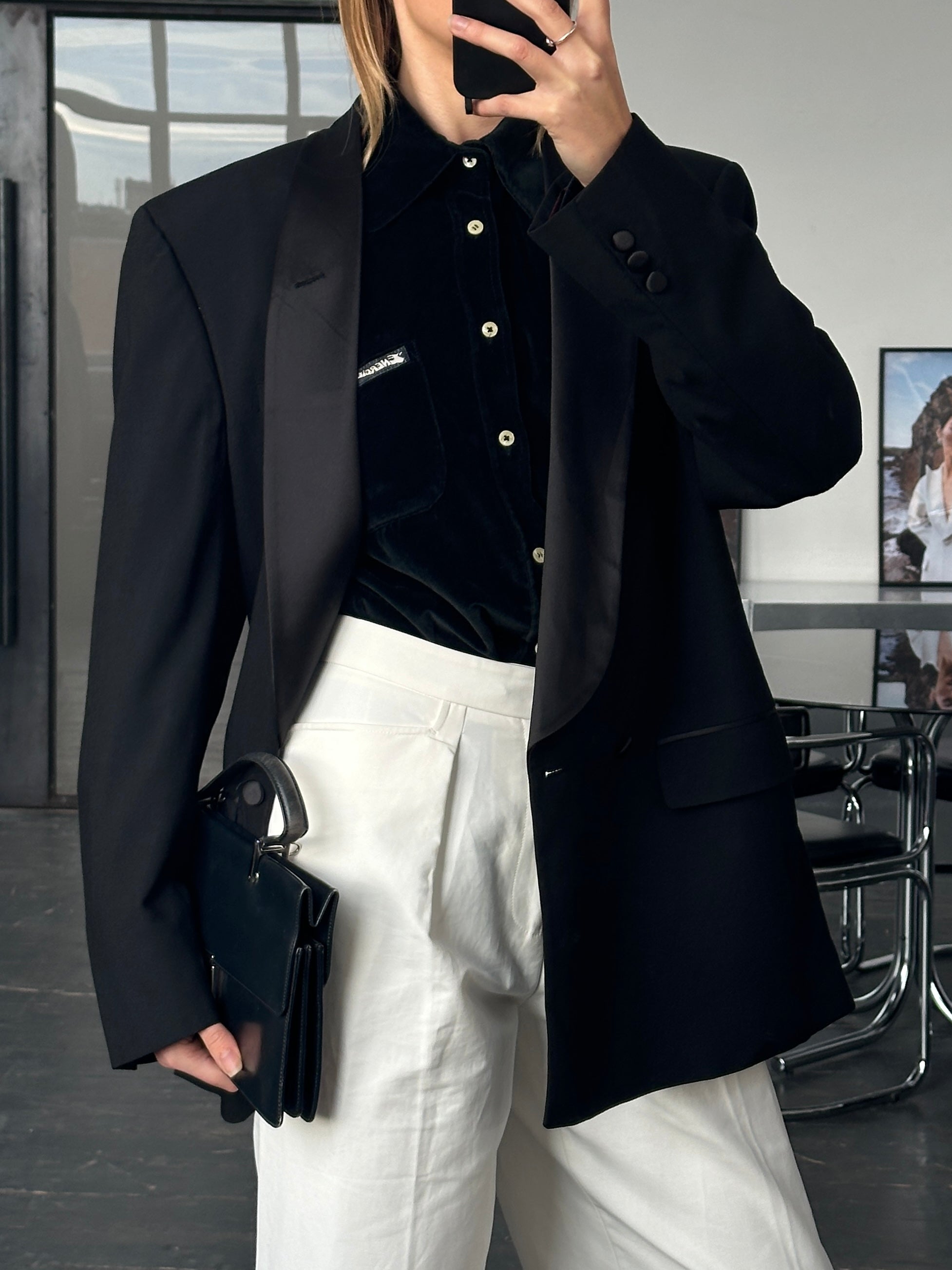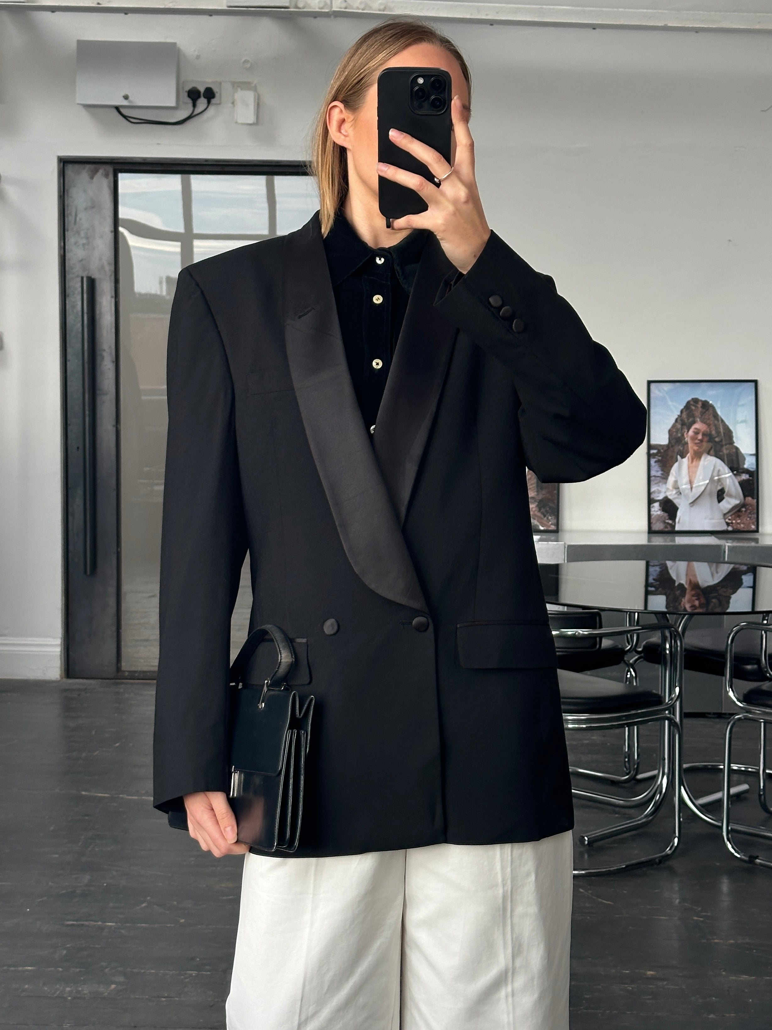 Vintage 1980s classic black Christian Dior Monsieur tuxedo blazer with a smooth satin shawl lapel and structured tailored silhouette. Crafted in pure wool with a clean, minimal shape and refined finish.