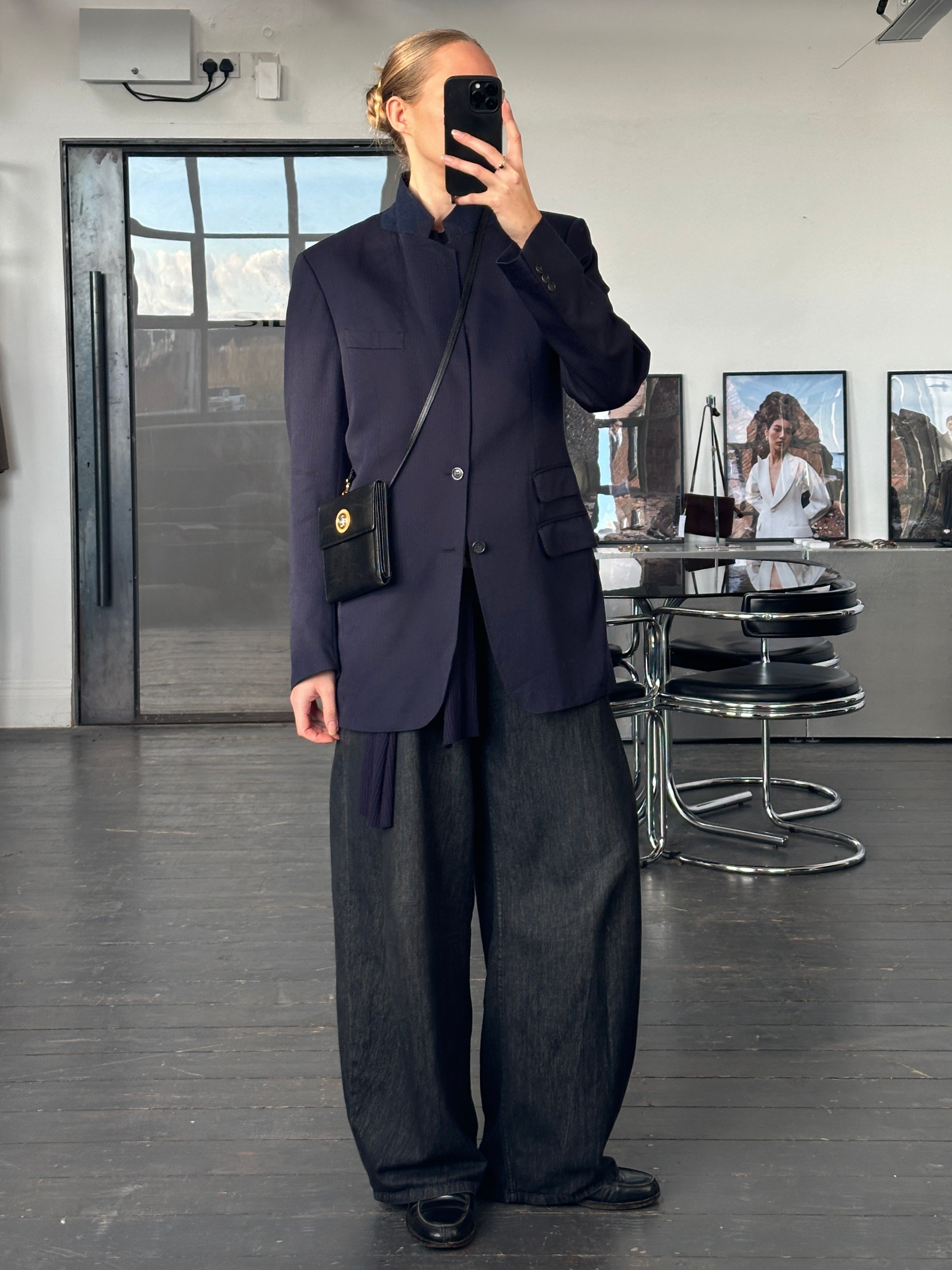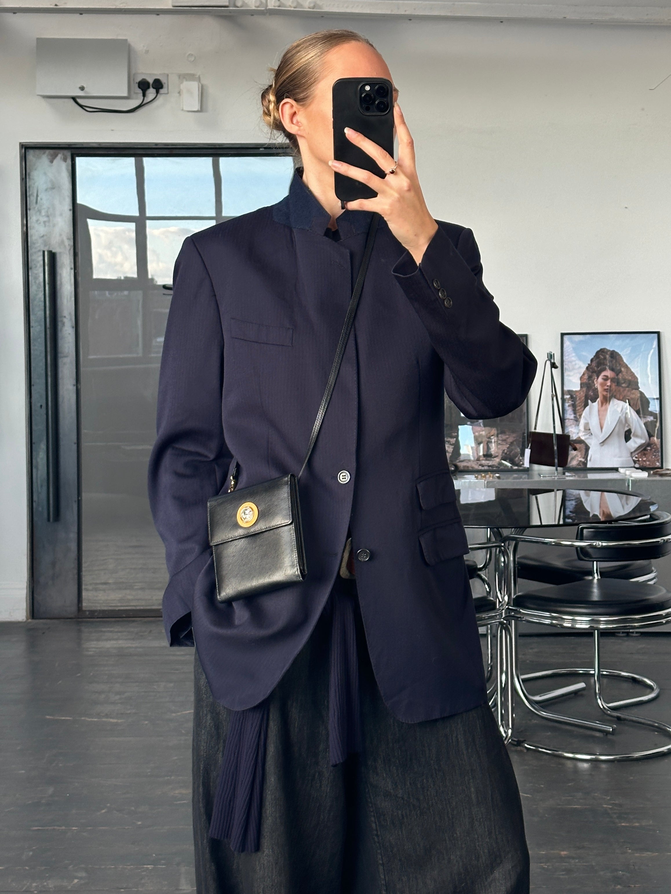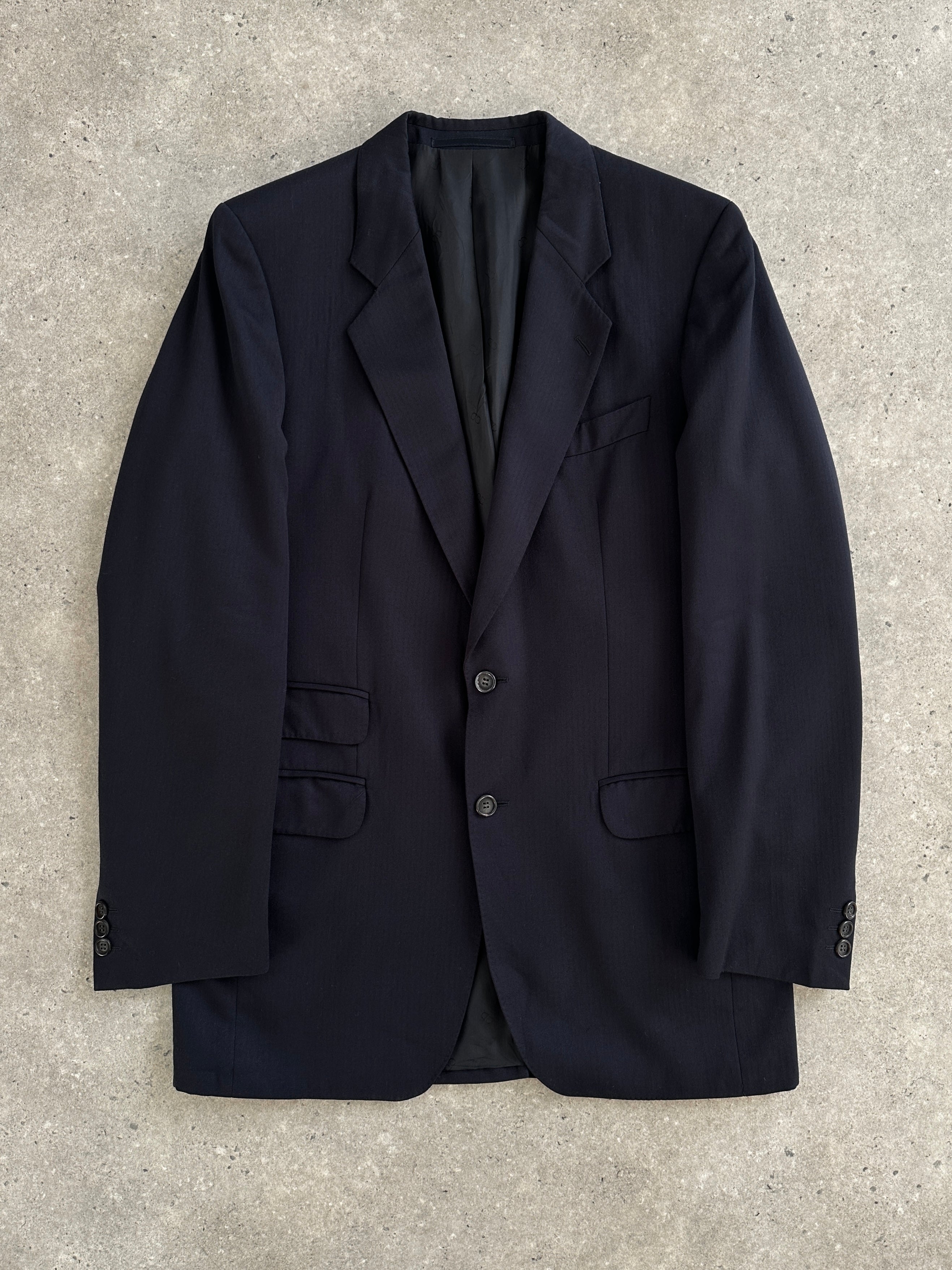 Vintage navy pure wool Christian Dior Monsieur 1990s single breasted blazer in a clean, structured cut with a subtle woven texture. Finished with a two button front and full viscose lining for an elevated tailored feel.