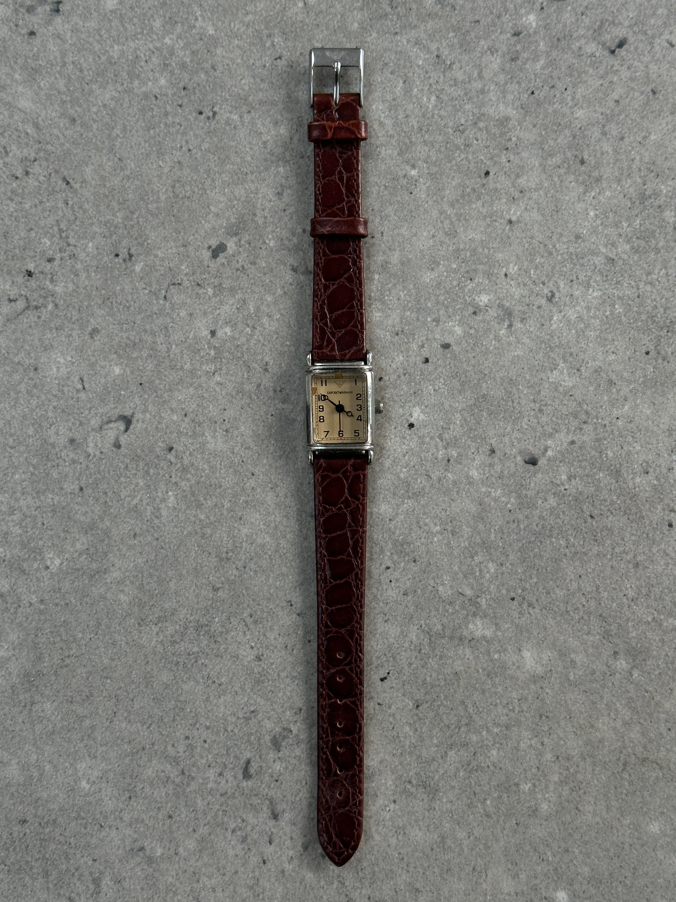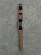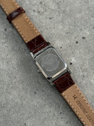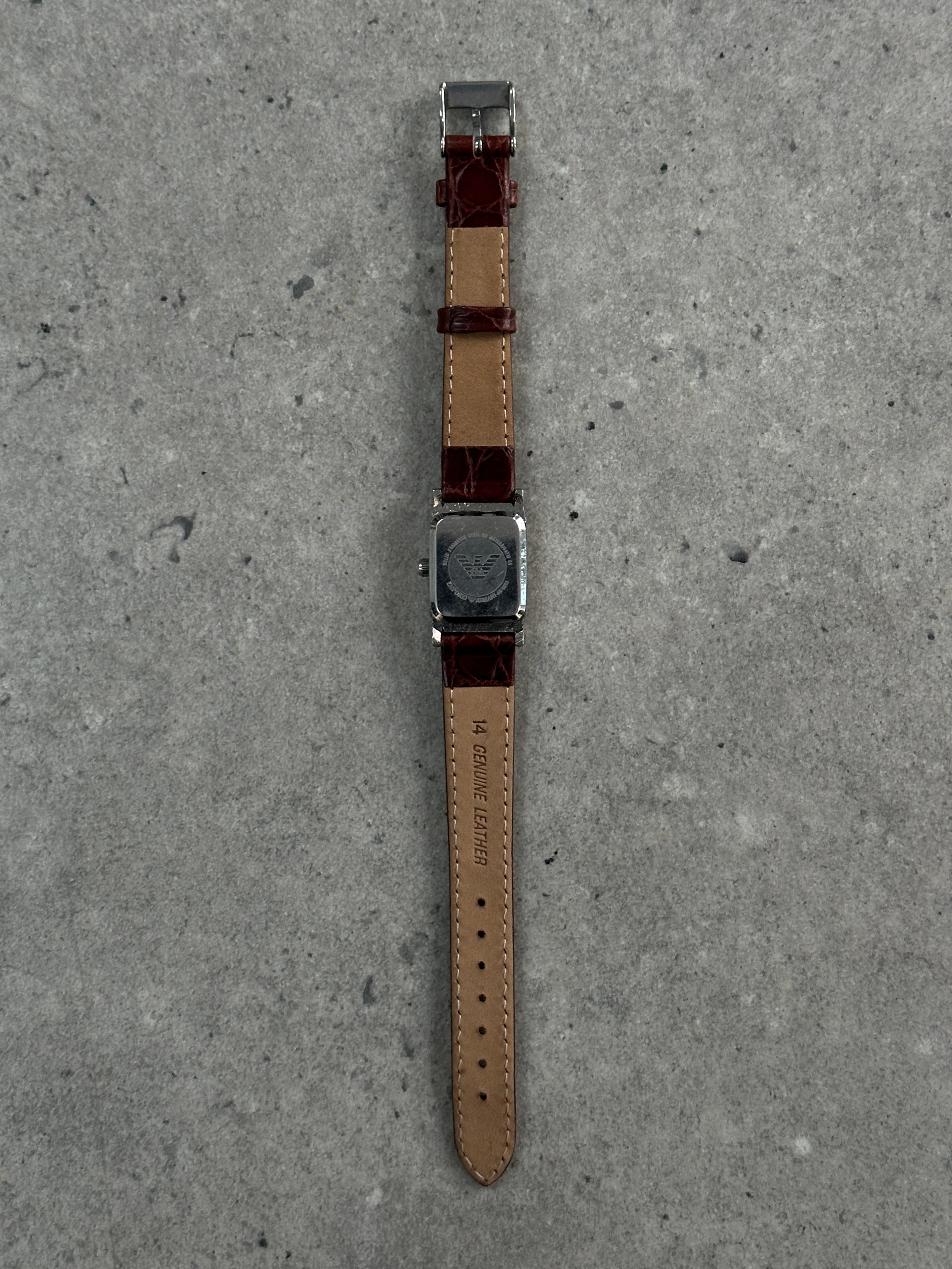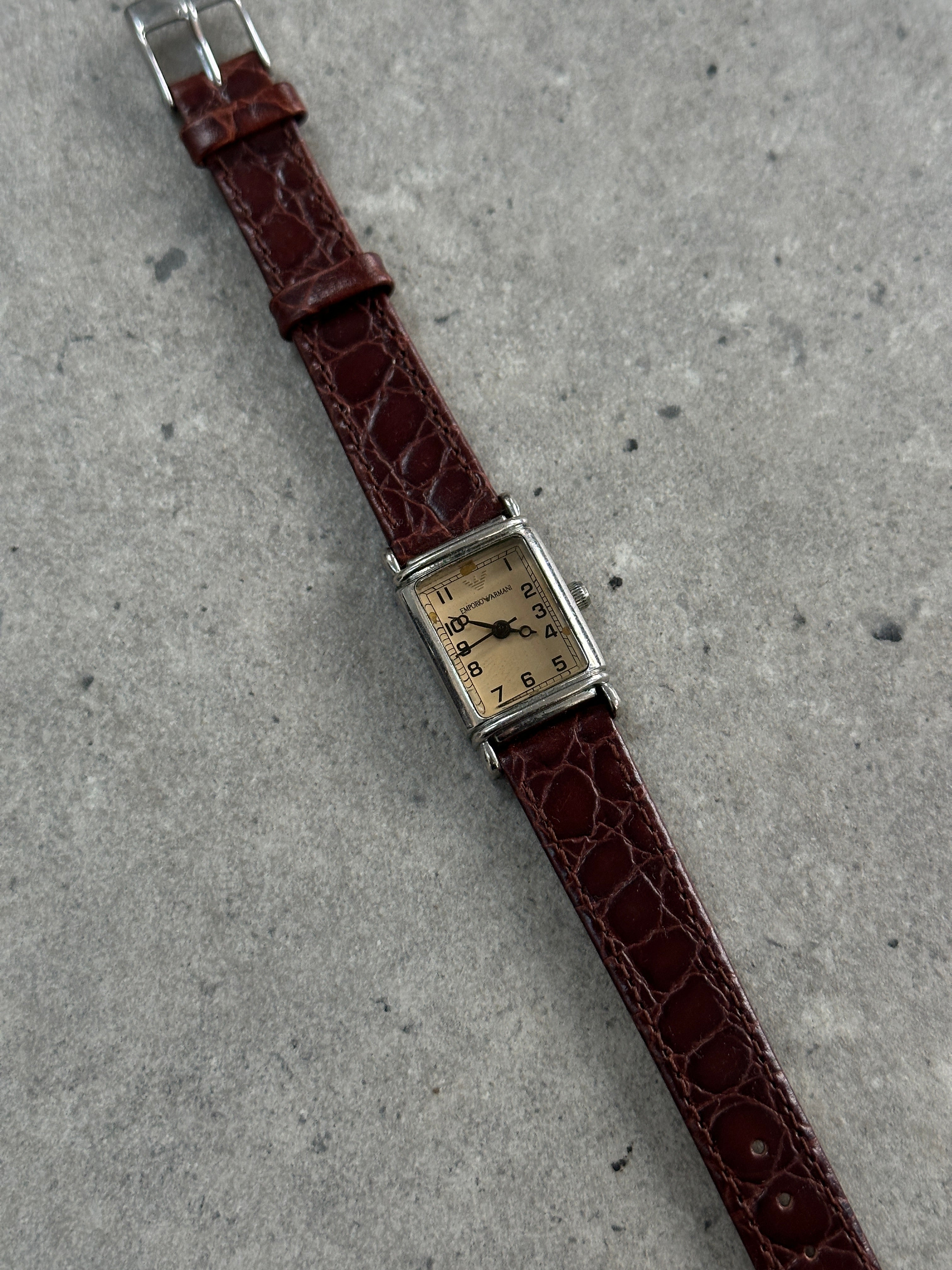 Brown leather strap watch from the 1990s Emporio Armani era featuring a rectangular cream dial with black numerals, stainless steel case and the classic eagle motif. Minimal refined styling with a quiet luxury feel.