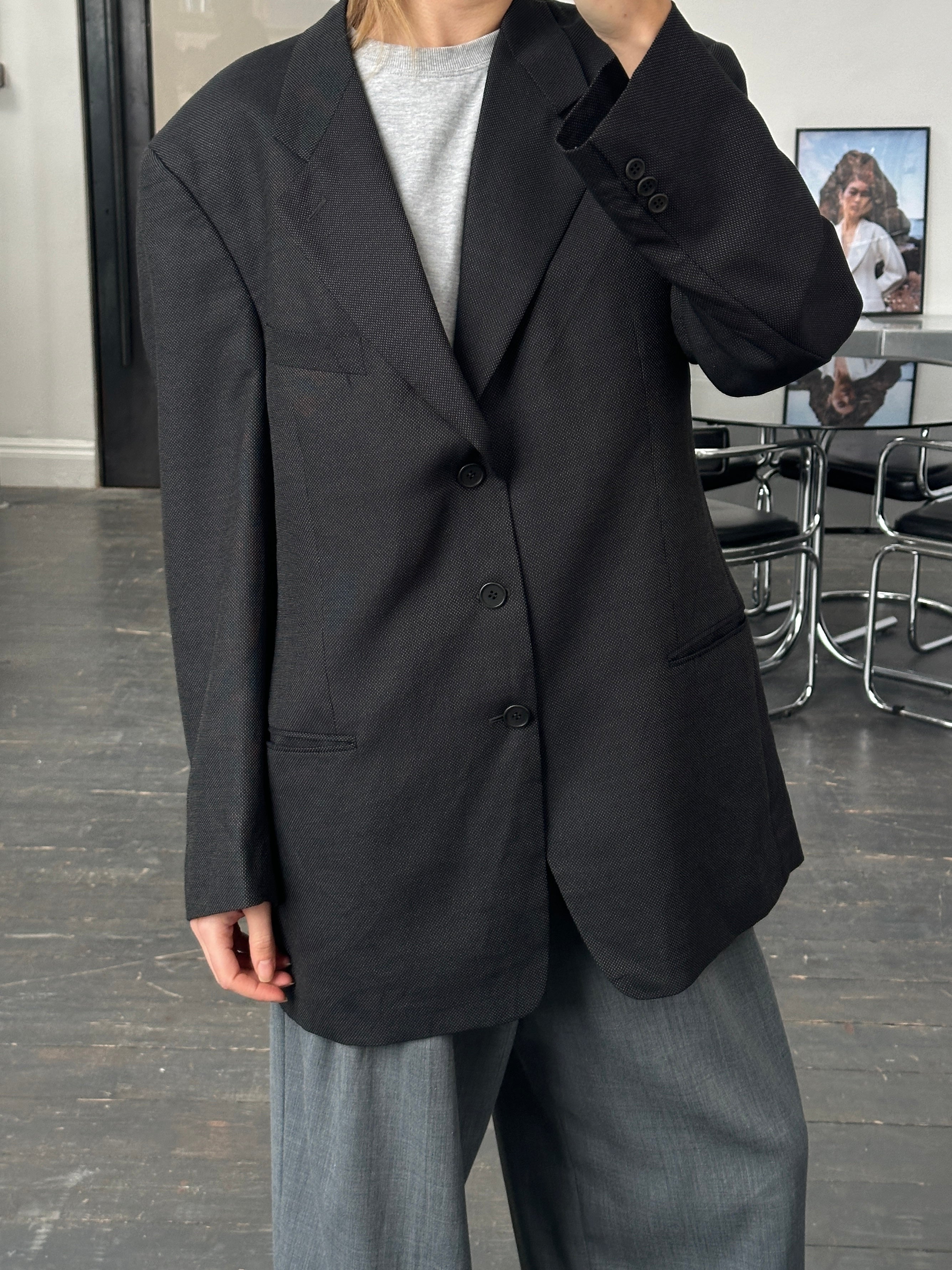 Vintage dark grey Giorgio Armani blazer from the 1990s featuring a subtle woven texture and a clean tailored structure. A minimal and refined piece typical of Giorgio Armani’s quiet luxury era.