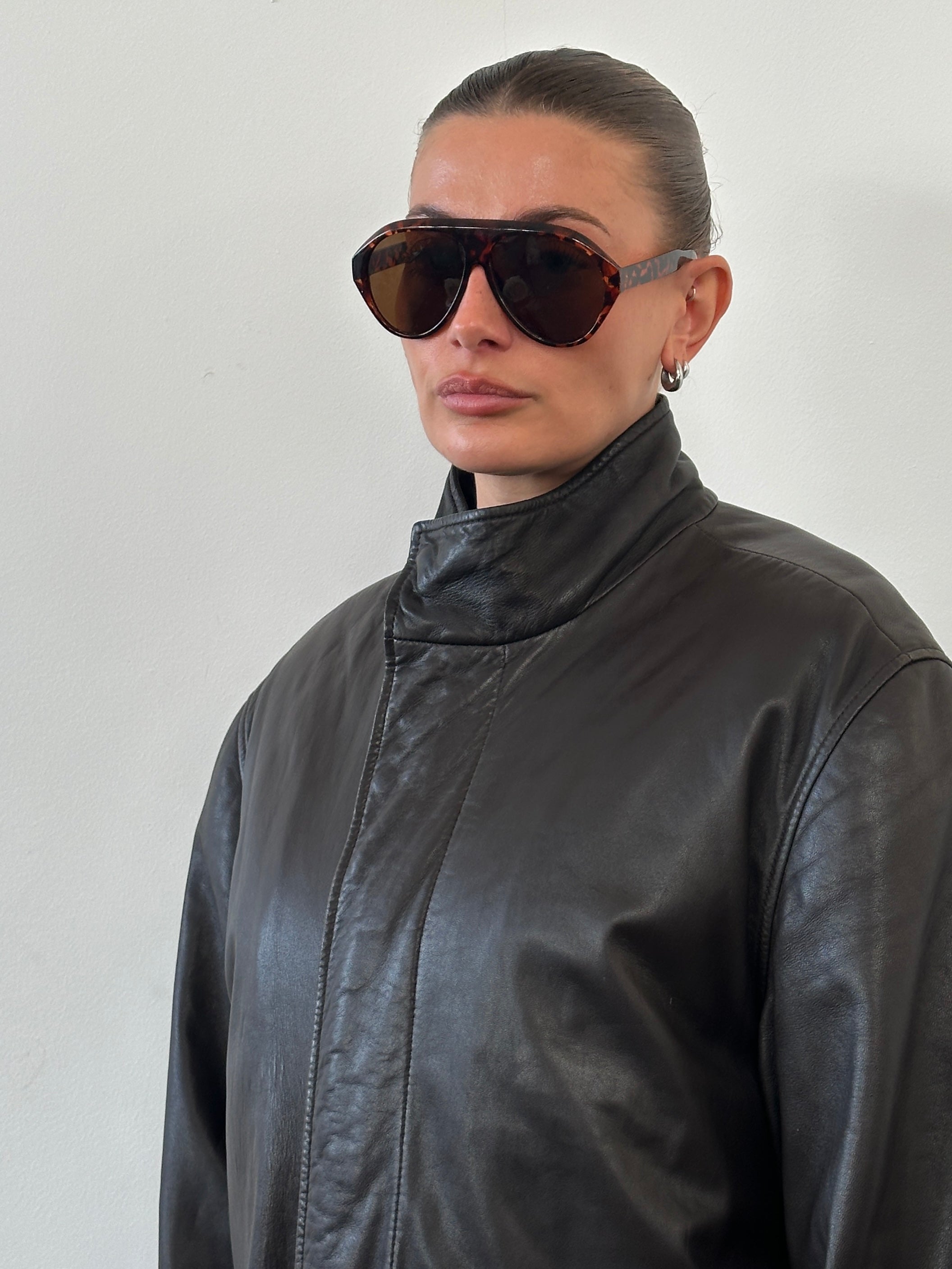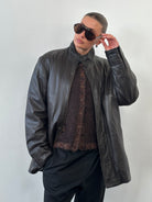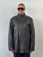 A vintage soft leather jacket by Jaeger in a rich brown tone, designed with a clean concealed placket and a structured high neckline. Cut with a relaxed yet refined silhouette, this piece reflects understated 1990s tailoring with a quiet luxury finish.