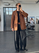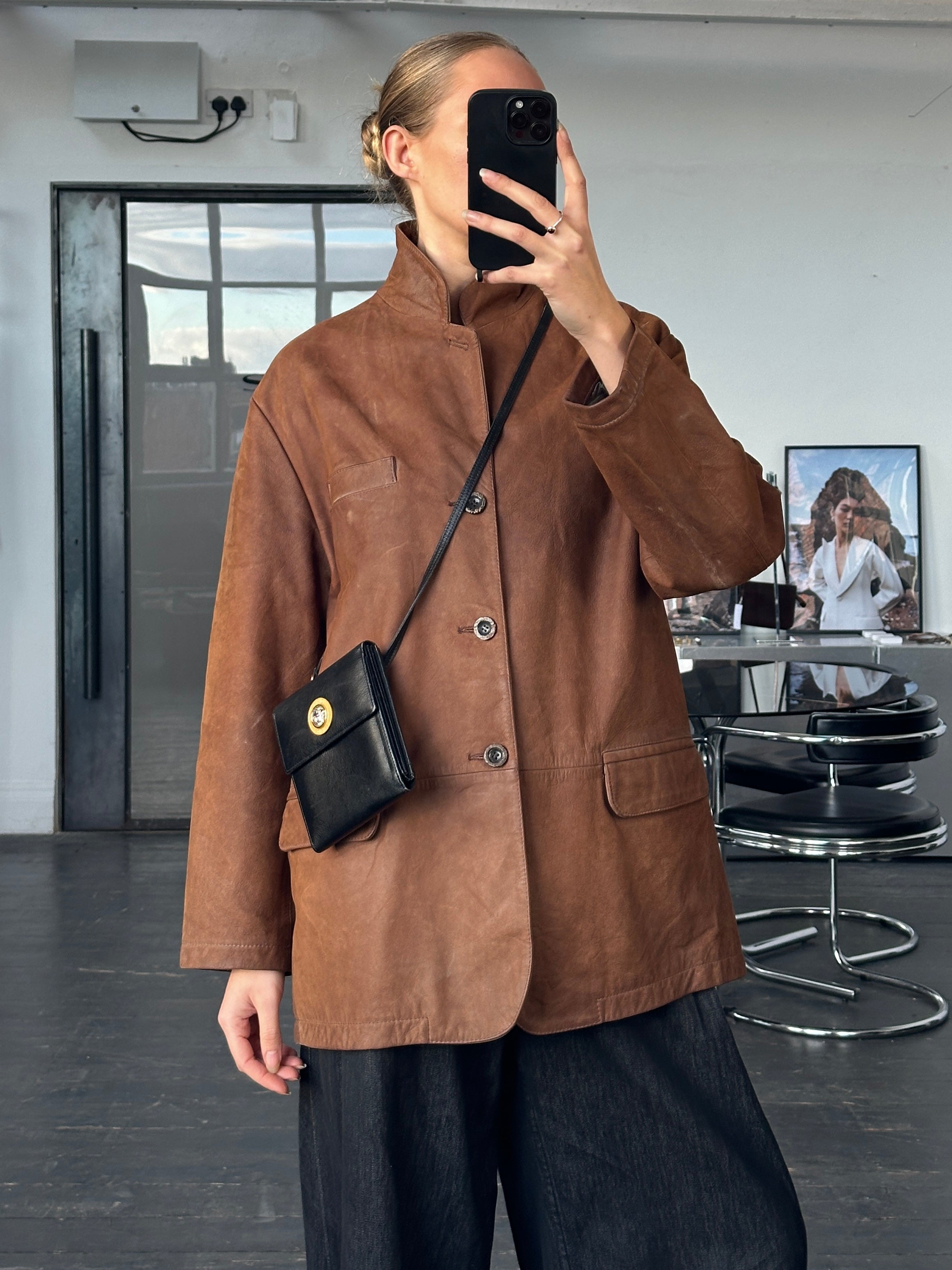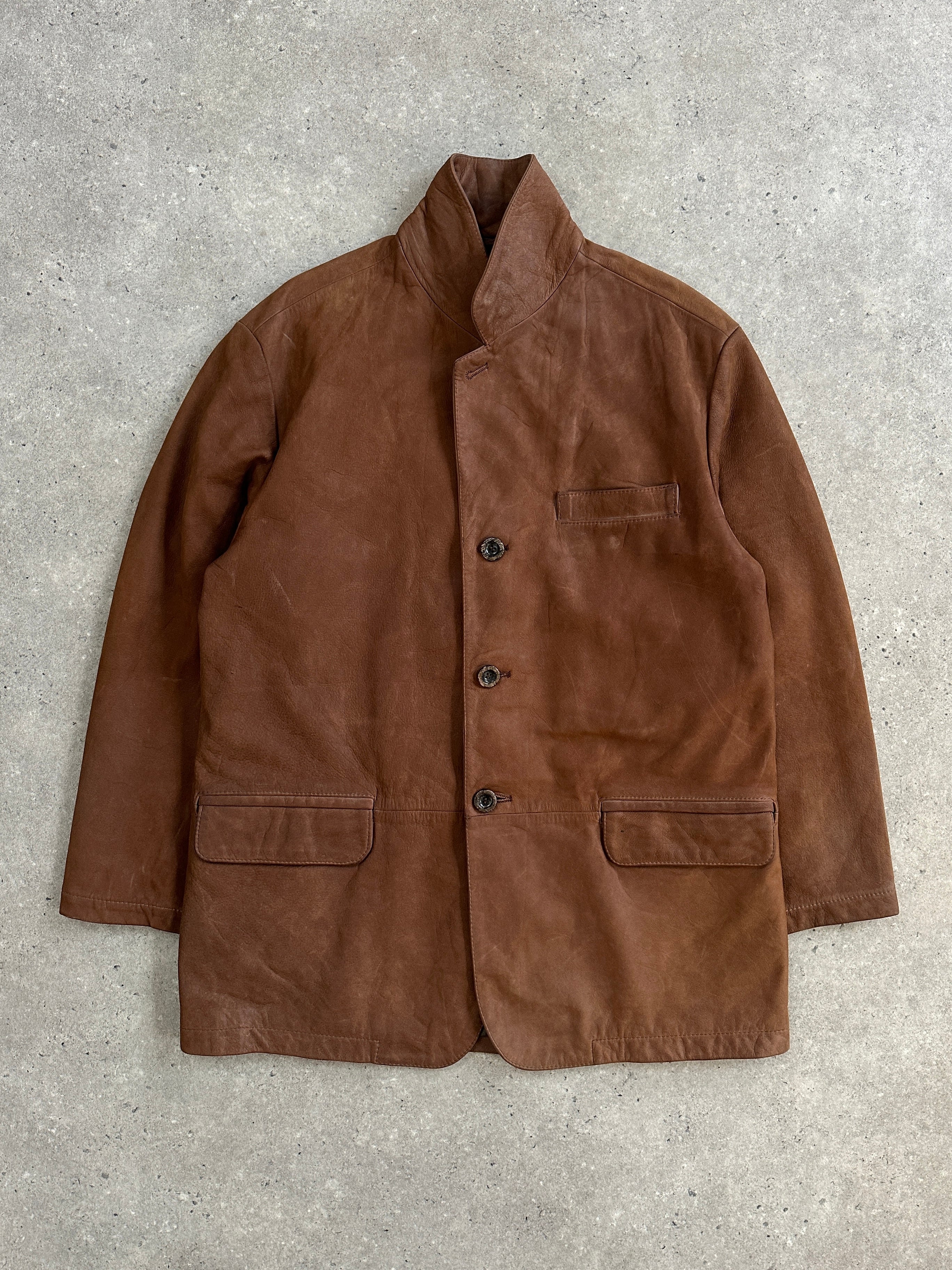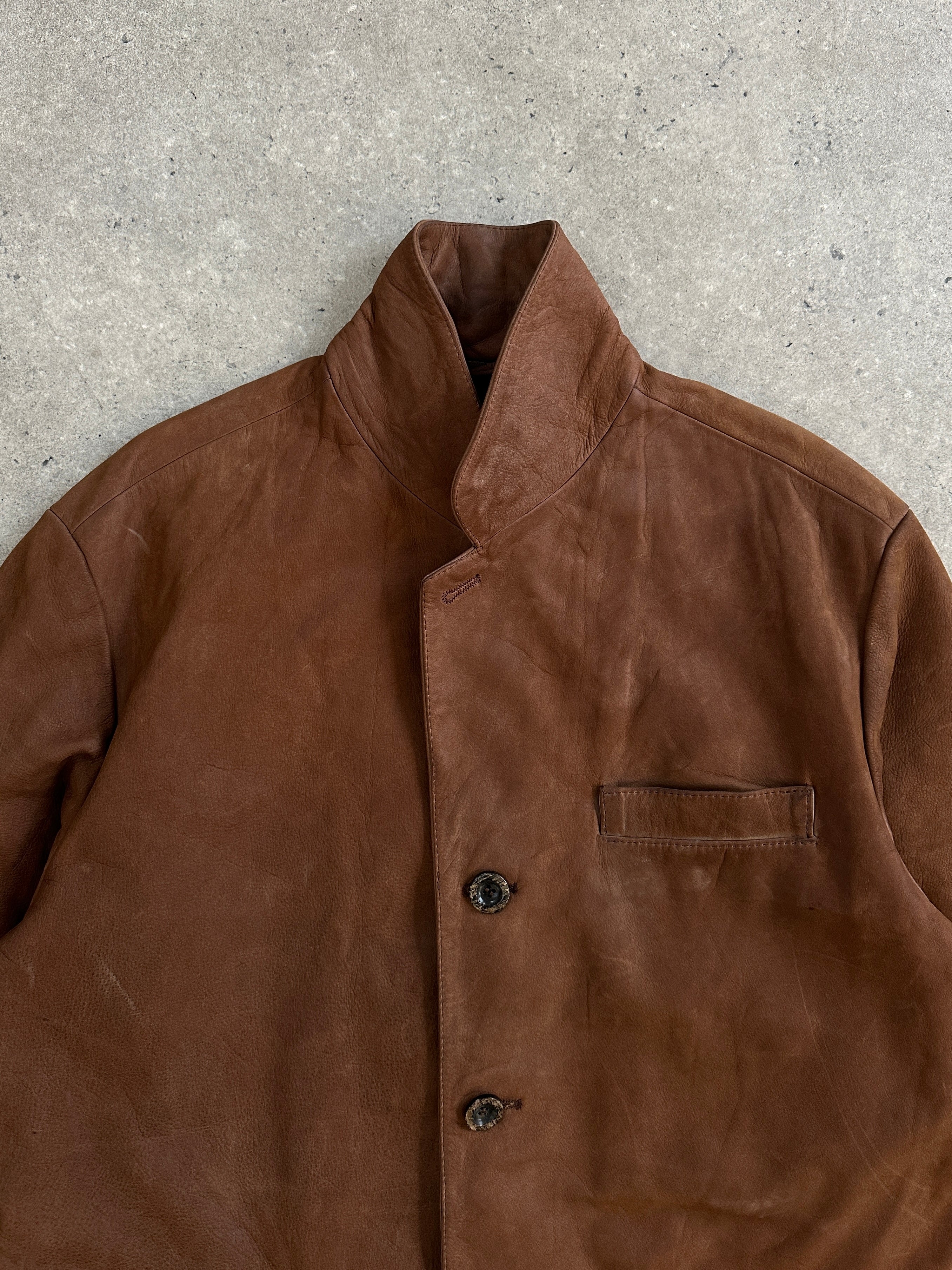 Vintage soft tan brown cowhide leather jacket from Marlboro Classics with a relaxed structured cut and clean minimal detailing. A 1990s era piece with a worn-in, naturally aged surface that fits seamlessly into contemporary understated styling.