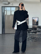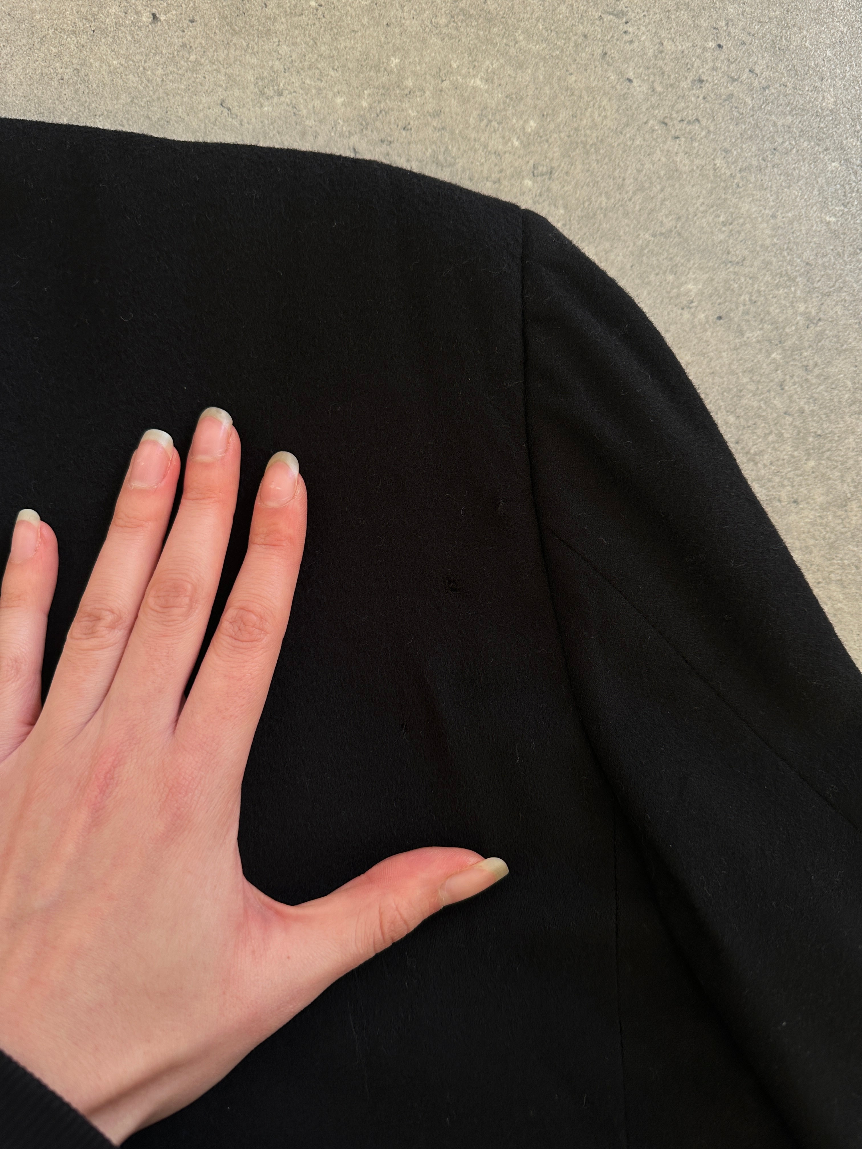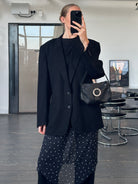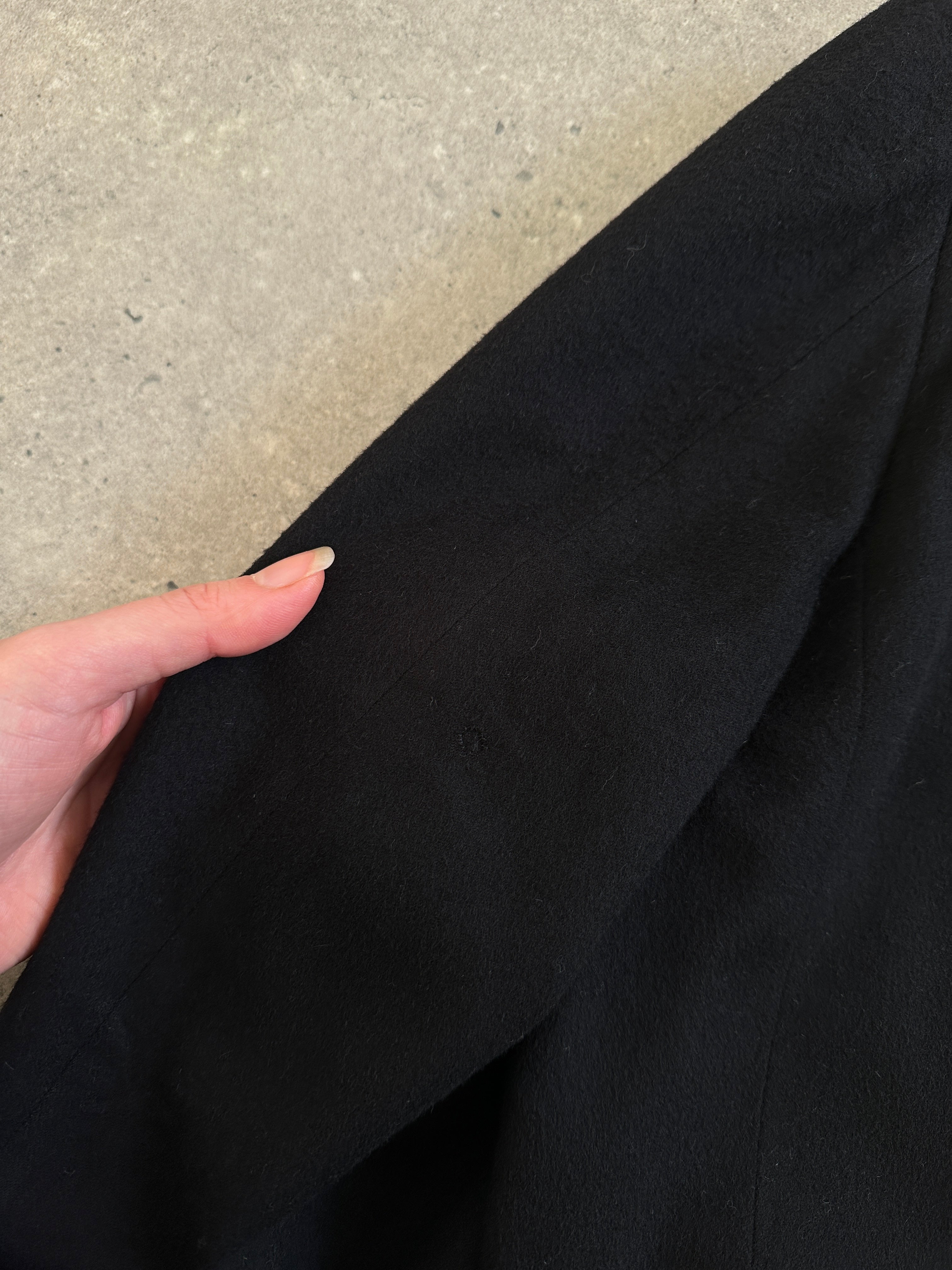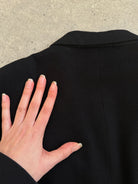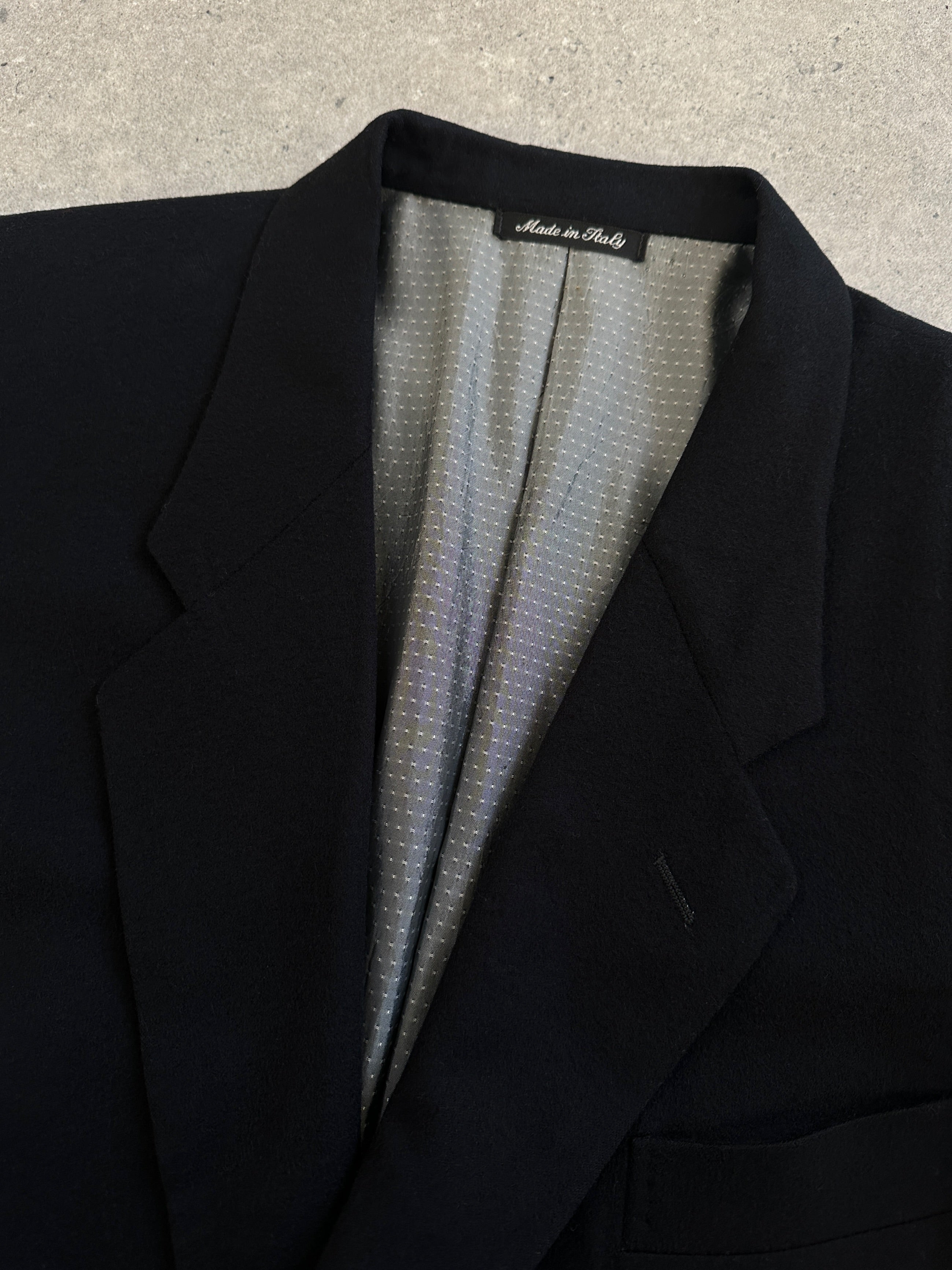 A vintage 1990s Pal Zileri single breasted blazer in black brushed Loro Piana wool with a subtle polka dot lining detail. A clean tailored silhouette that feels refined, understated and quietly luxurious.