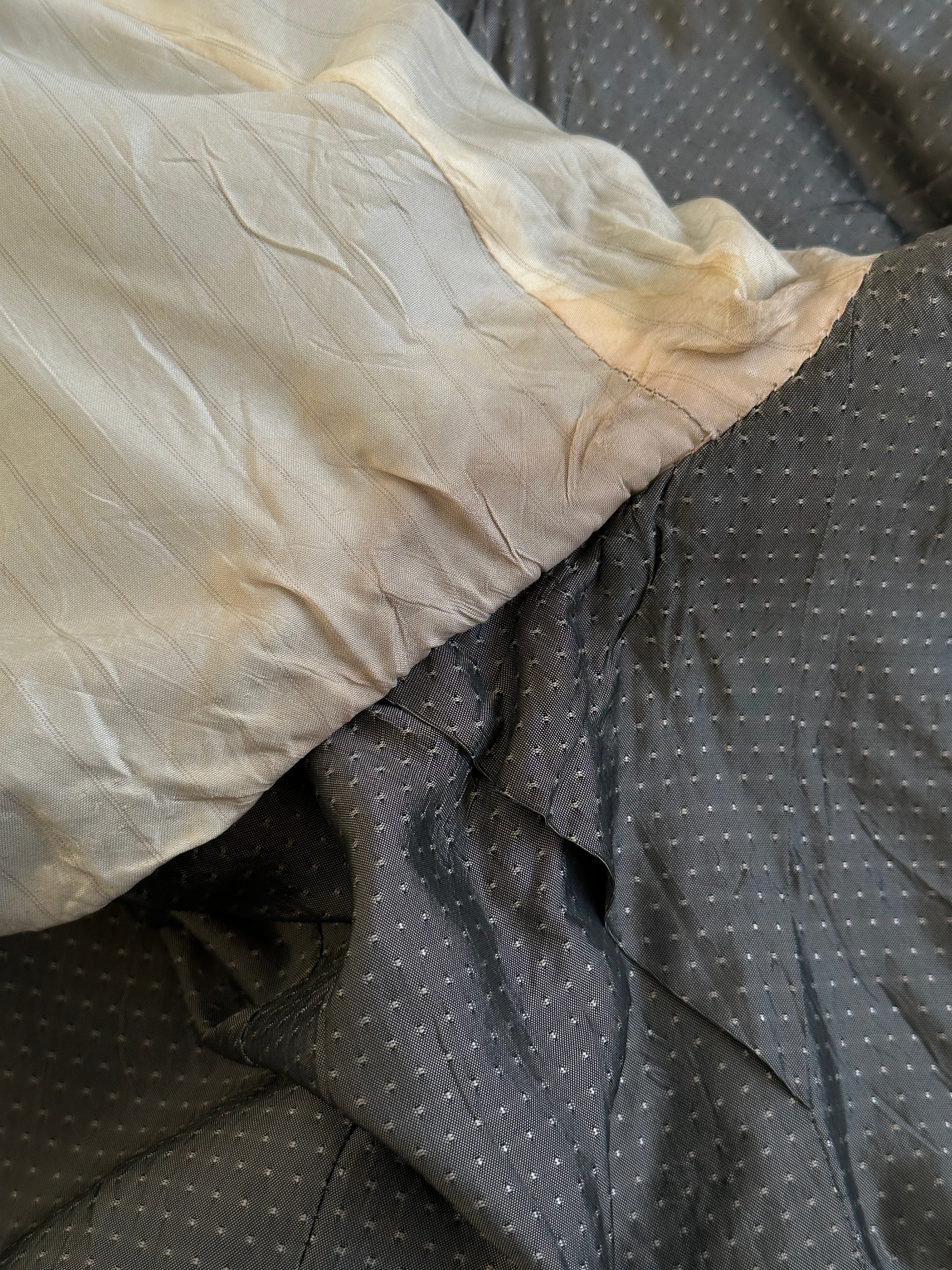 Fair - wear to fabric, including some small holes in back and lining, discolouration to lining underarms