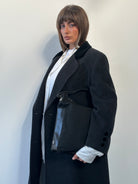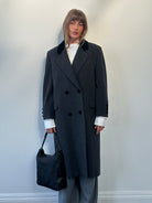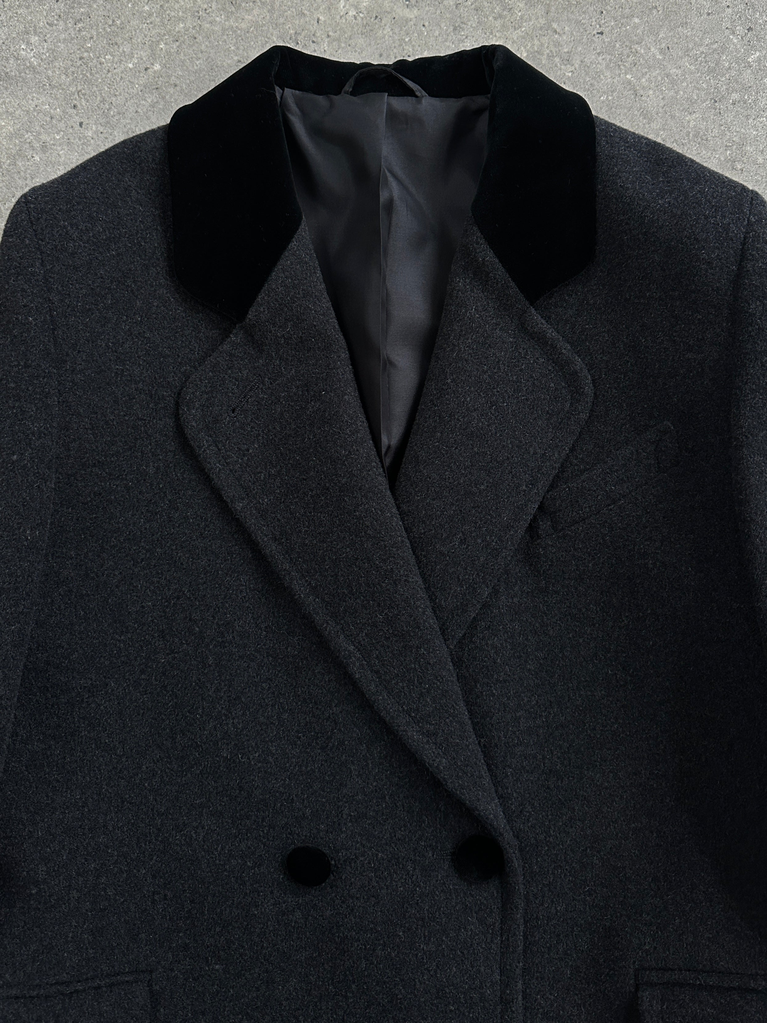 Vintage double breasted wool coat in a deep grey charcoal tone featuring a black velvet collar and matching velvet covered buttons. A refined 1990s St Michael piece with a clean minimal silhouette and structured lines.