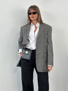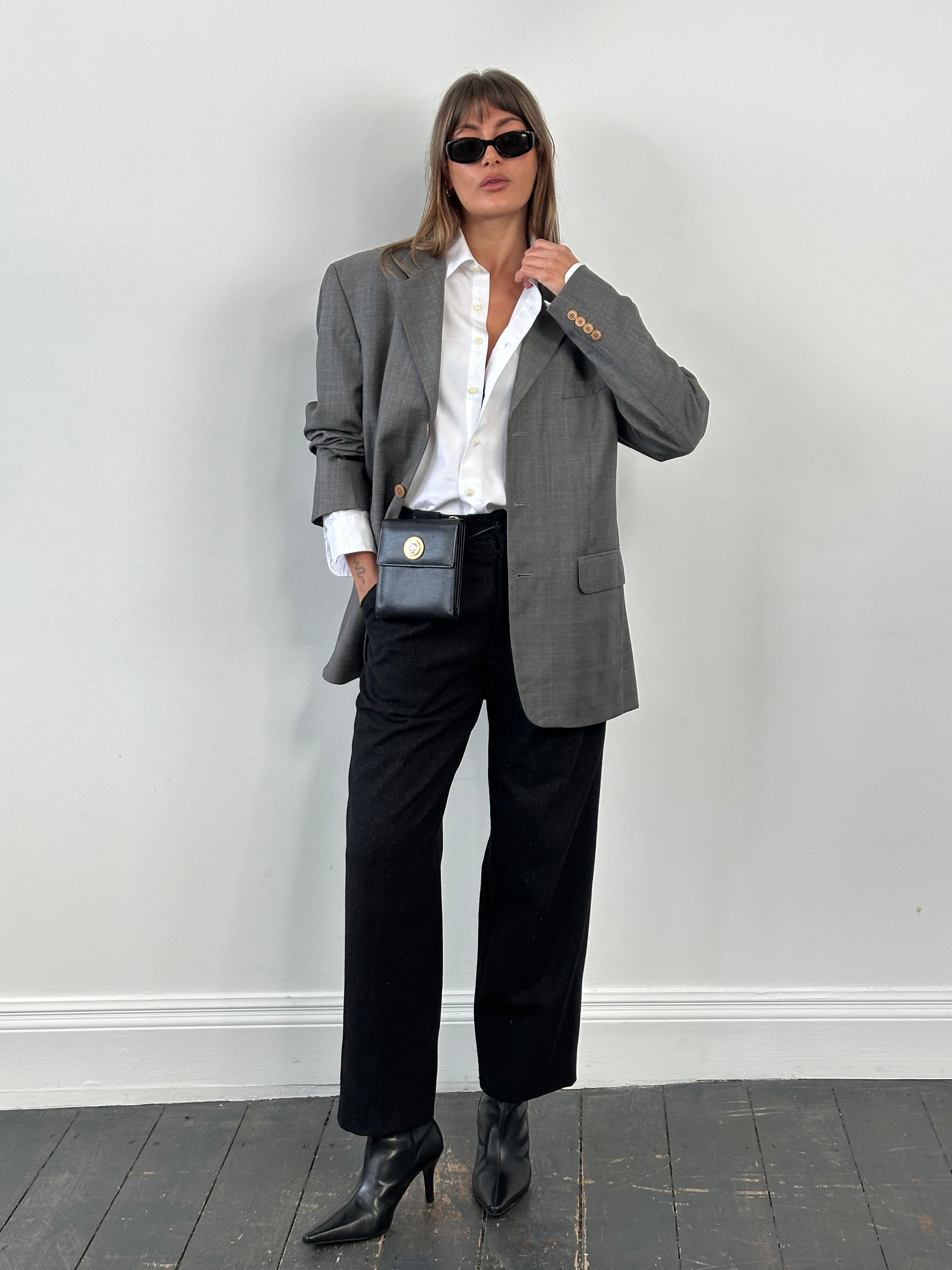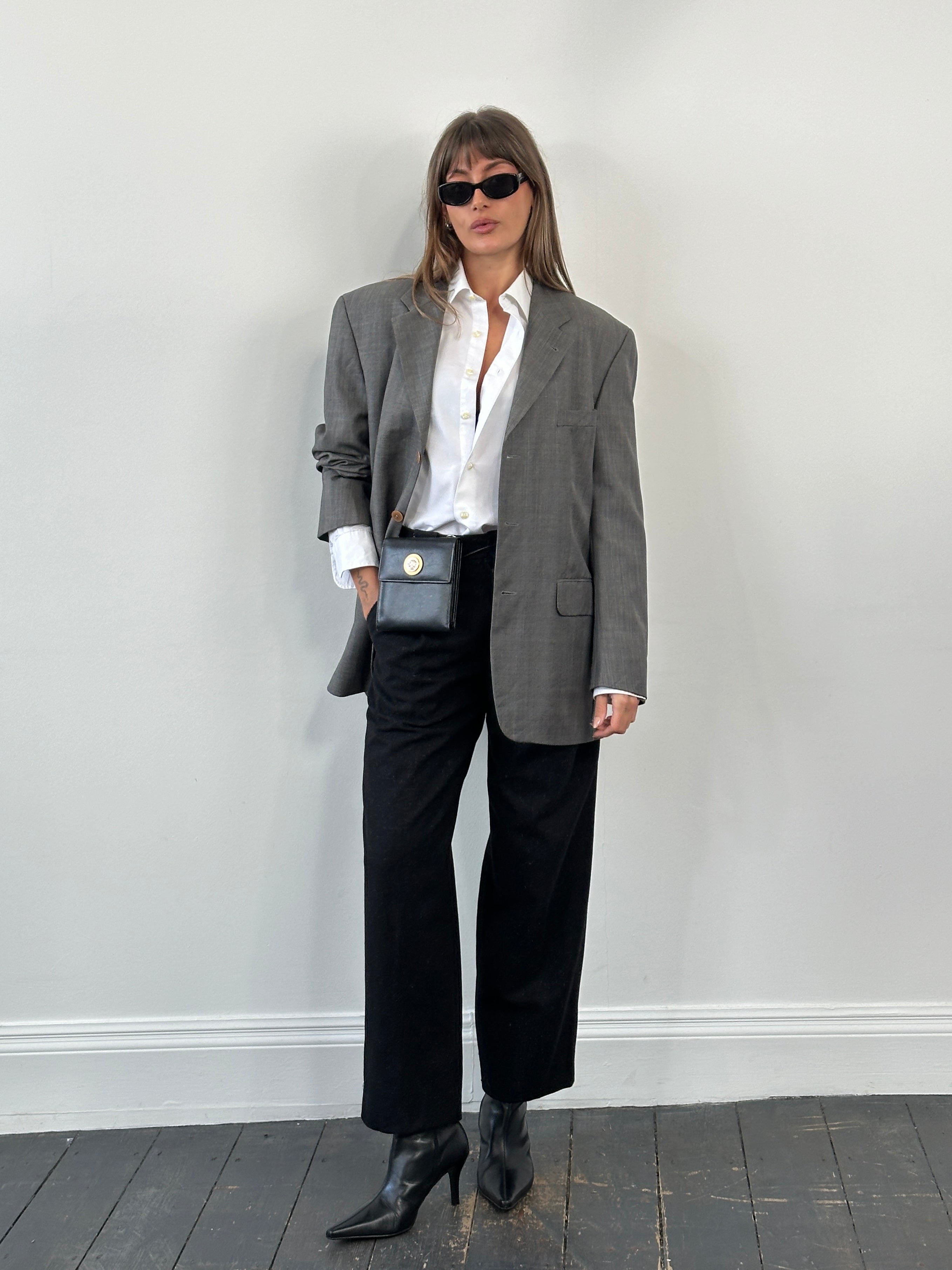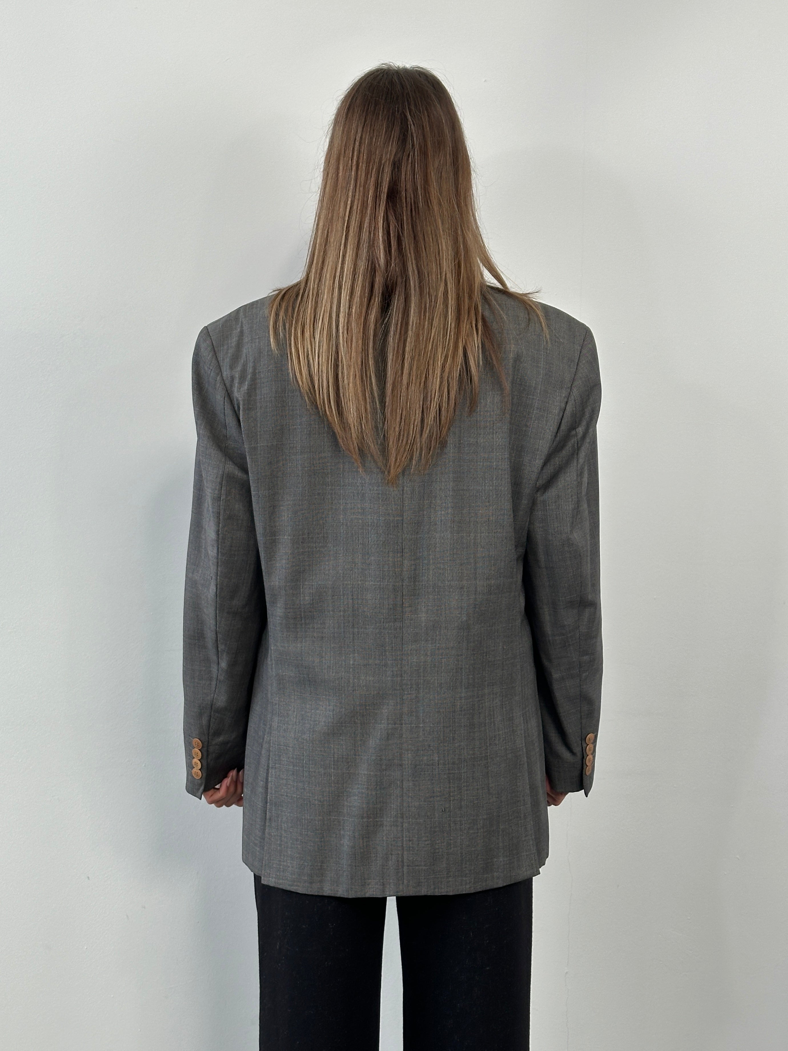 A refined grey Yves Saint Laurent pour Homme blazer tailored in pure wool with a clean single breasted cut and warm brown tone buttons. Finished with a signature YSL monogram lining in smooth viscose, this piece reflects classic 1990s Parisian menswear with understated elegance.