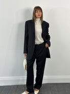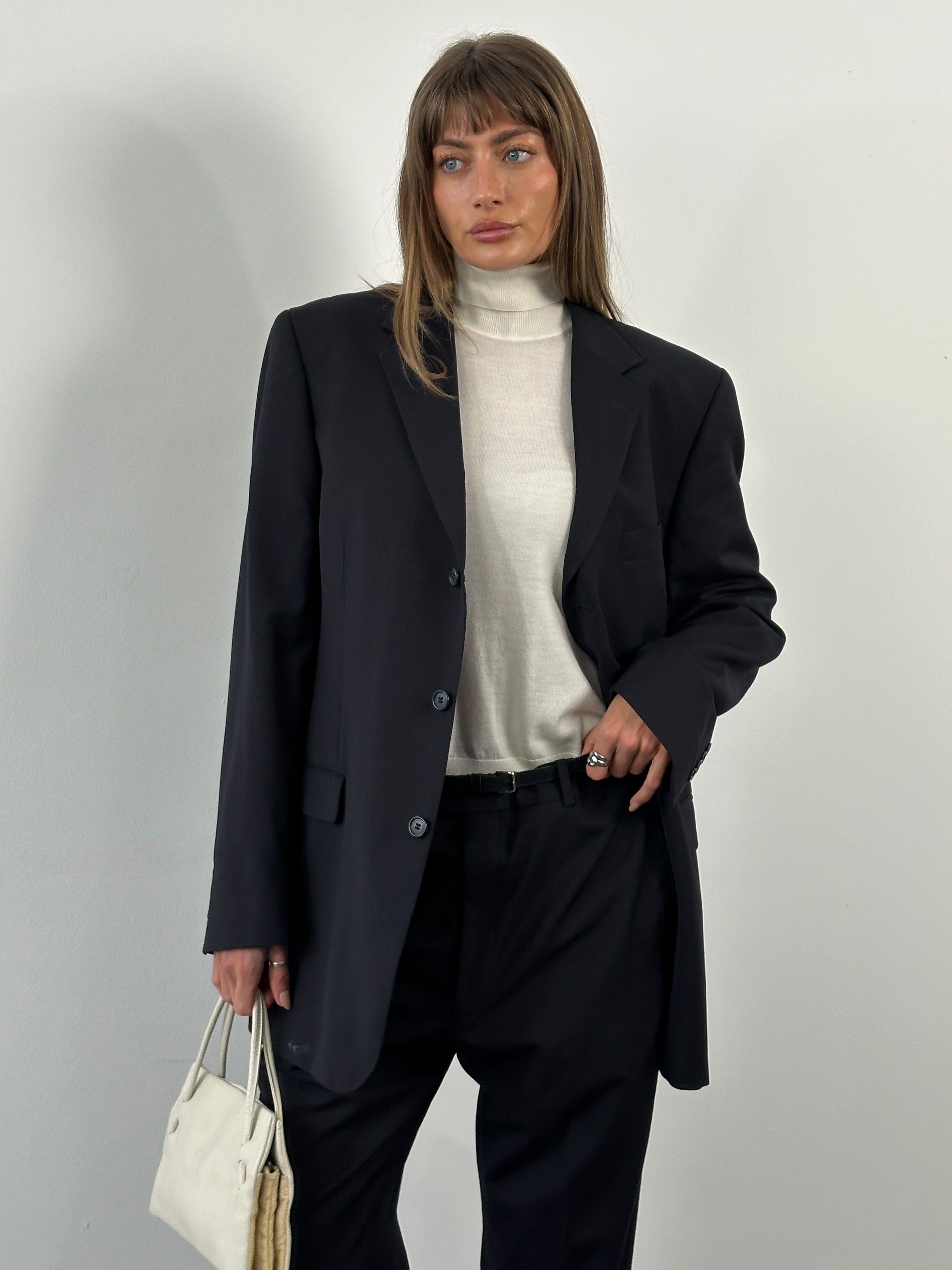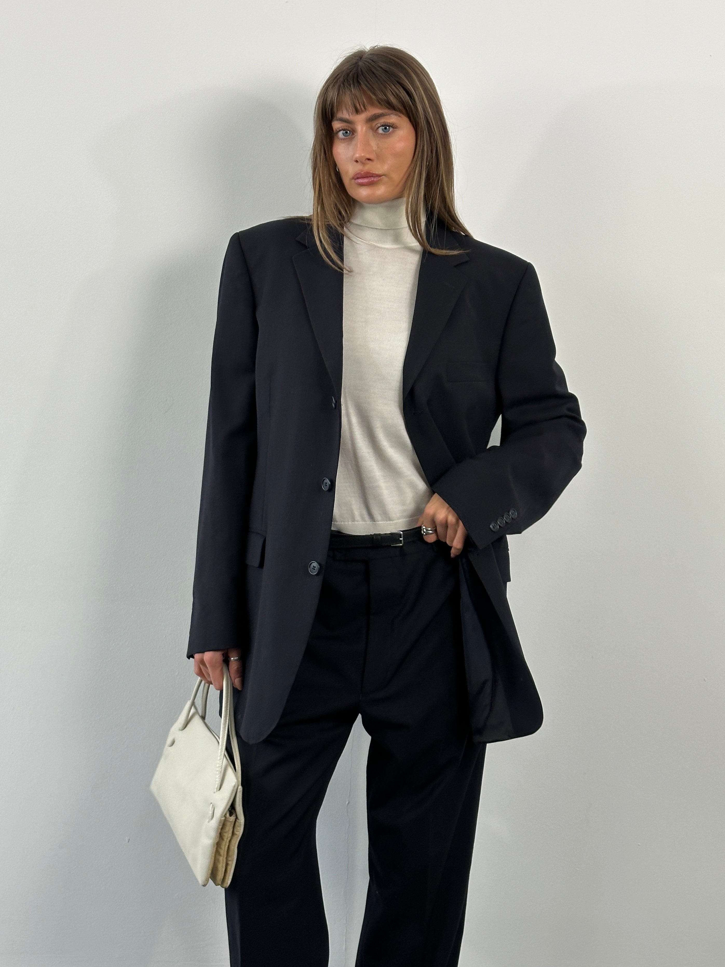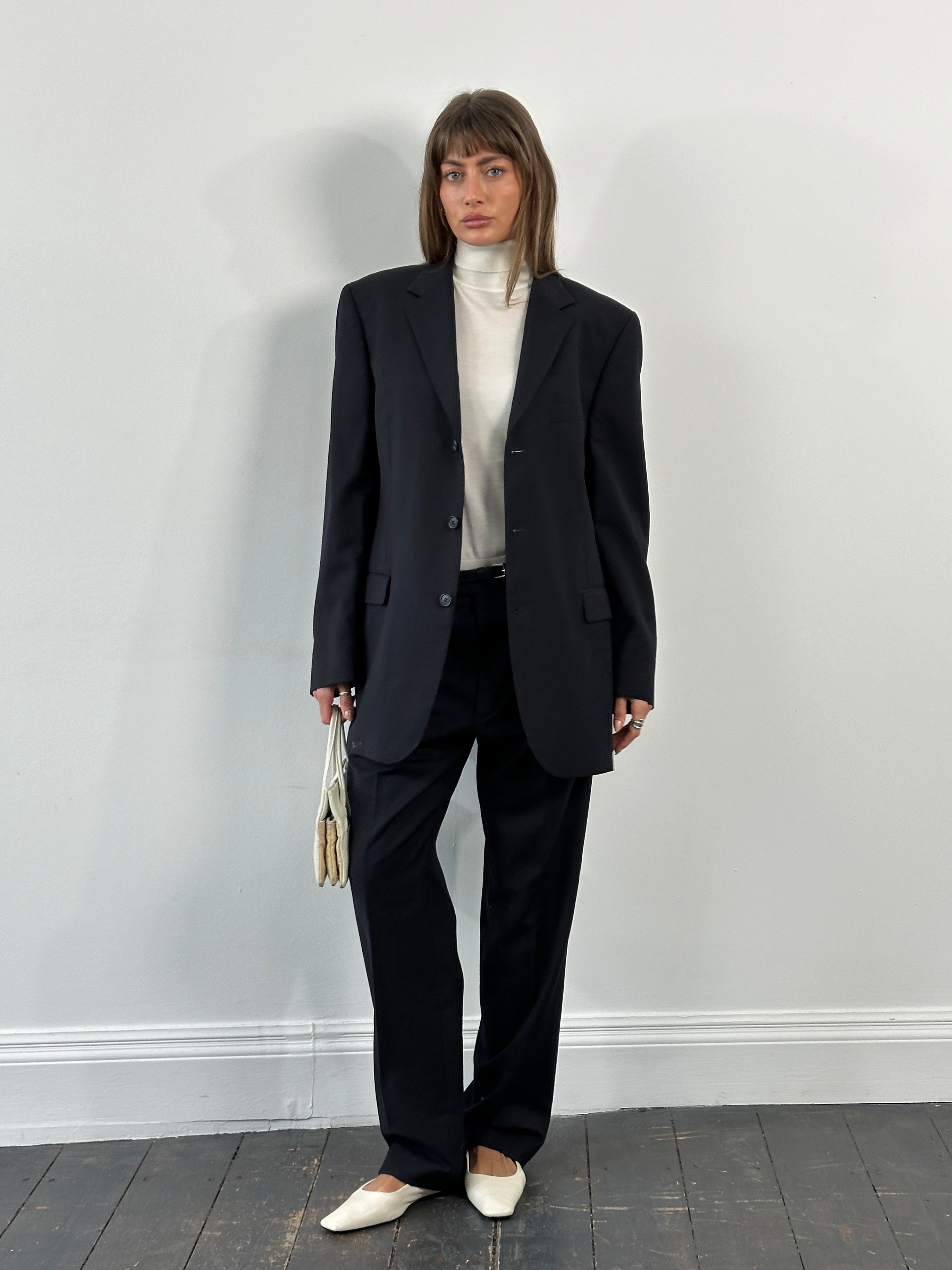 A vintage 1990s Yves Saint Laurent pour homme single breasted suit in a deep navy tone. A refined tailored set with clean lines and a structured drape.