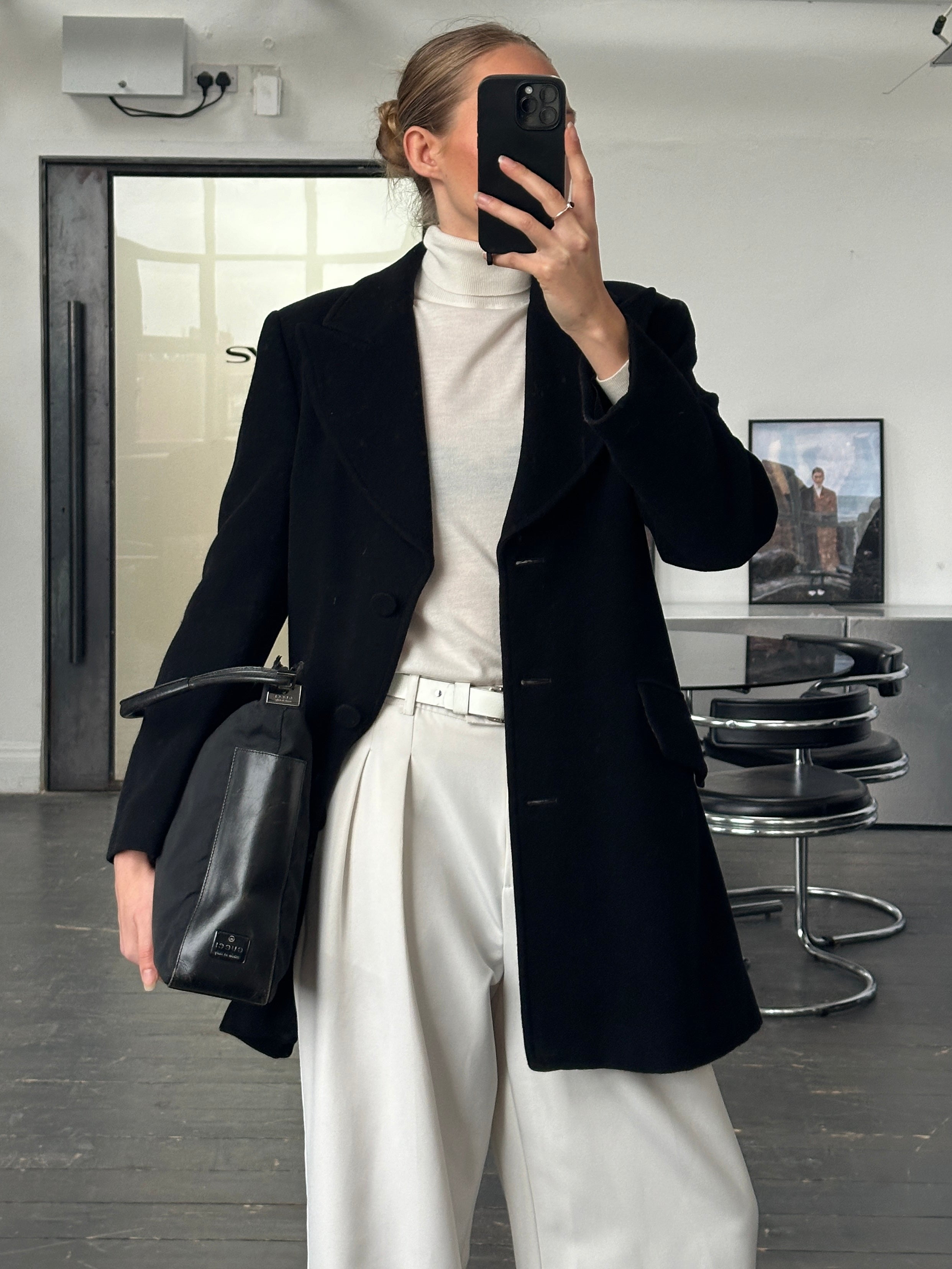 A vintage 1990s Emporio Armani tailored coat in black with a dramatic oversized lapel and clean architectural lines. A refined outerwear piece that reflects the brand’s sharp minimalist tailoring from the era.