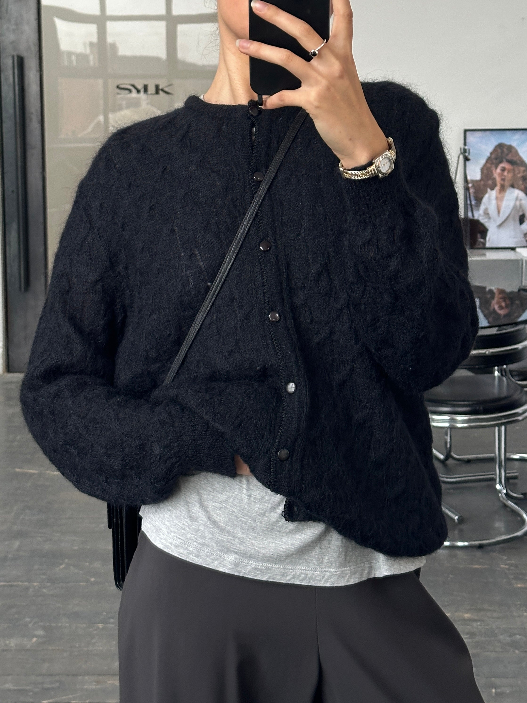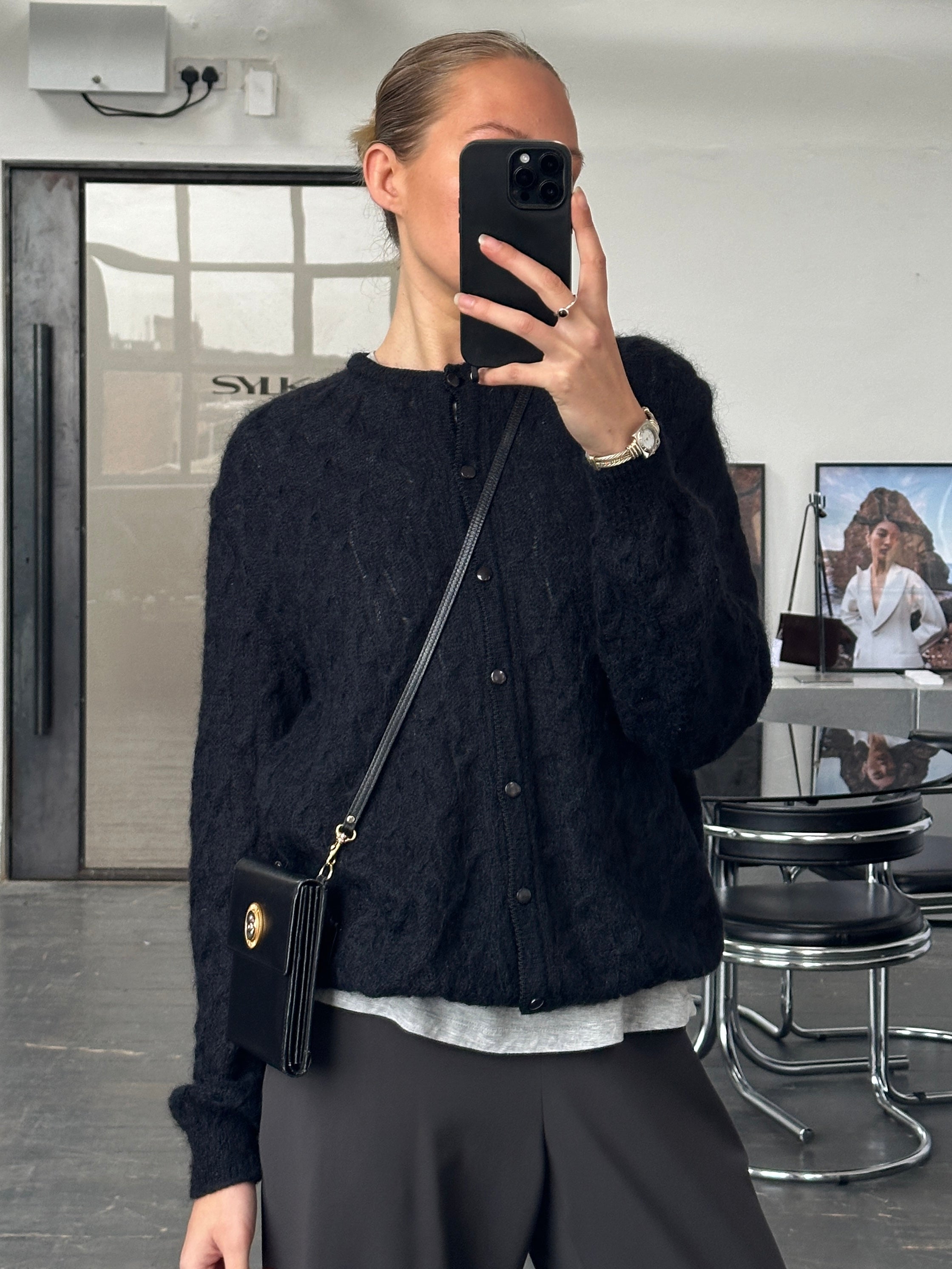 Italian vintage 1990s cardigan crafted from a luxurious super kid mohair blend with a soft textured knit and classic round neckline. Finished with tonal buttons and a relaxed silhouette for effortless layering.