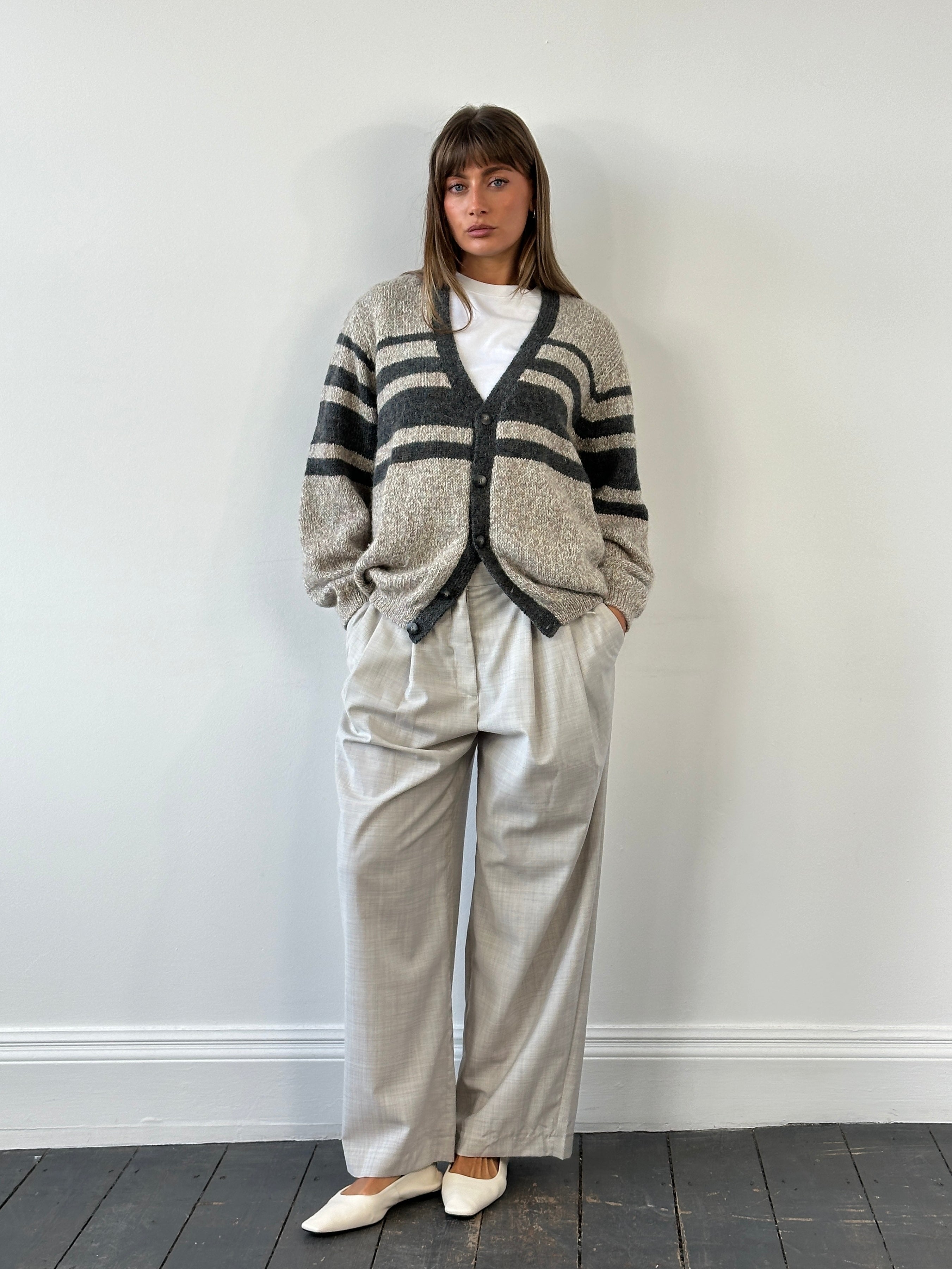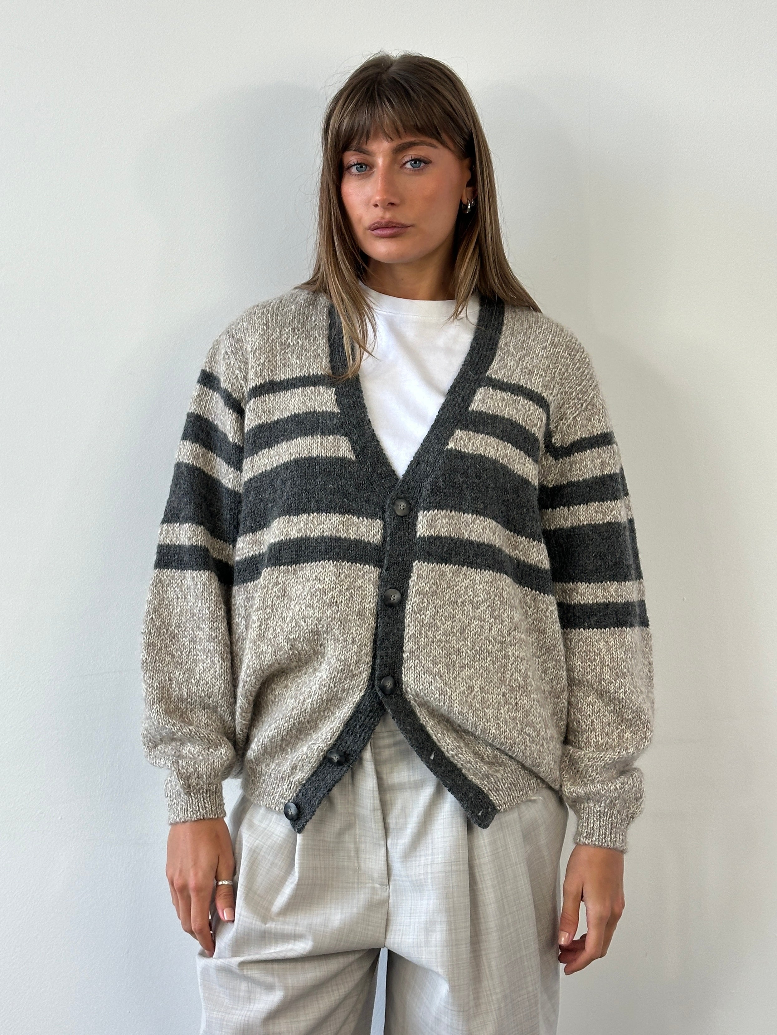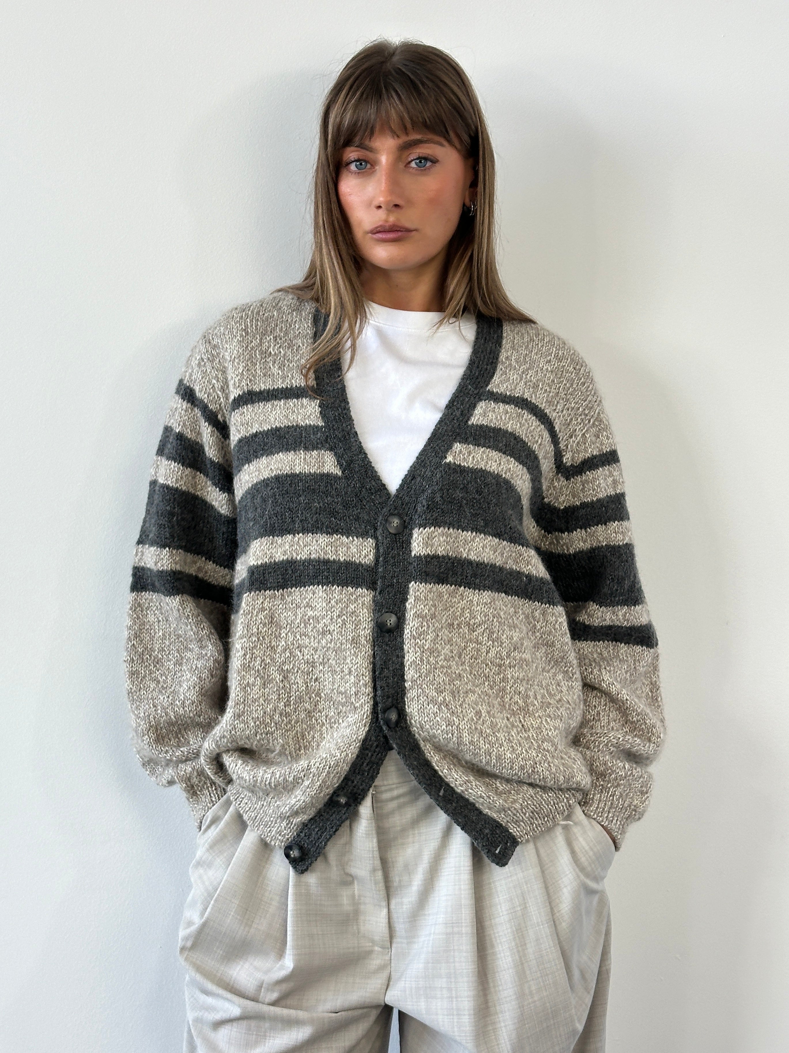 Chunky oatmeal and grey striped cardigan with a naturally fuzzy texture and soft, voluminous knit. Features a deep V-neckline and full button fastening — a timeless layering piece with a relaxed drape.