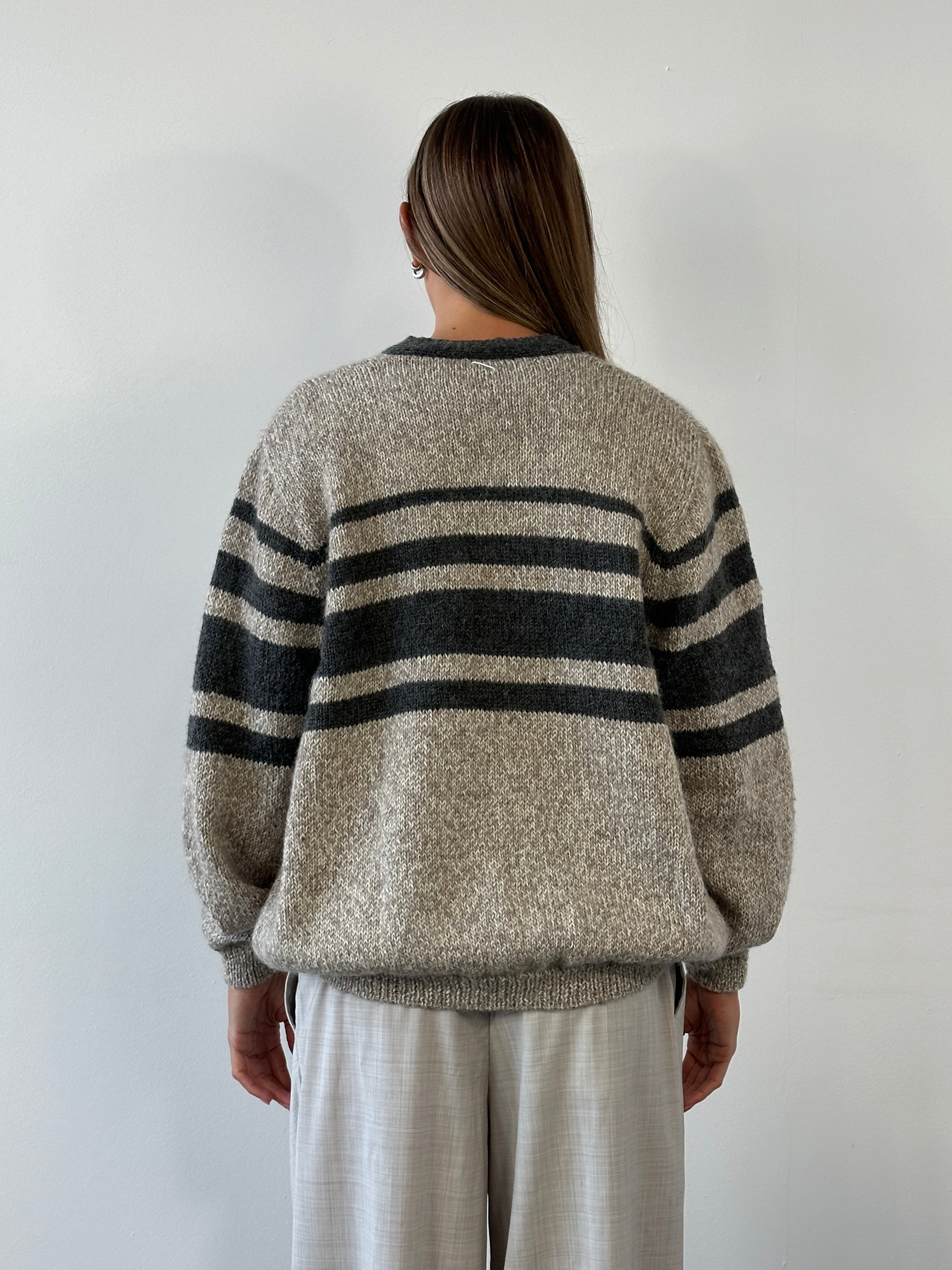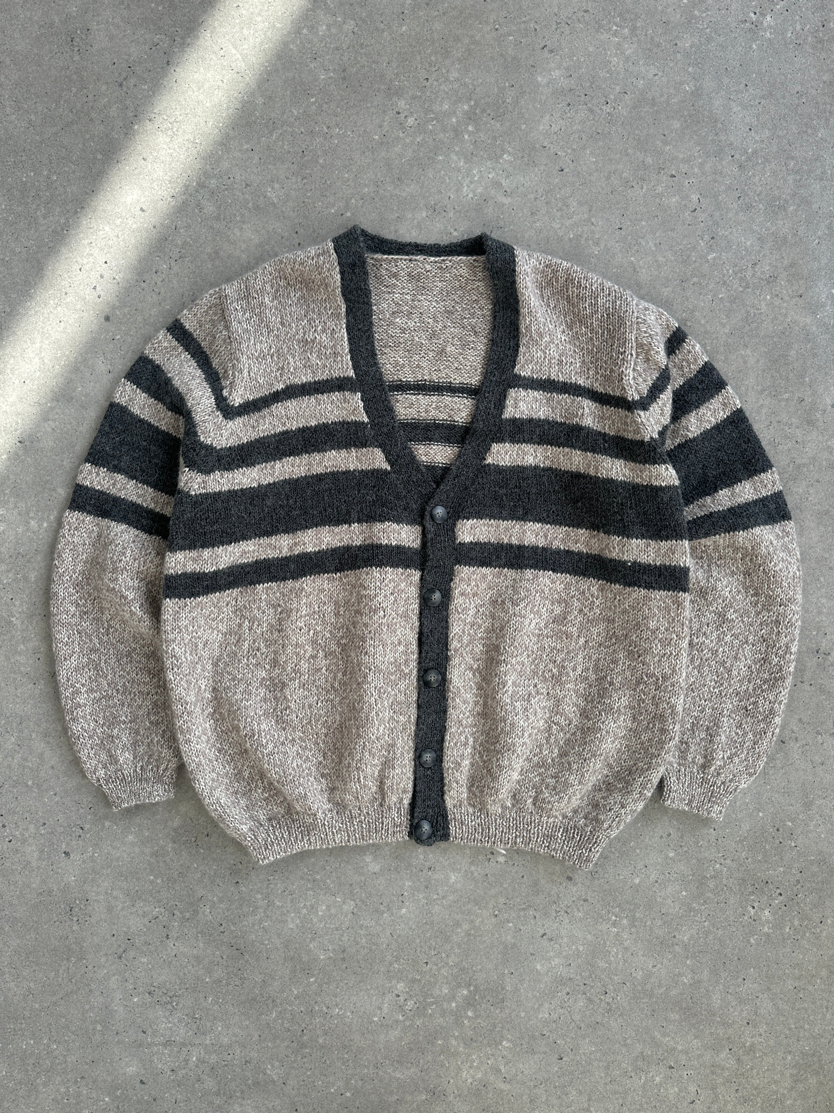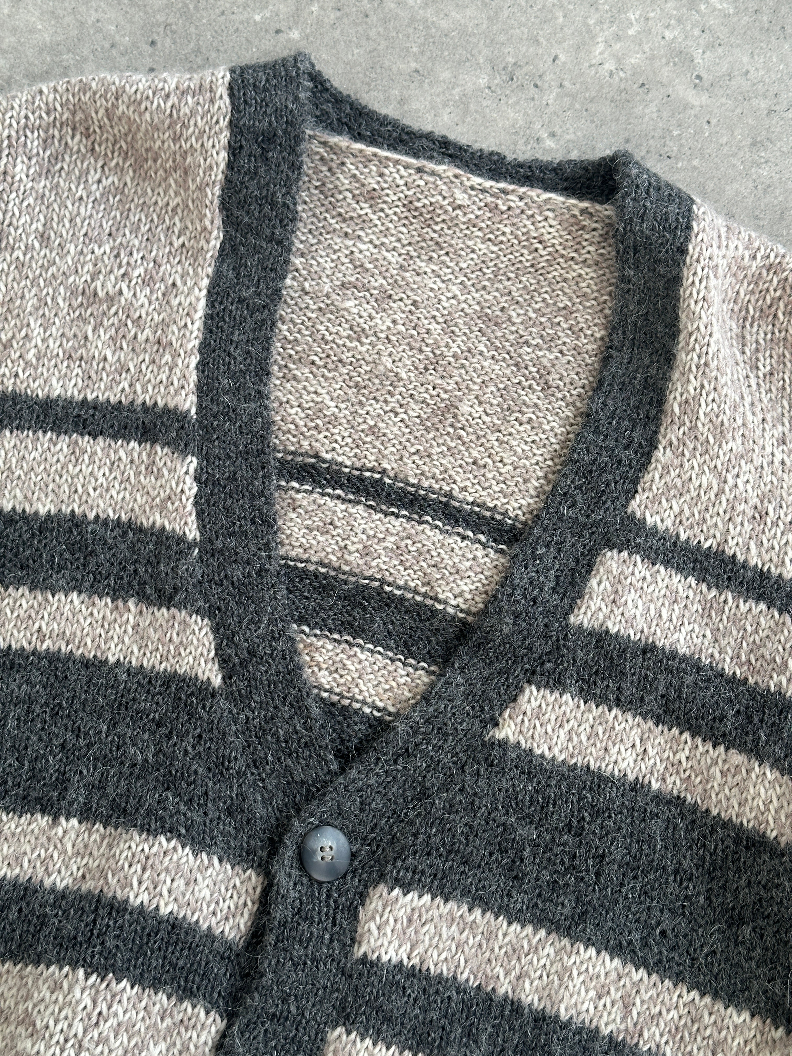 Chunky oatmeal and grey striped cardigan with a naturally fuzzy texture and soft, voluminous knit. Features a deep V-neckline and full button fastening — a timeless layering piece with a relaxed drape.