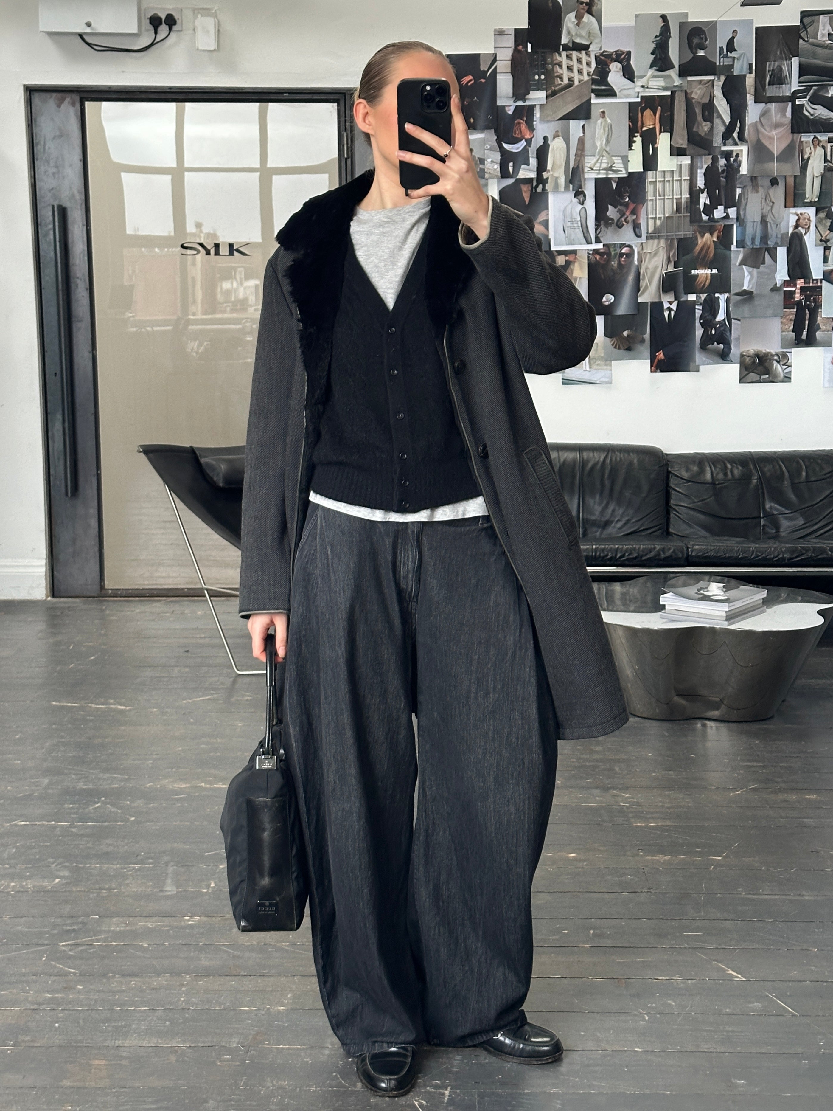 Armani Collezioni 2000s coat crafted in a grey wool blend, finished with a plush fur collar and subtle leather piping that elevates the silhouette.