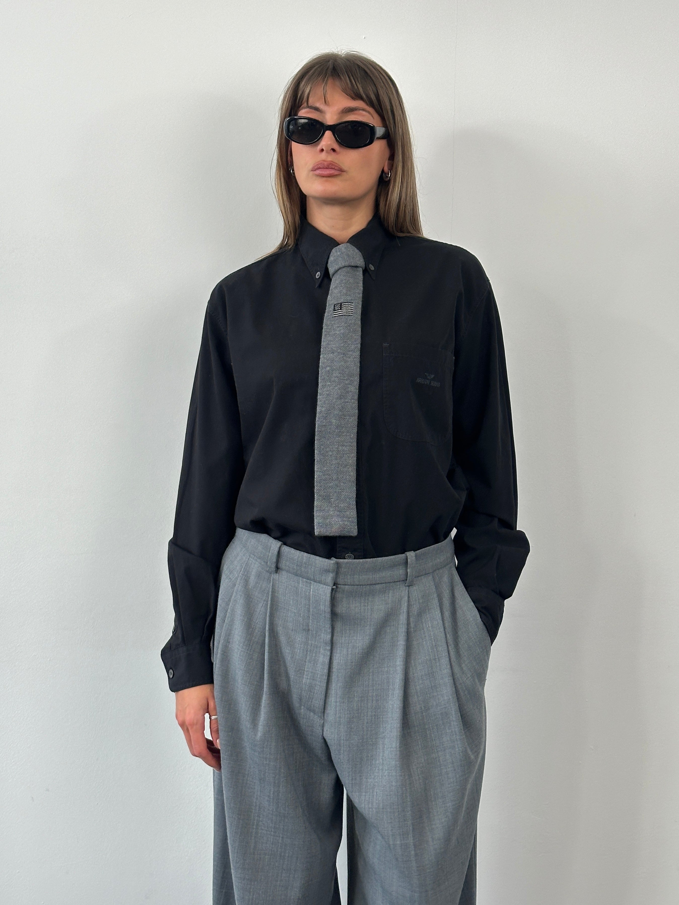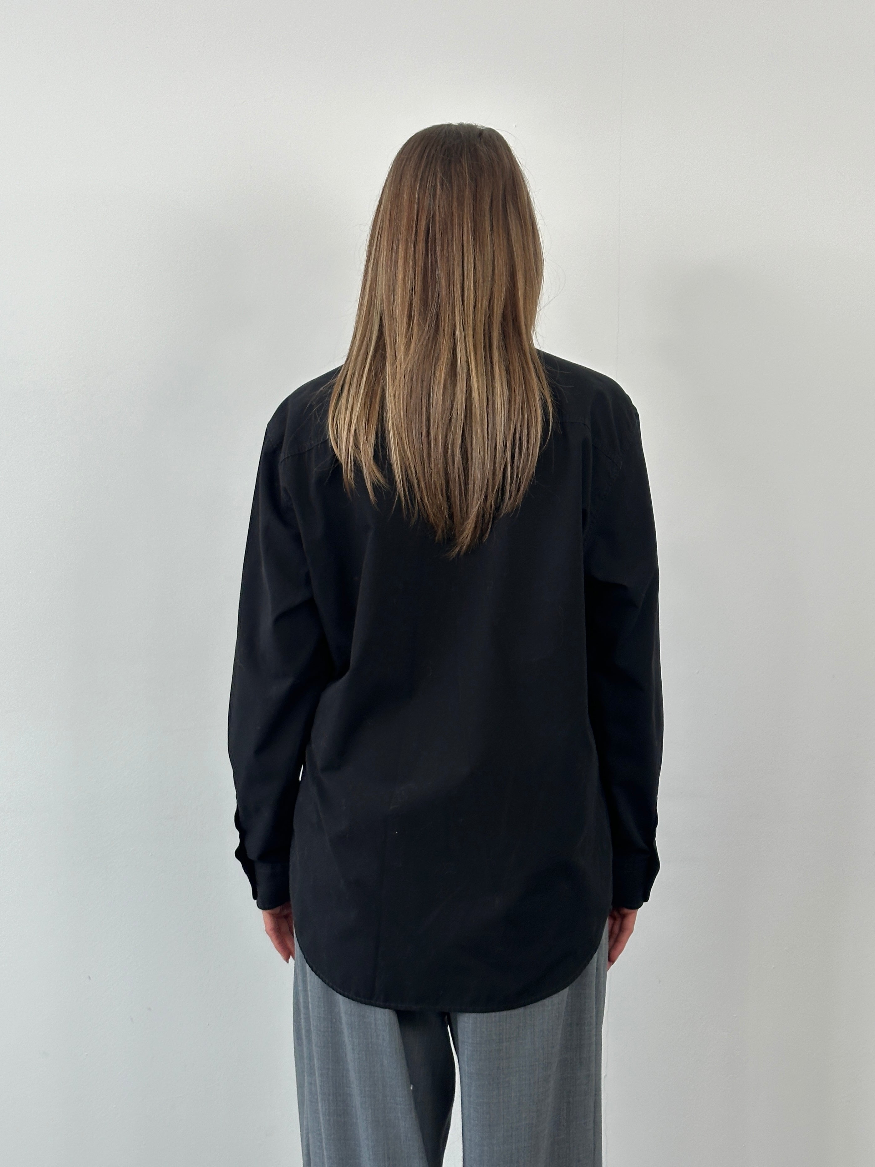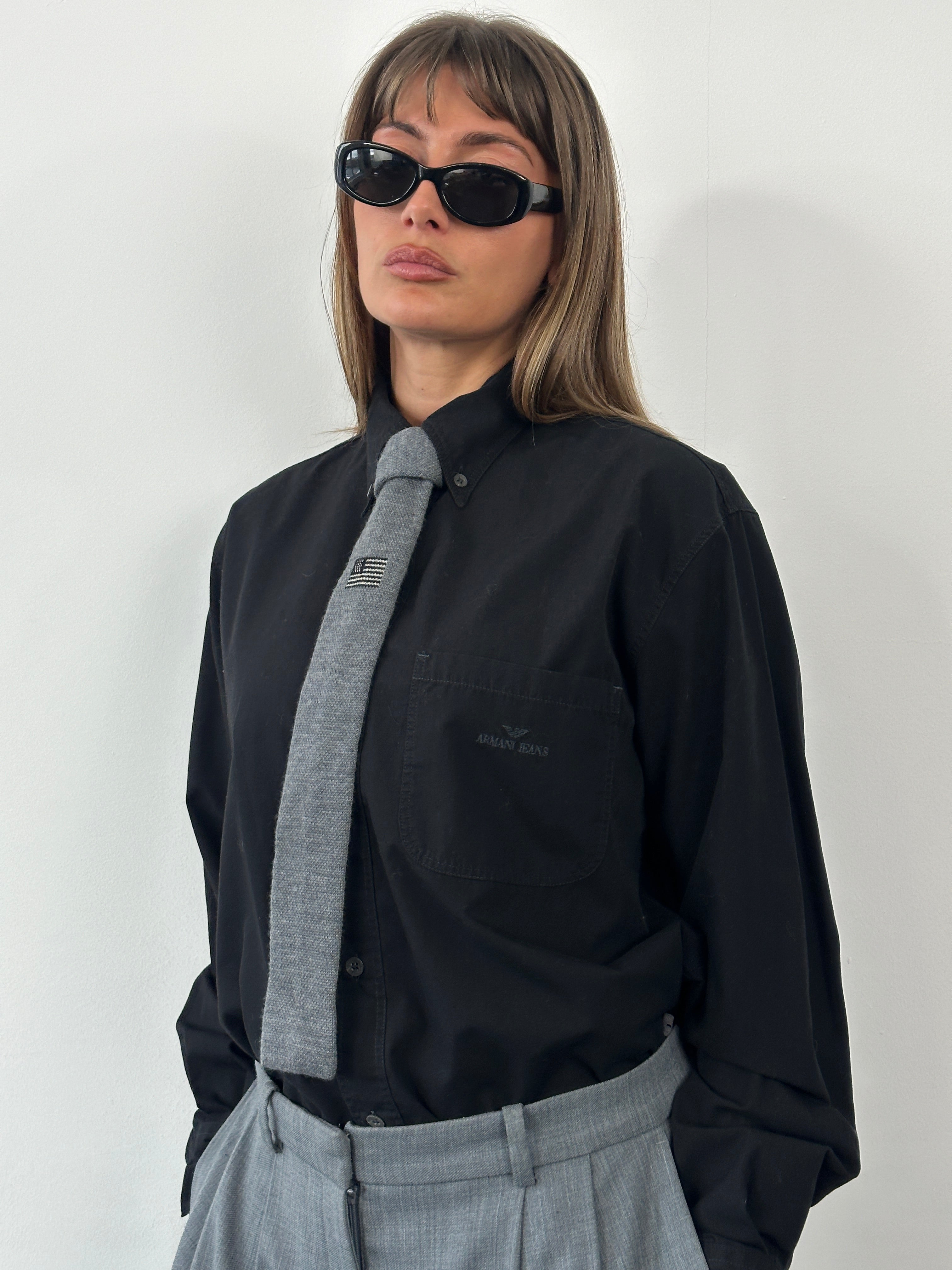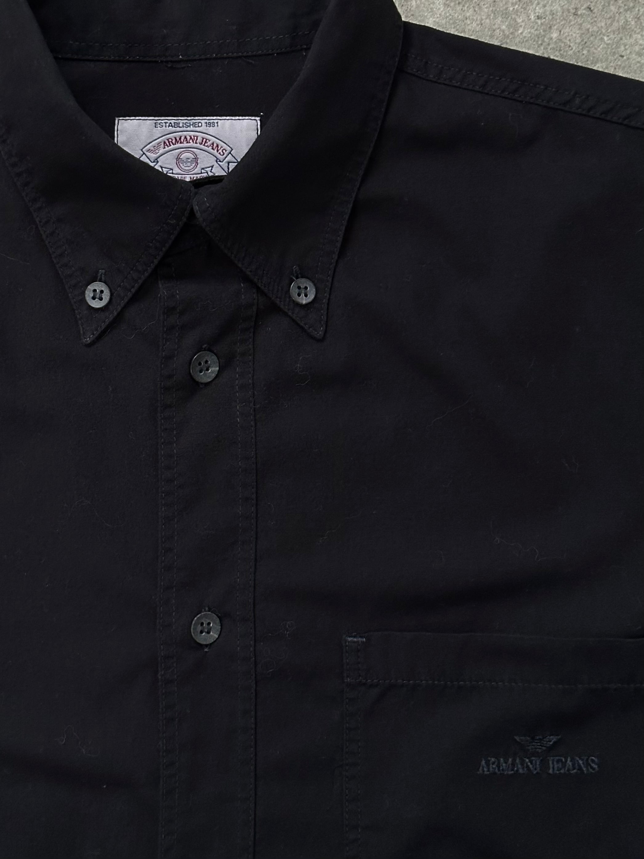 Vintage 1990s black shirt by Armani Jeans with subtle embroidered chest logo detailing. Crafted in Italy from a cotton, featuring a relaxed straight cut, classic point collar, and long sleeves with buttoned cuffs.