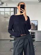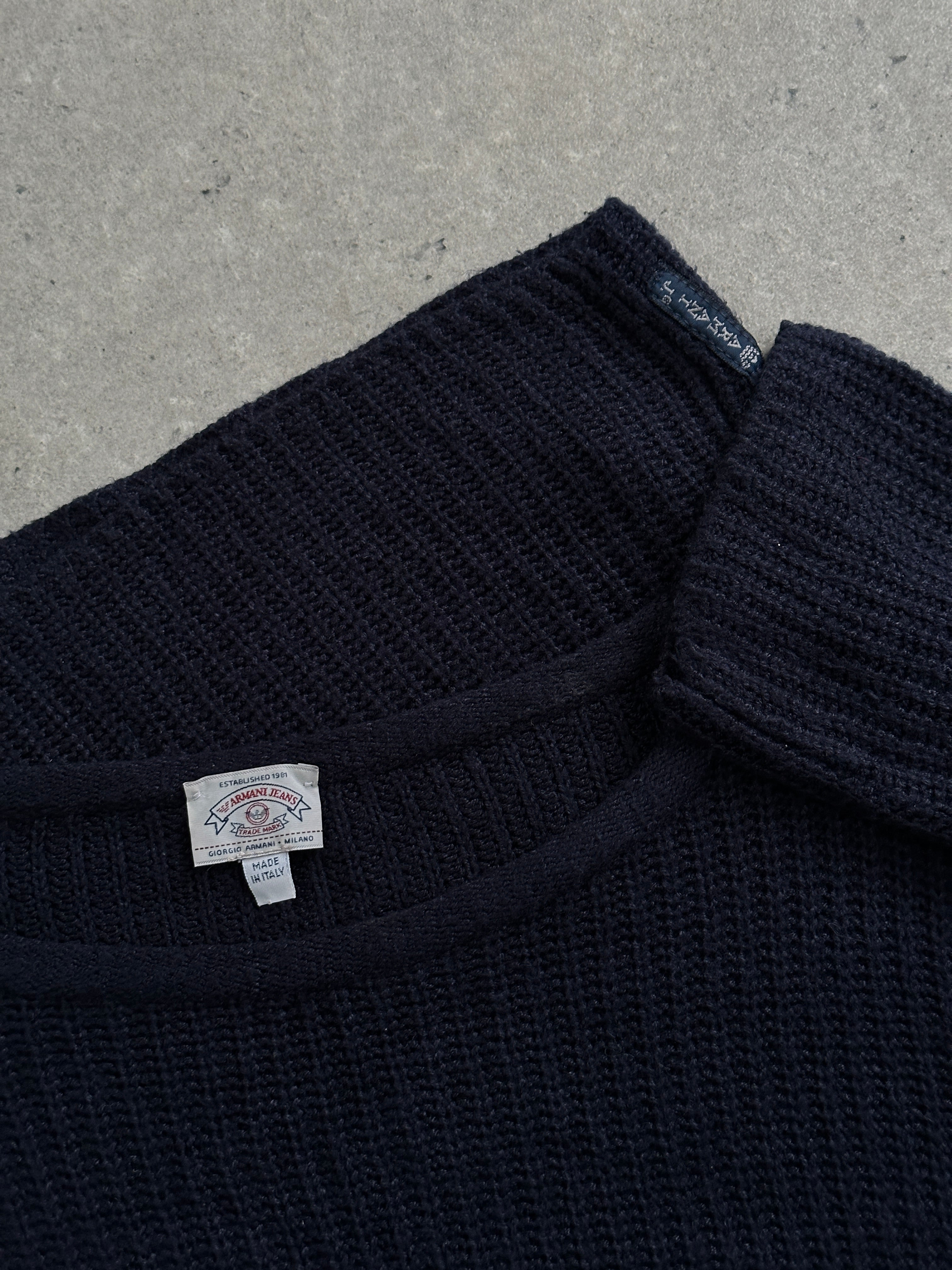 A vintage late 1990s Armani Jeans cropped knit jumper in a deep navy tone with a clean open-weave texture. A minimal fitted silhouette that feels lightweight and understated in line with Armani’s casual knitwear from the era.