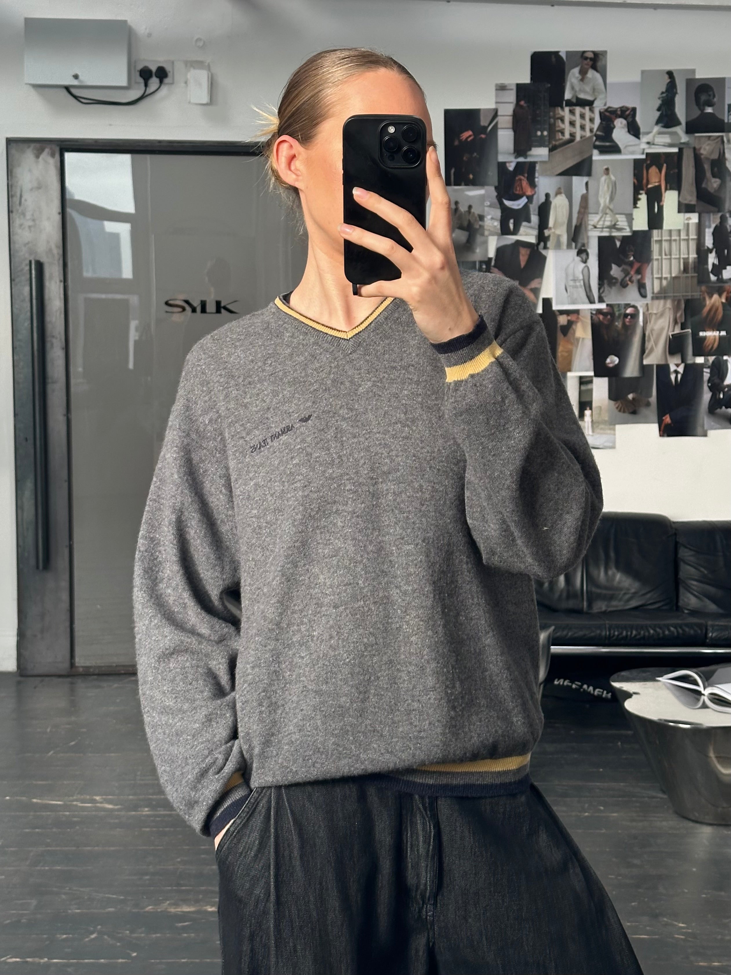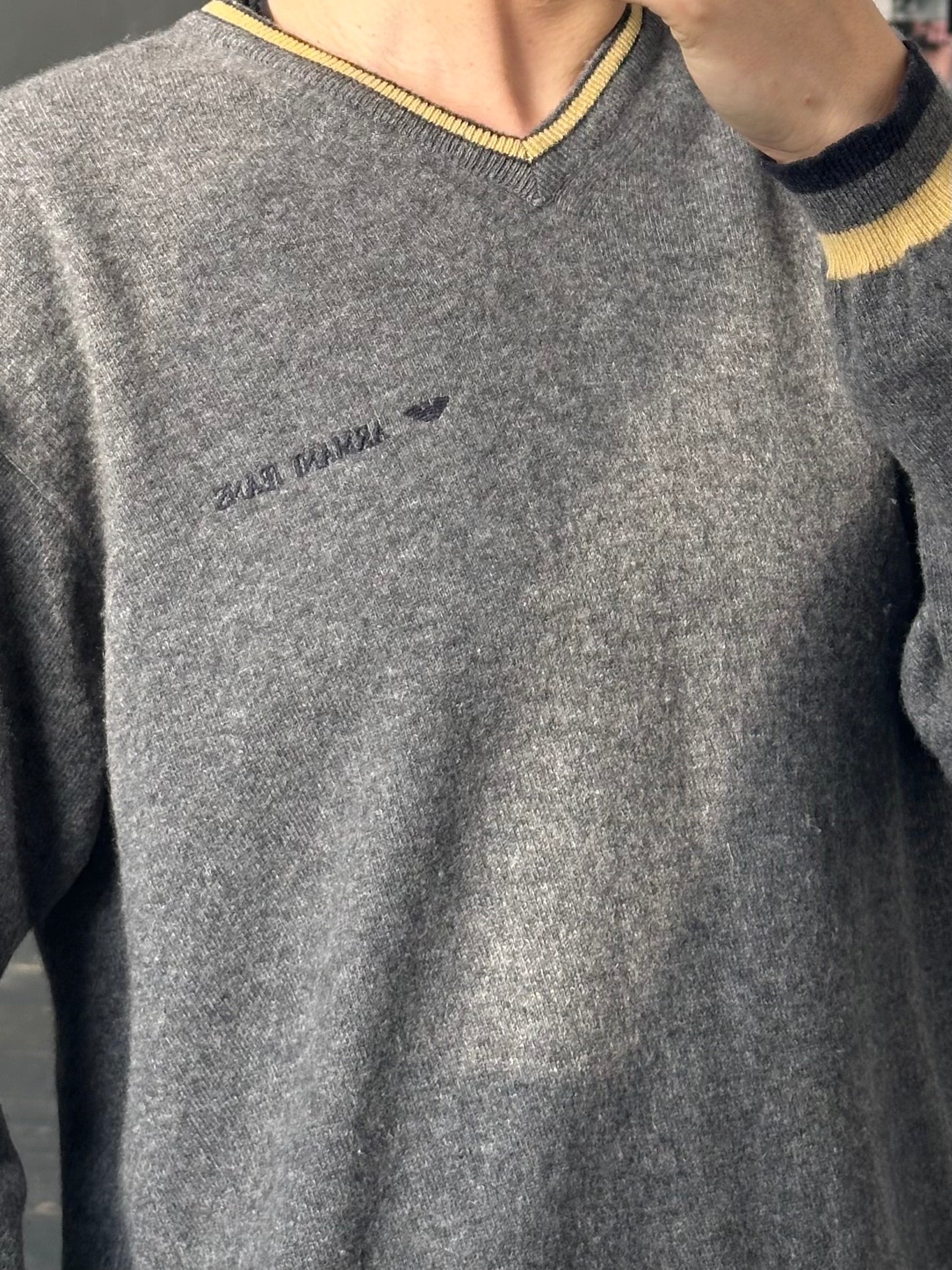 Vintage Armani Jeans V neck jumper in grey virgin wool with embroidered chest logo. Designed with contrasting yellow and navy stripe trim at the neckline and hem, creating a classic sporty knit silhouette typical of Armani Jeans casual collections from the 1990s.