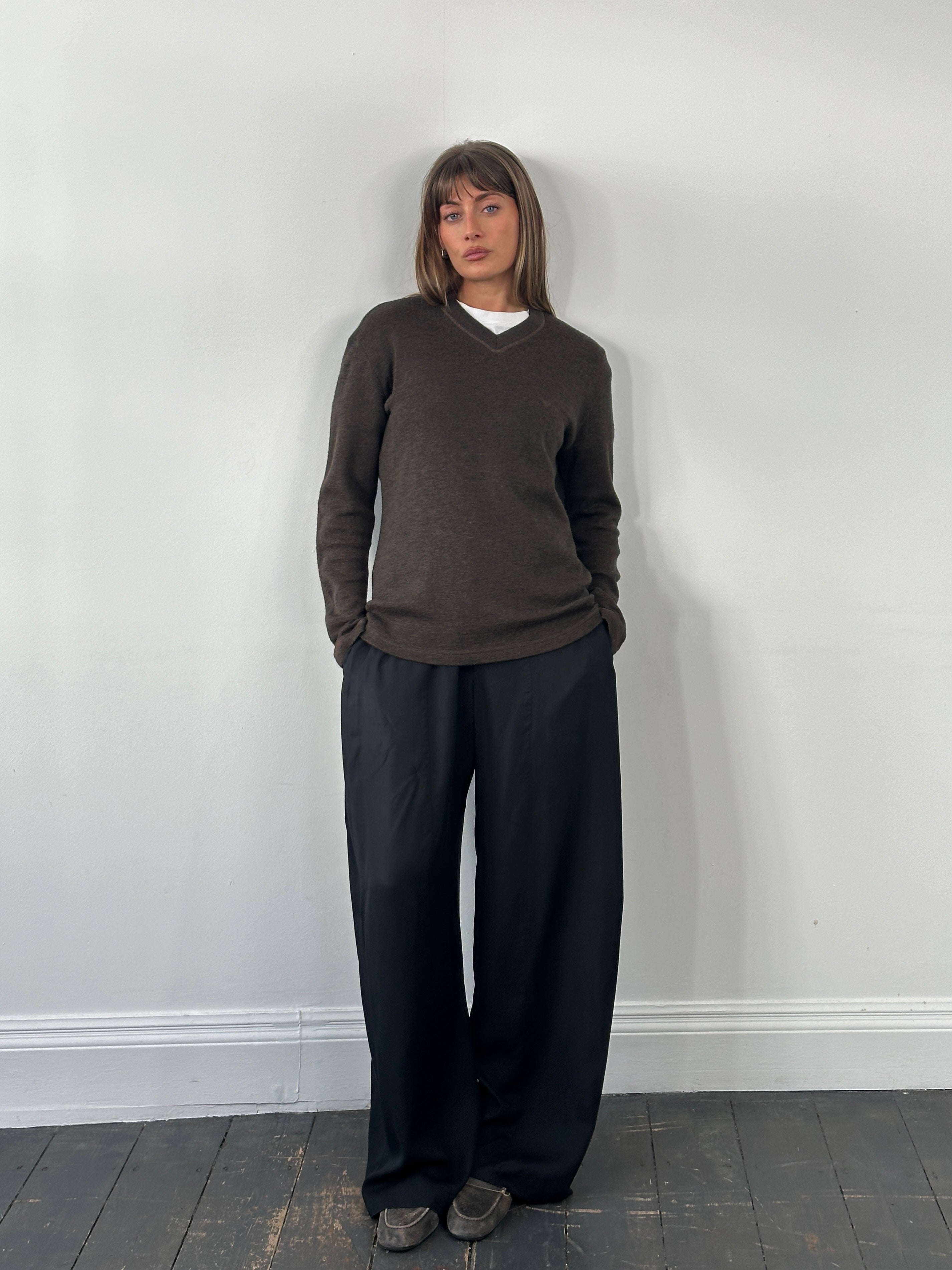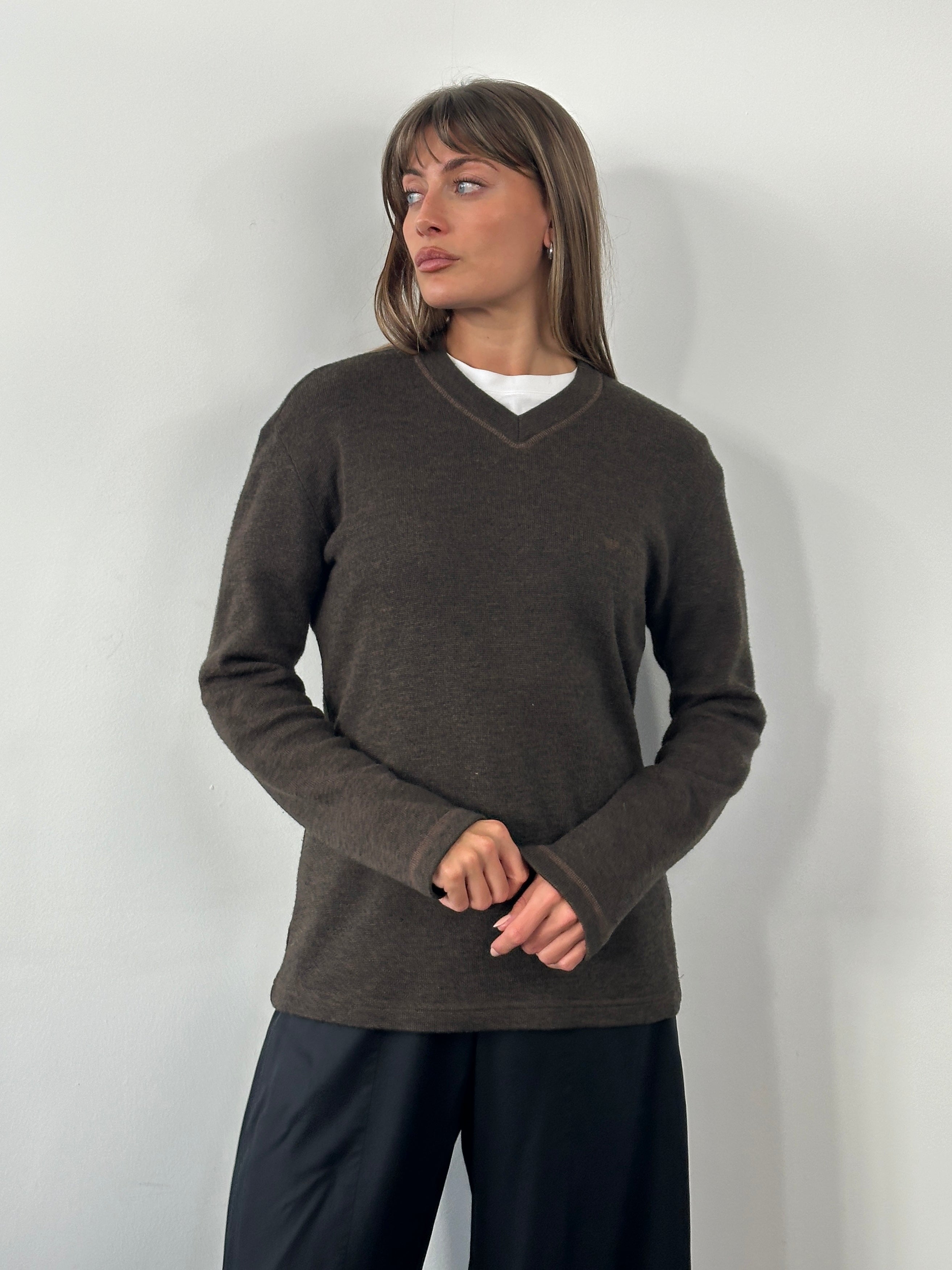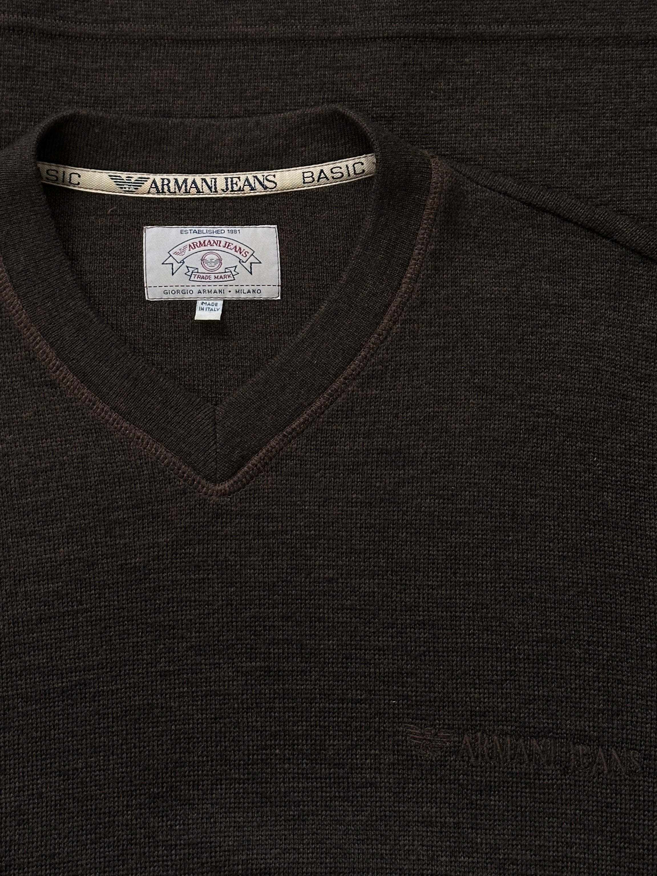 A brown 2000s vintage knitted jumper by Armani Jeans, finished with subtle logo embroidery and a classic V neckline. Crafted in a wool knit with a soft, midweight handle and a clean, streamlined silhouette.