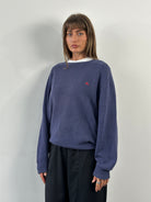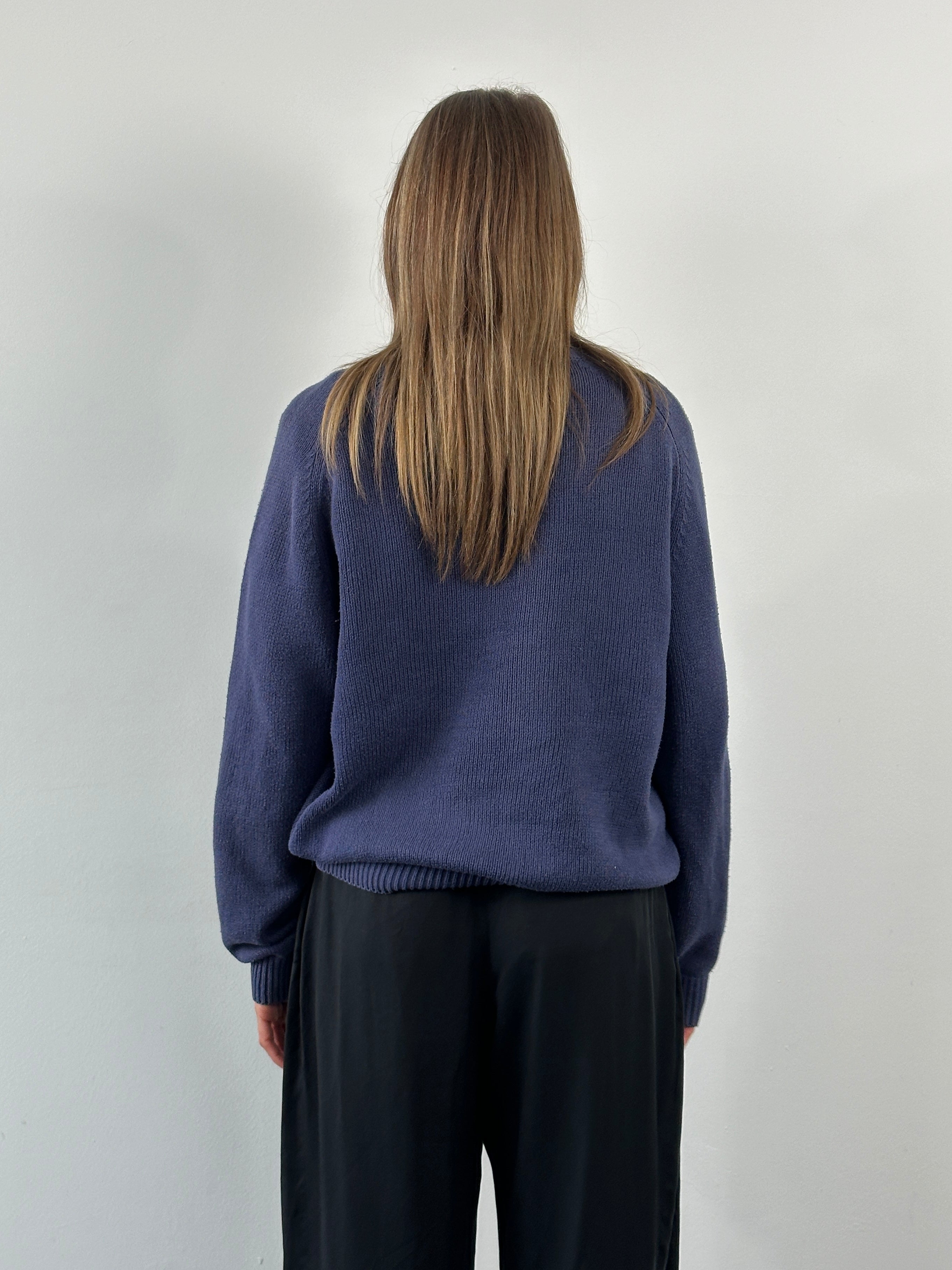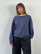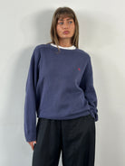 A vintage 1990s Burberrys cotton knitted jumper in a navy tone with a clean crew neck shape. A minimal red EDK logo embroidery adds a refined quiet luxury feel.