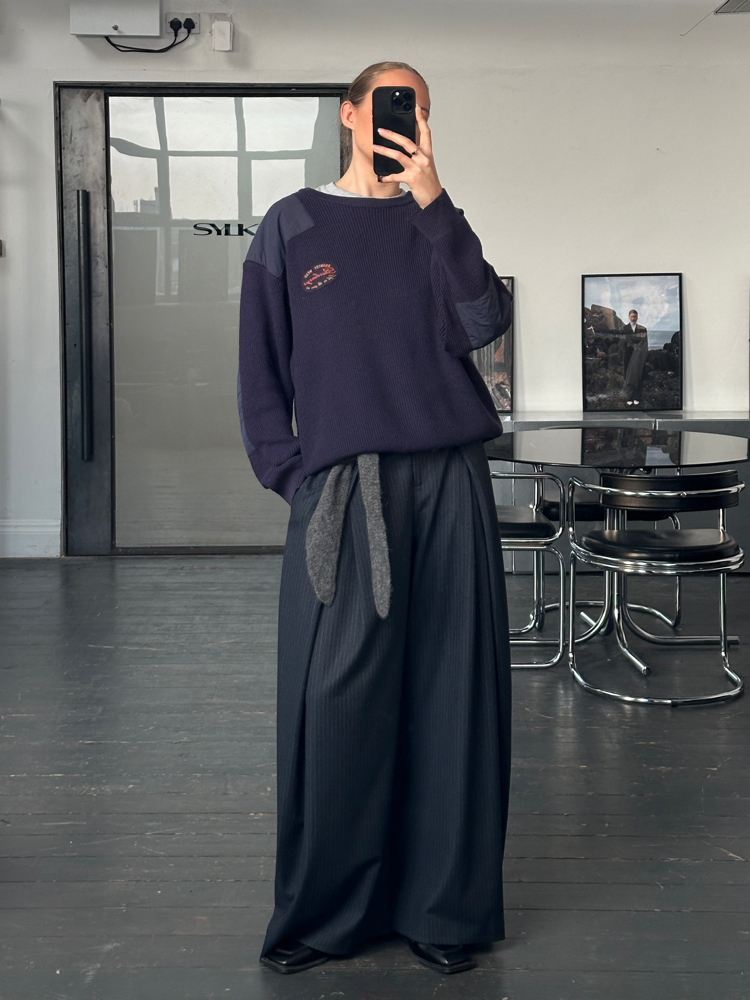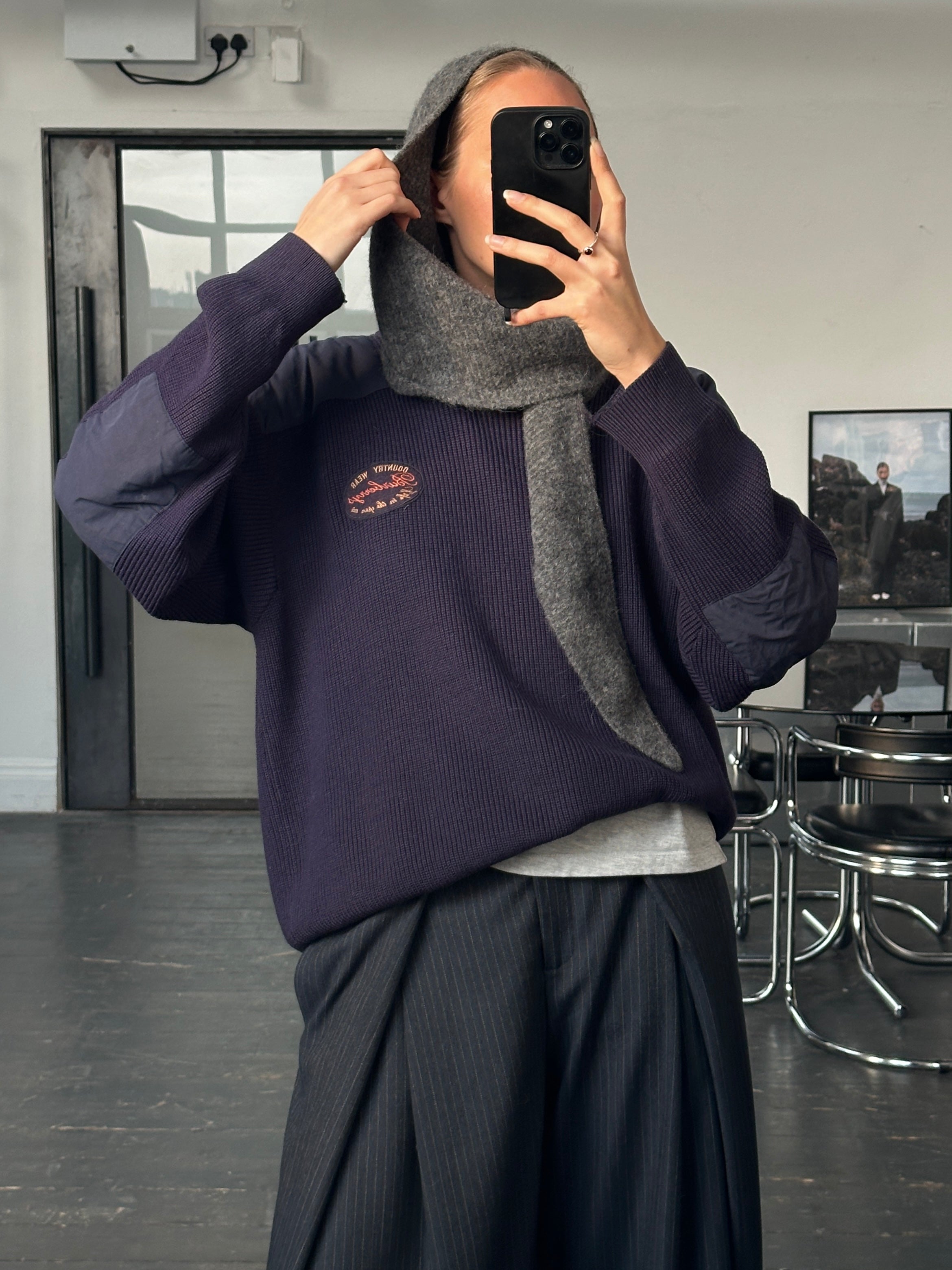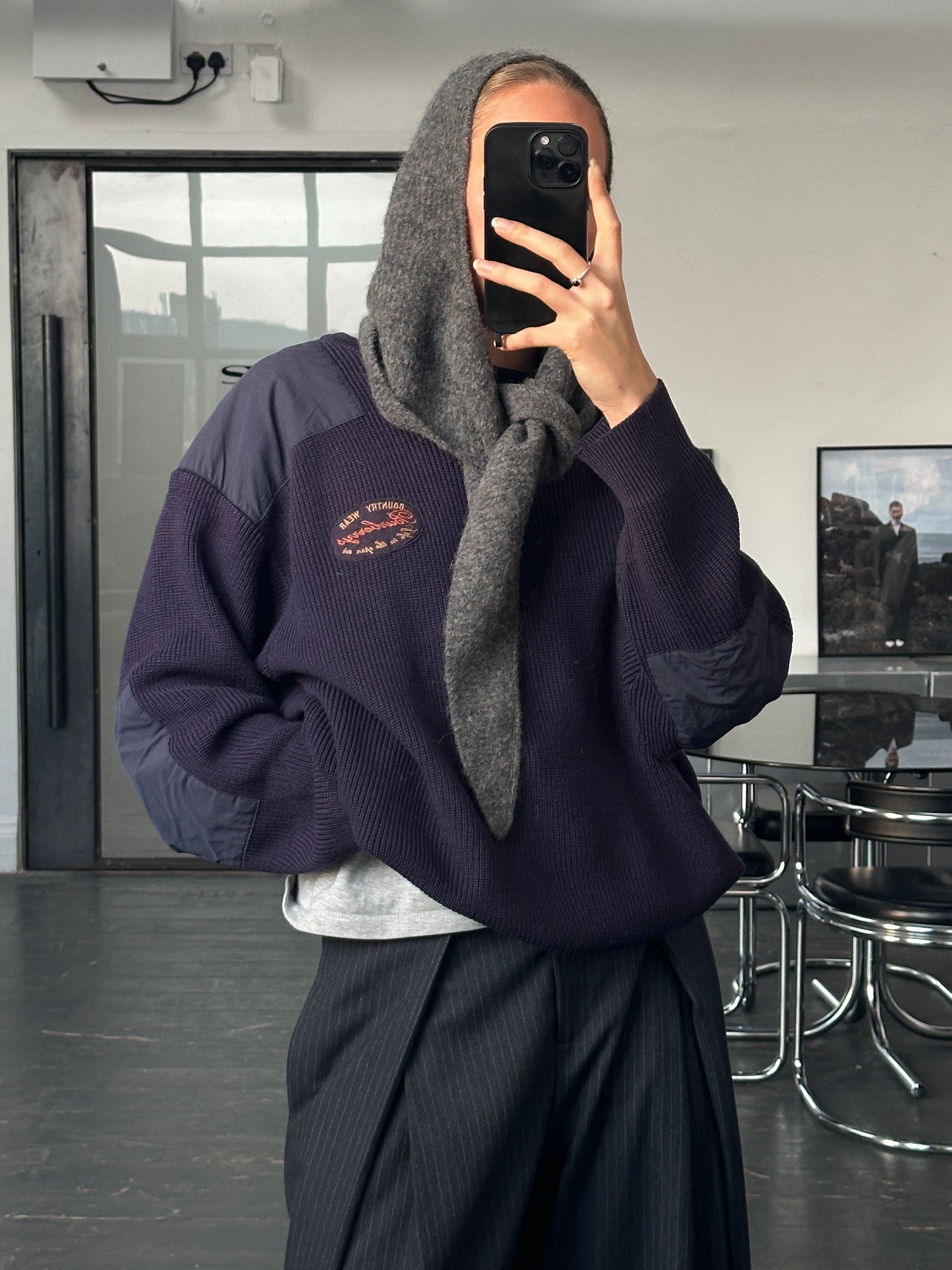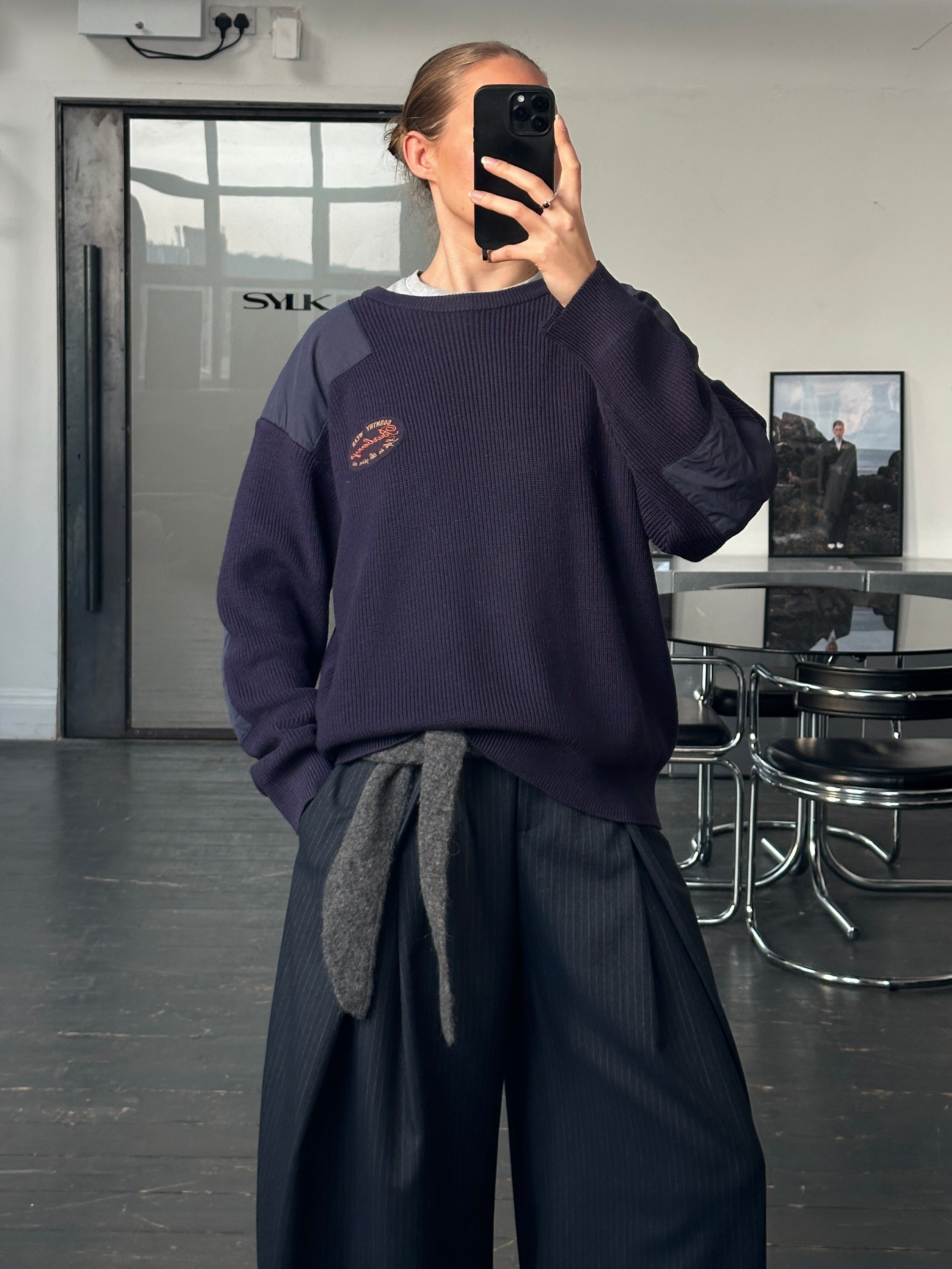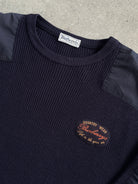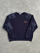 vintage 1990s Burberrys of London knitted jumper in a deep navy tone featuring contrast shoulder patches and chest embroidery. A relaxed chunky knit with utilitarian detailing that reflects Burberry’s countrywear influence.