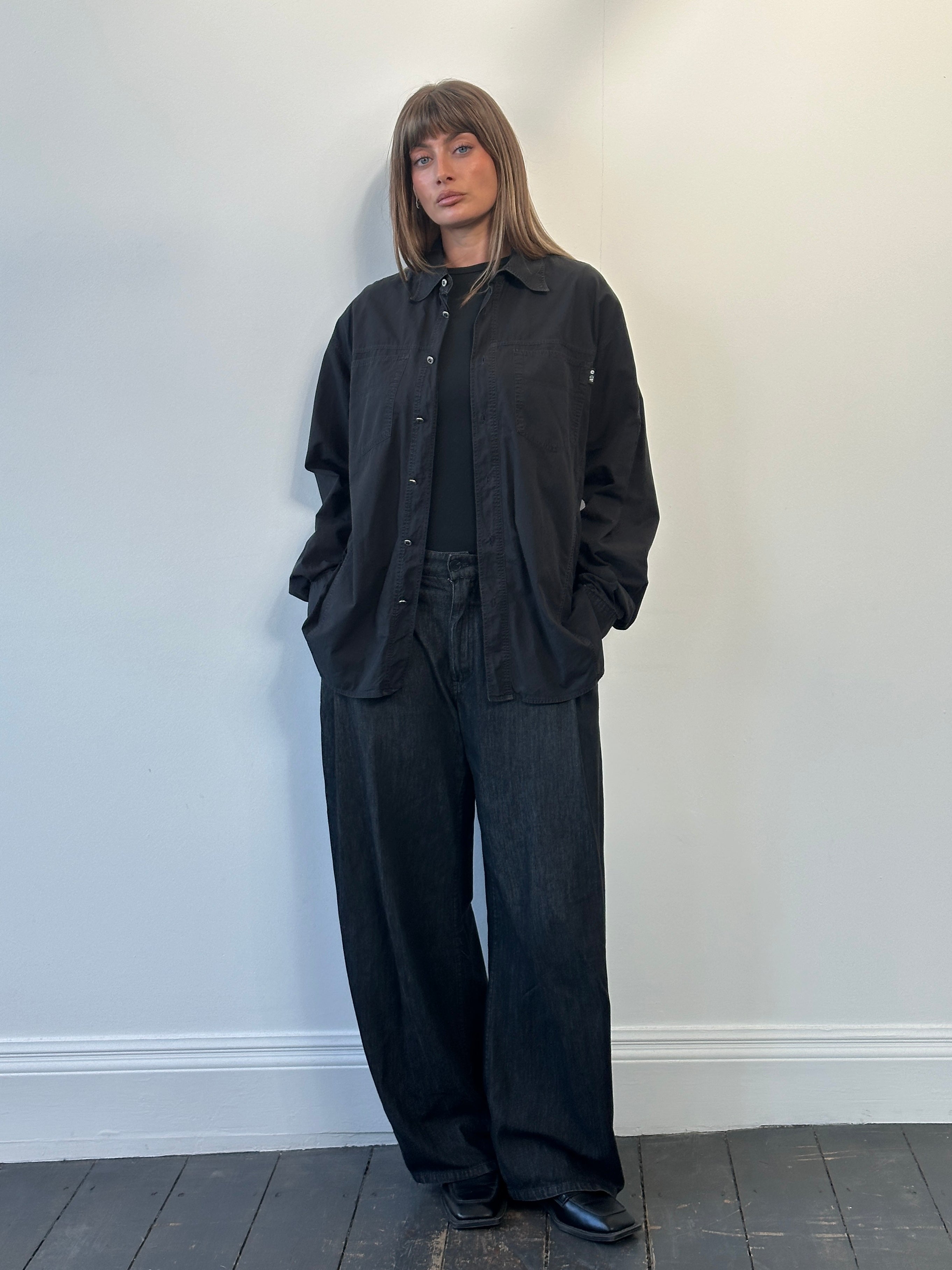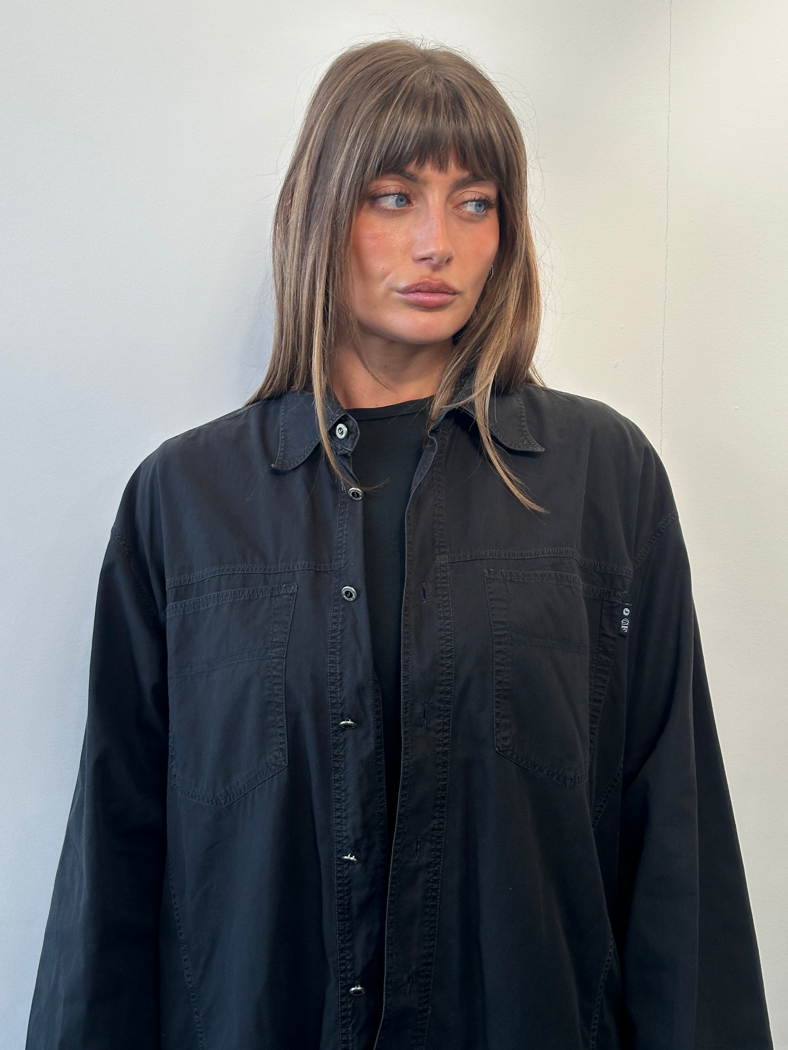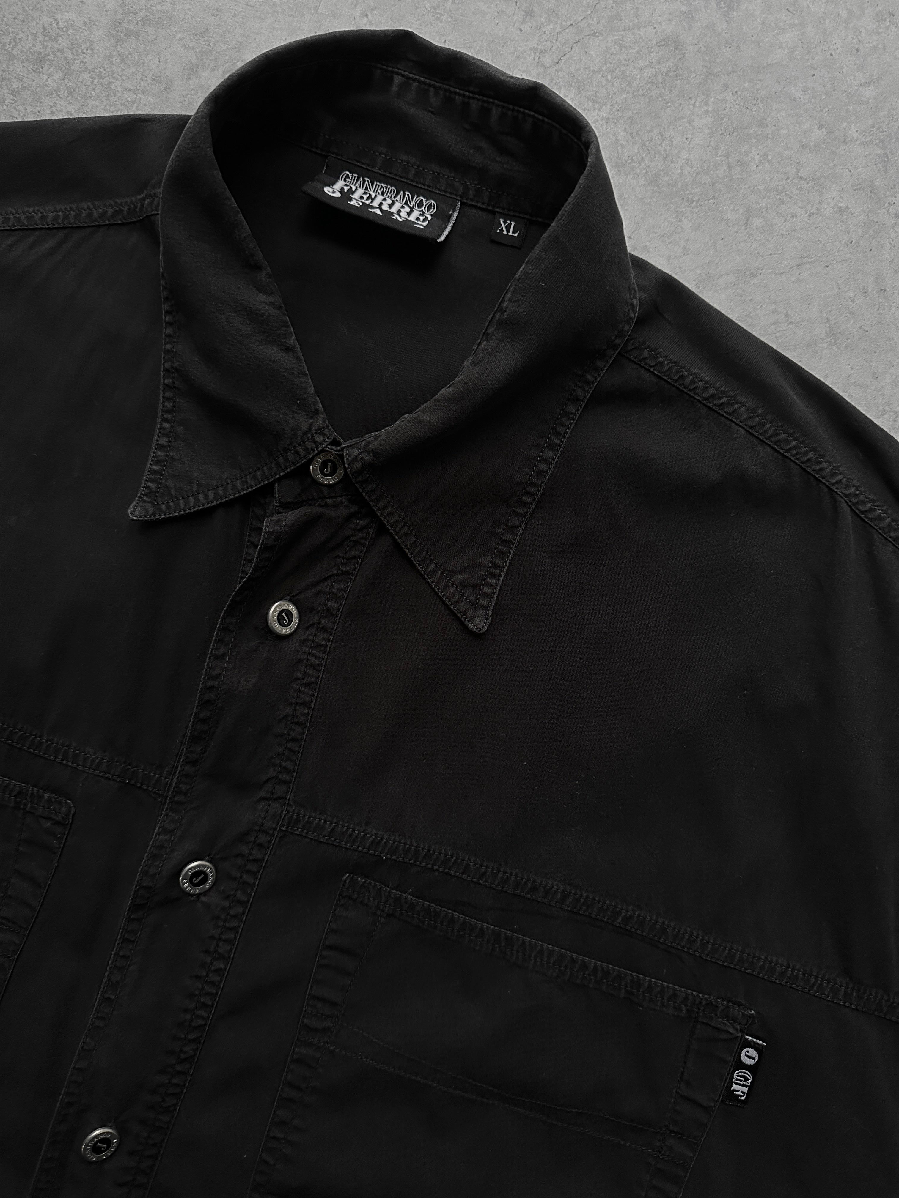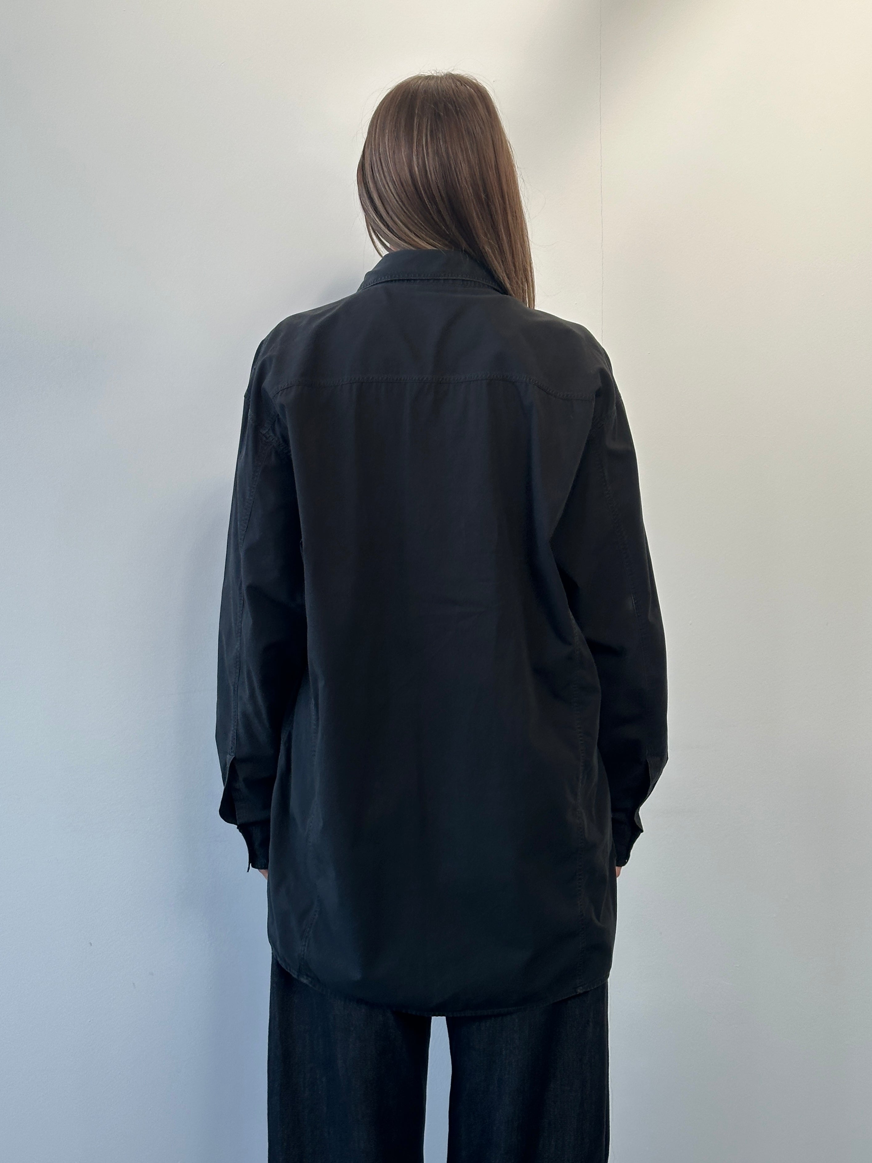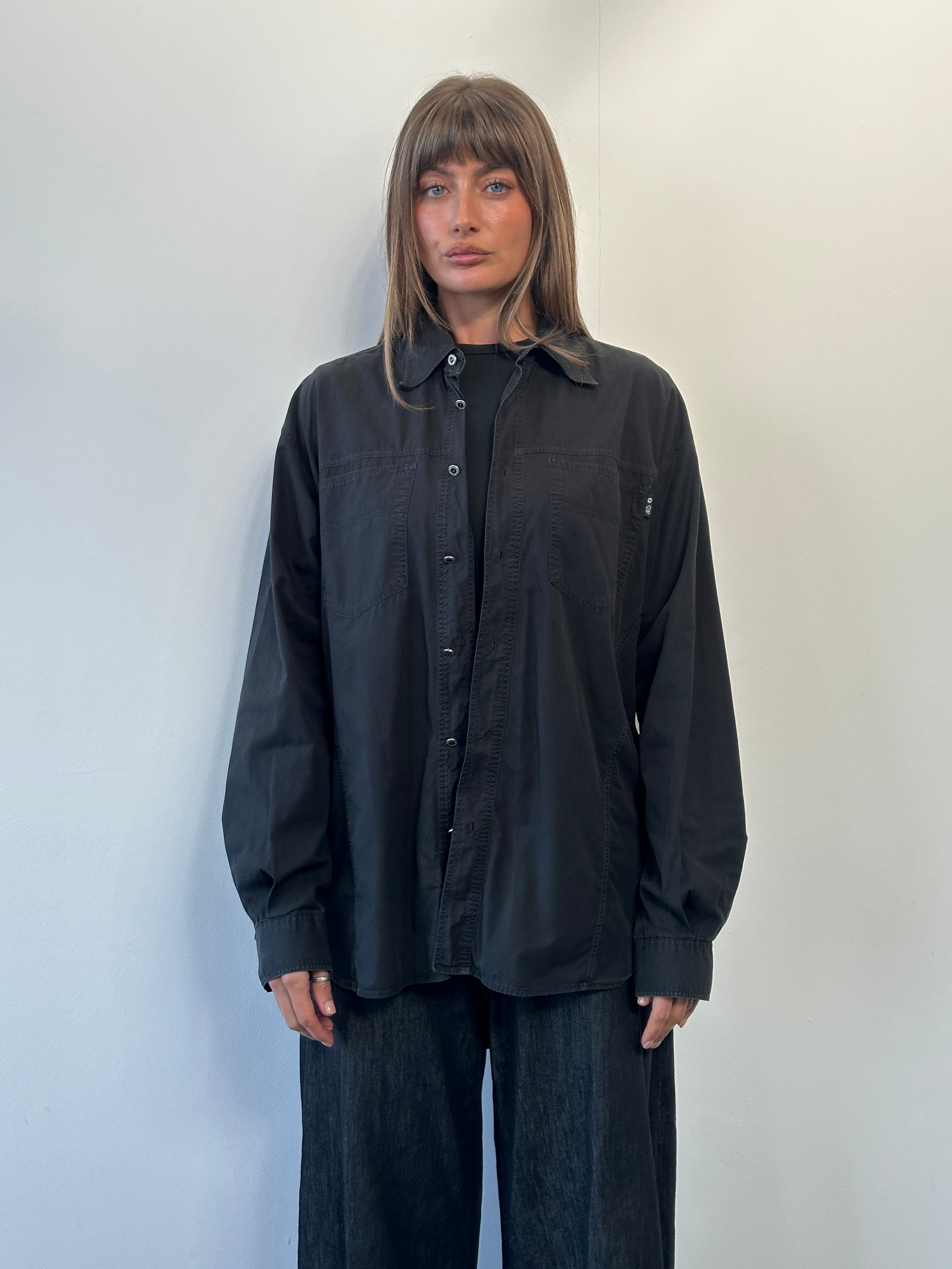 A soft washed black shirt with a relaxed oversized drape featuring bespoke Gianfranco Ferre metal buttons and dual chest pockets. A minimal everyday piece from the early 2000s Jeans line with a subtle utilitarian feel.