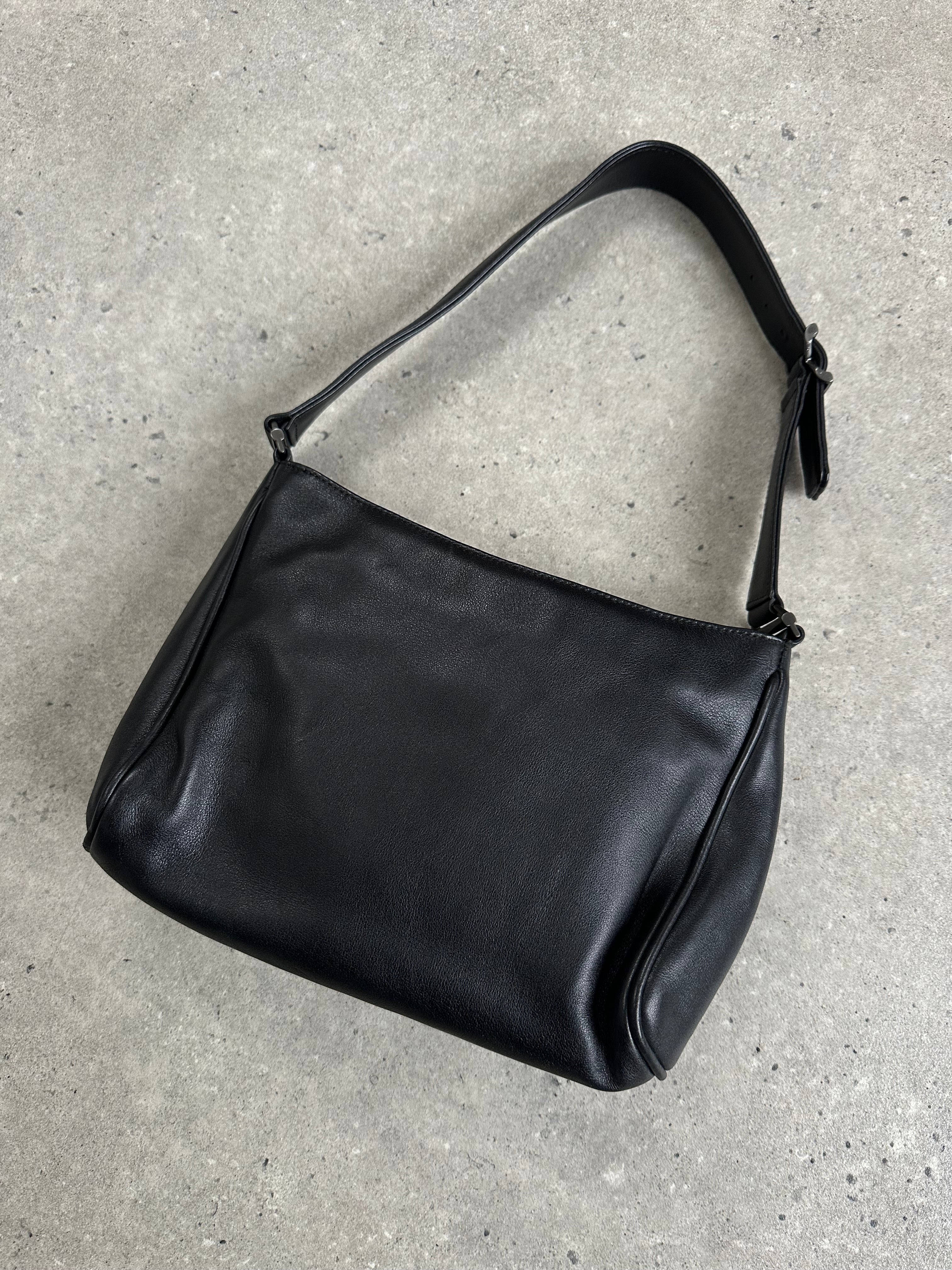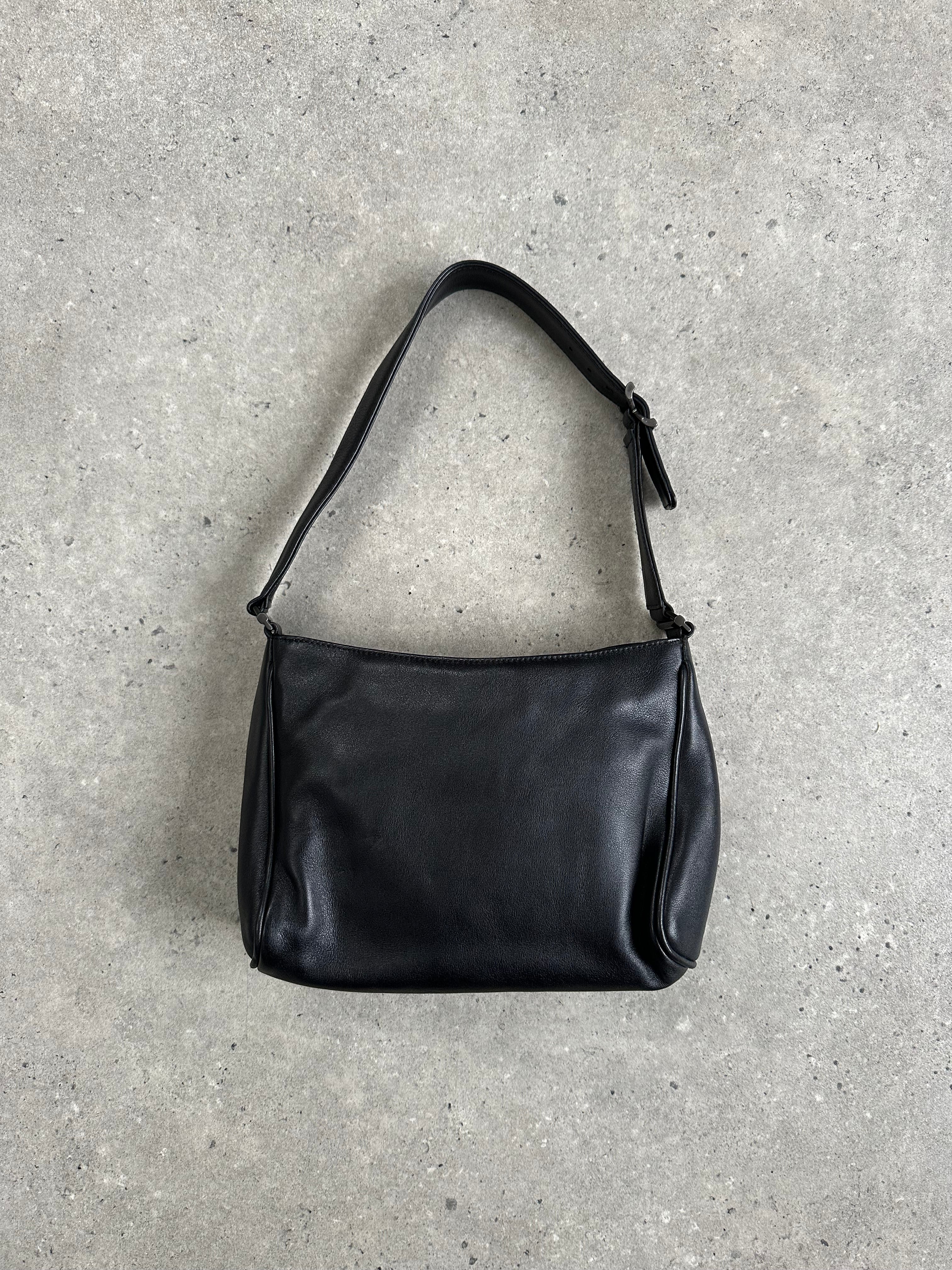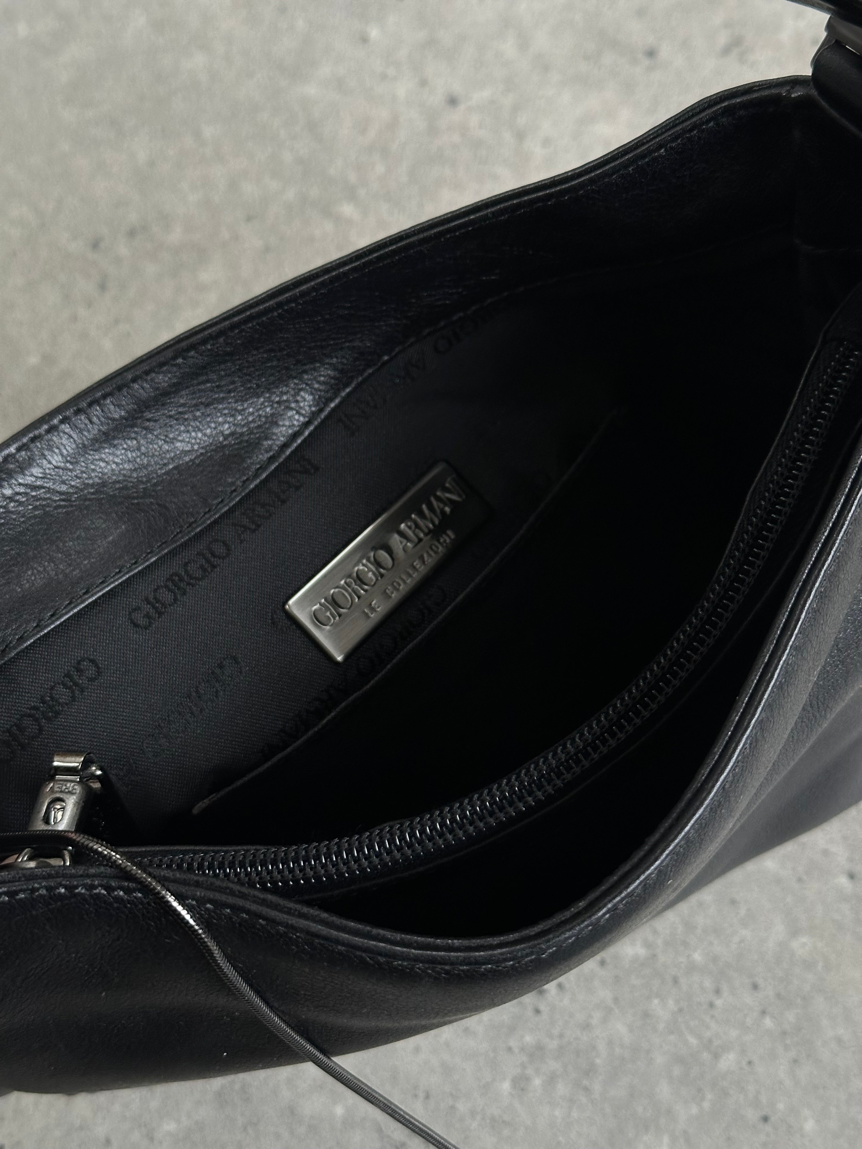 Giorgio Armani Le Collezioni black smooth leather shoulder bag designed with a soft structured silhouette and minimalist finish. Features an adjustable strap with embossed logo buckle, removable matching leather wallet and original Giorgio Armani dust bag. Clean, understated proportions ideal for everyday wear.