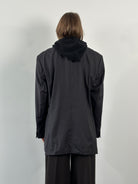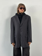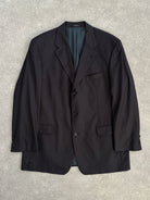 A vintage 1990s Hugo Boss single breasted blazer in a deep black tone, cut from pure wool using Loro Piana Super 110s Twister fabric. A structured tailored silhouette with a refined quiet luxury feel.