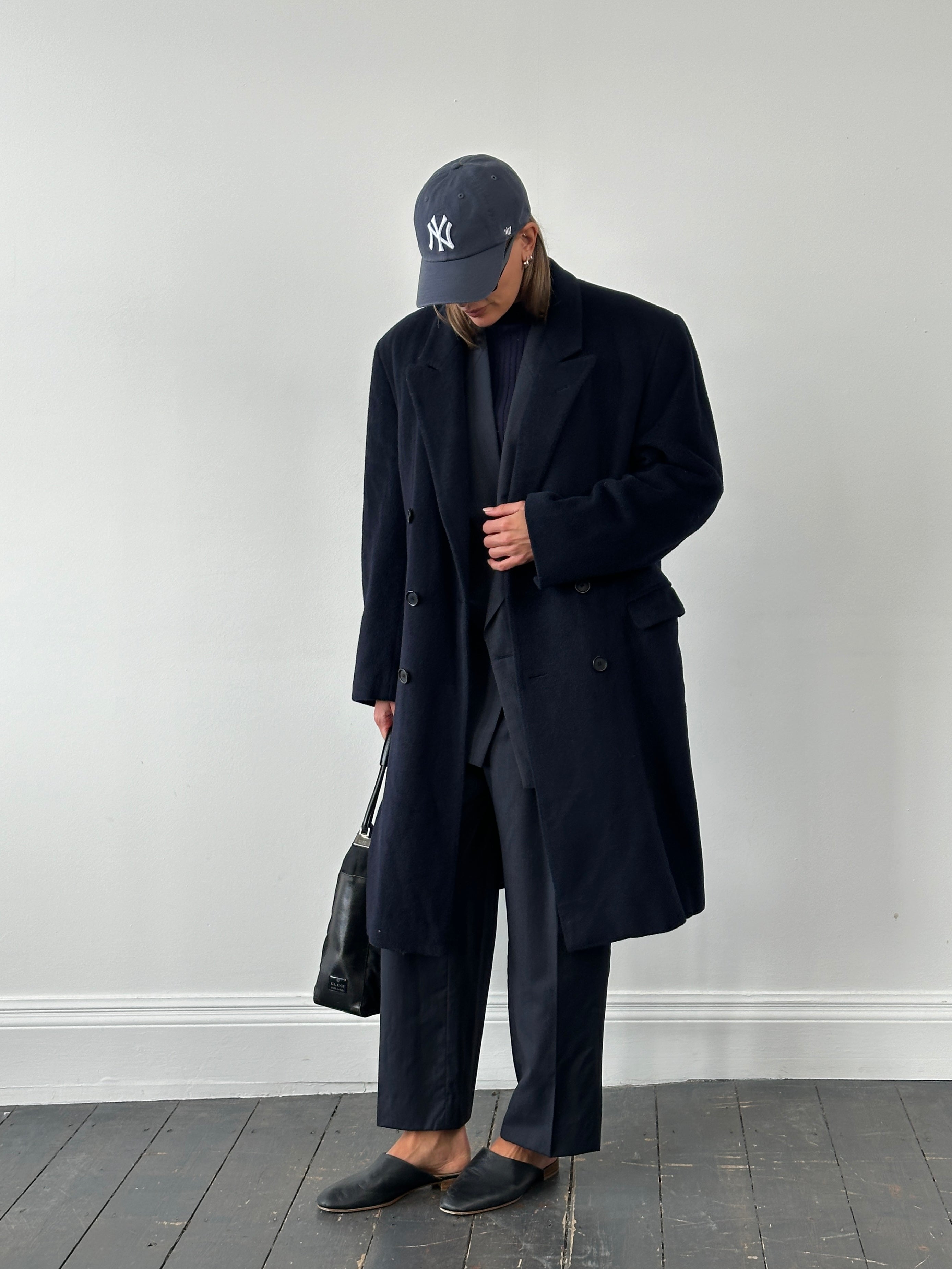 Italian vintage double breasted navy outerwear coat from the 1990s with a brushed wool finish and high neck button fastening, designed with a clean tailored silhouette.