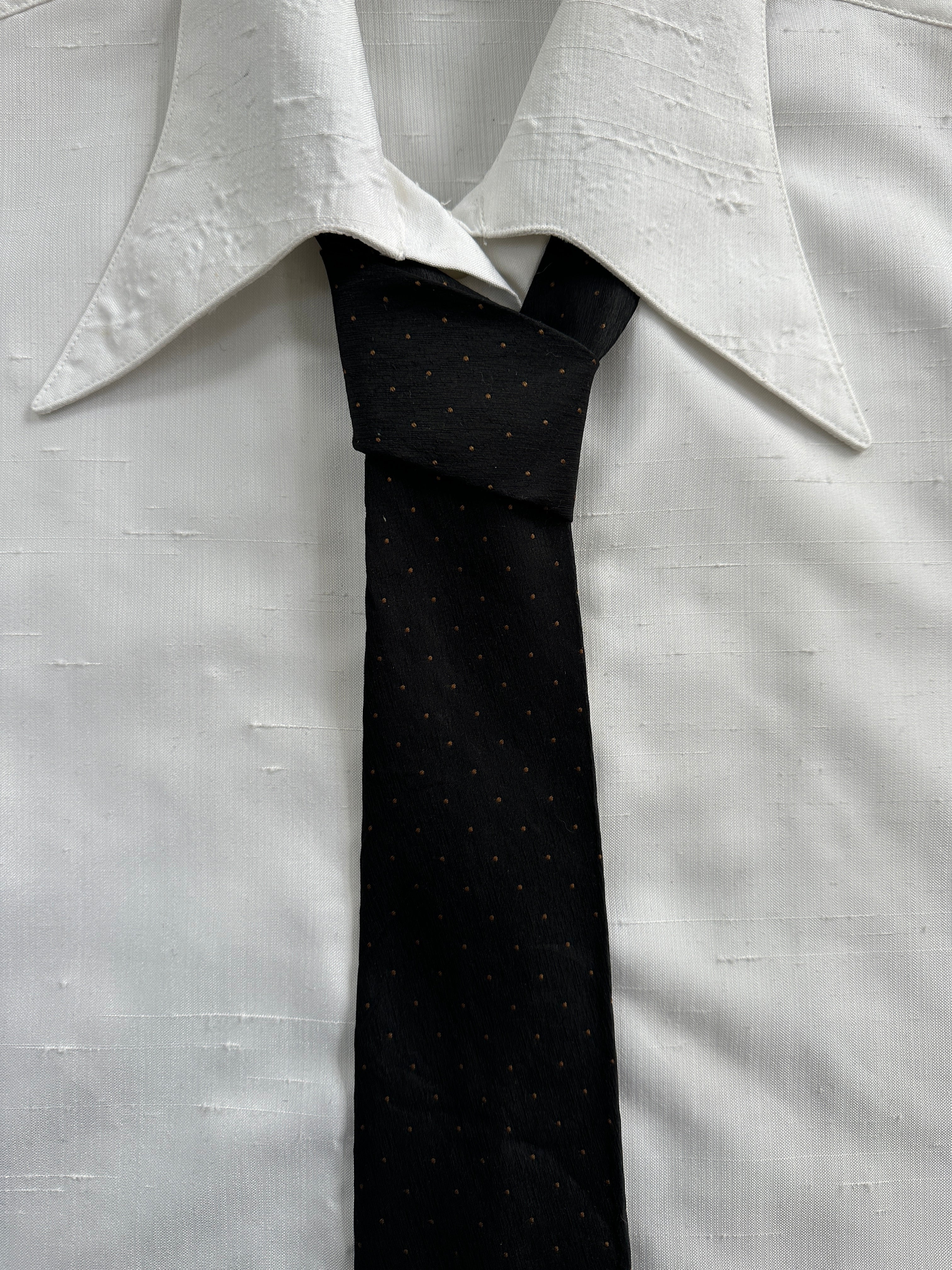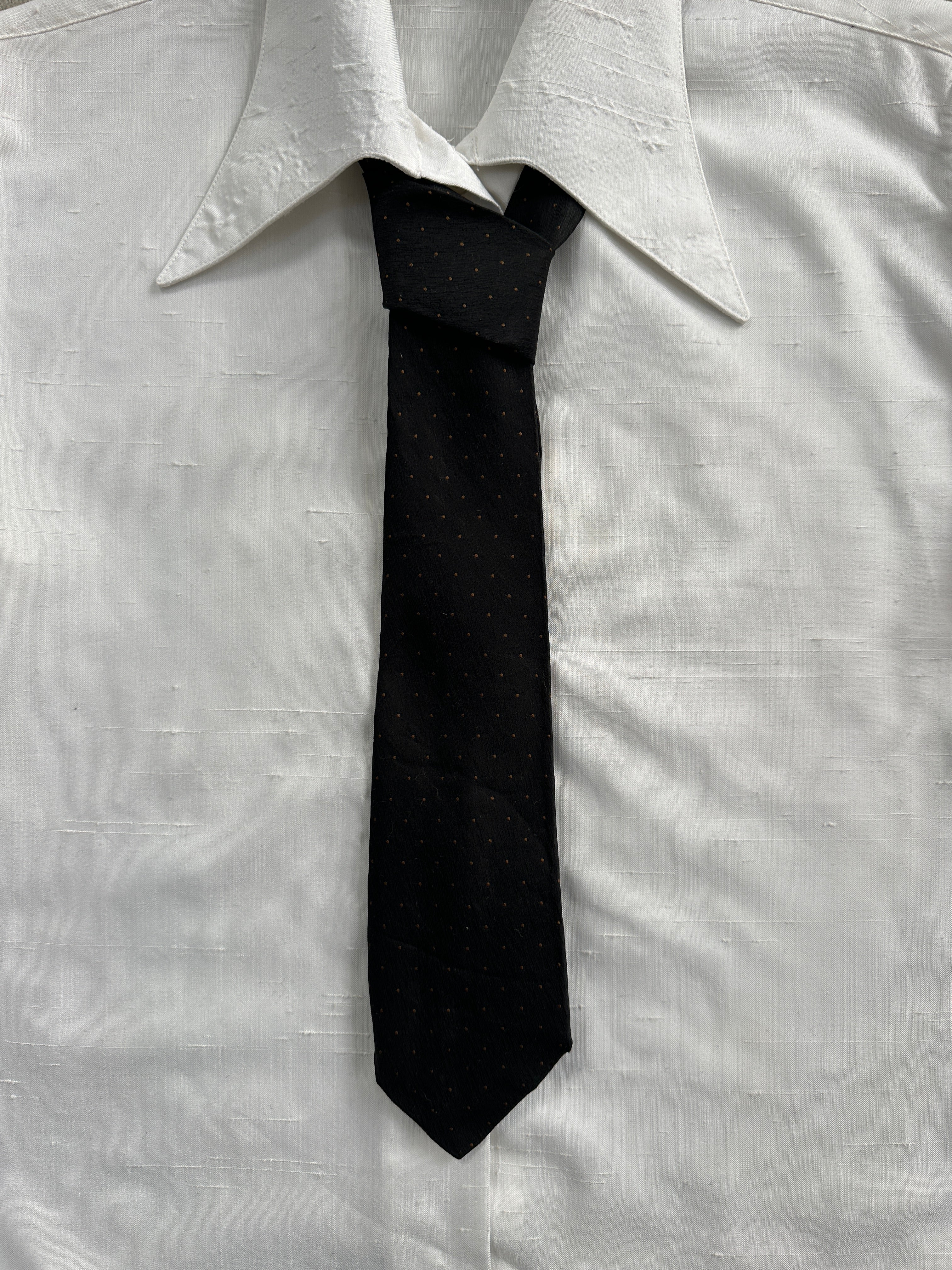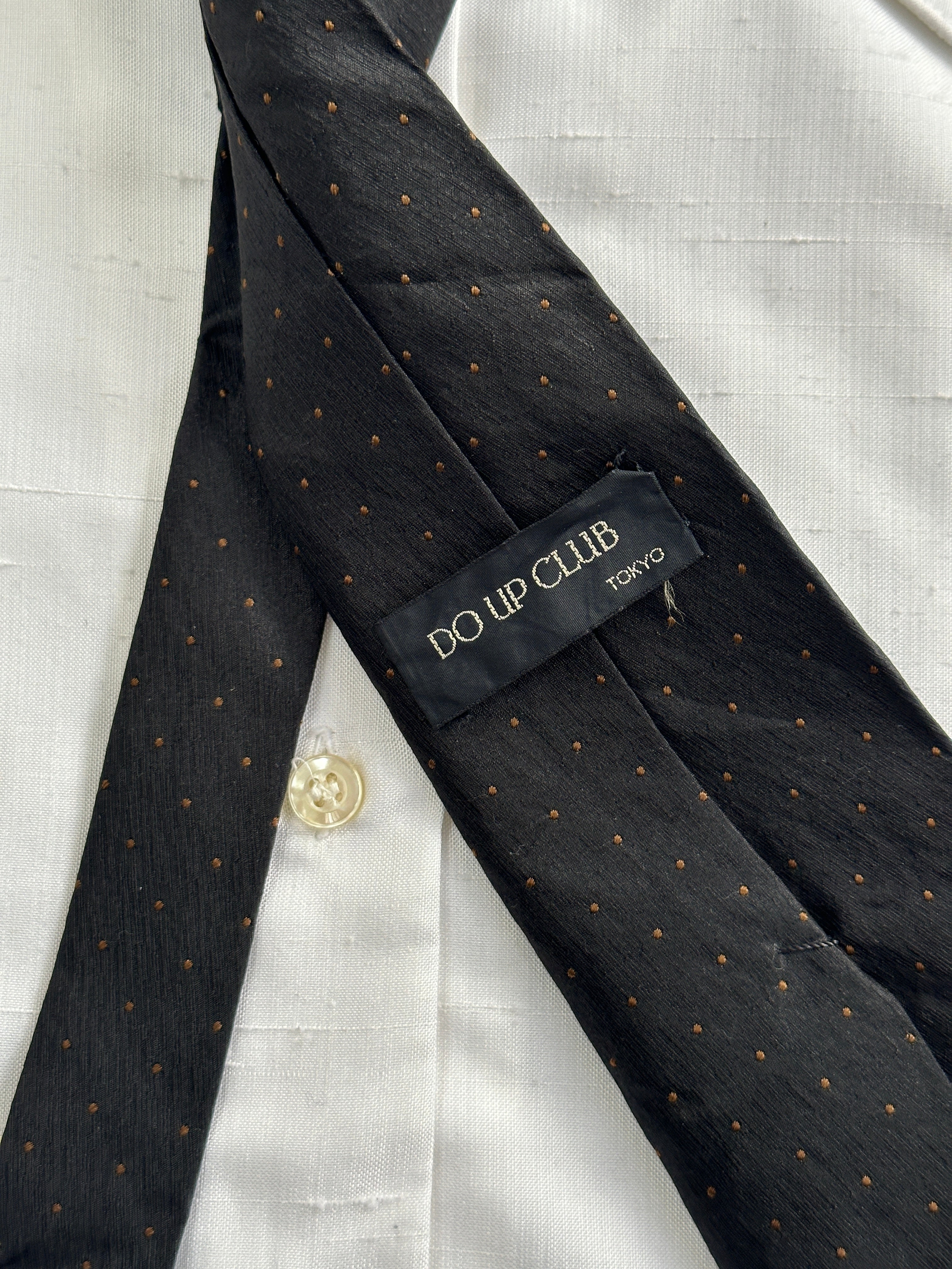 A refined vintage Japanese silk tie by Do Up Club Tokyo, finished in deep black with subtle brown pin-dot detailing. A restrained pattern that works seamlessly with both classic tailoring and modern minimalist suiting.