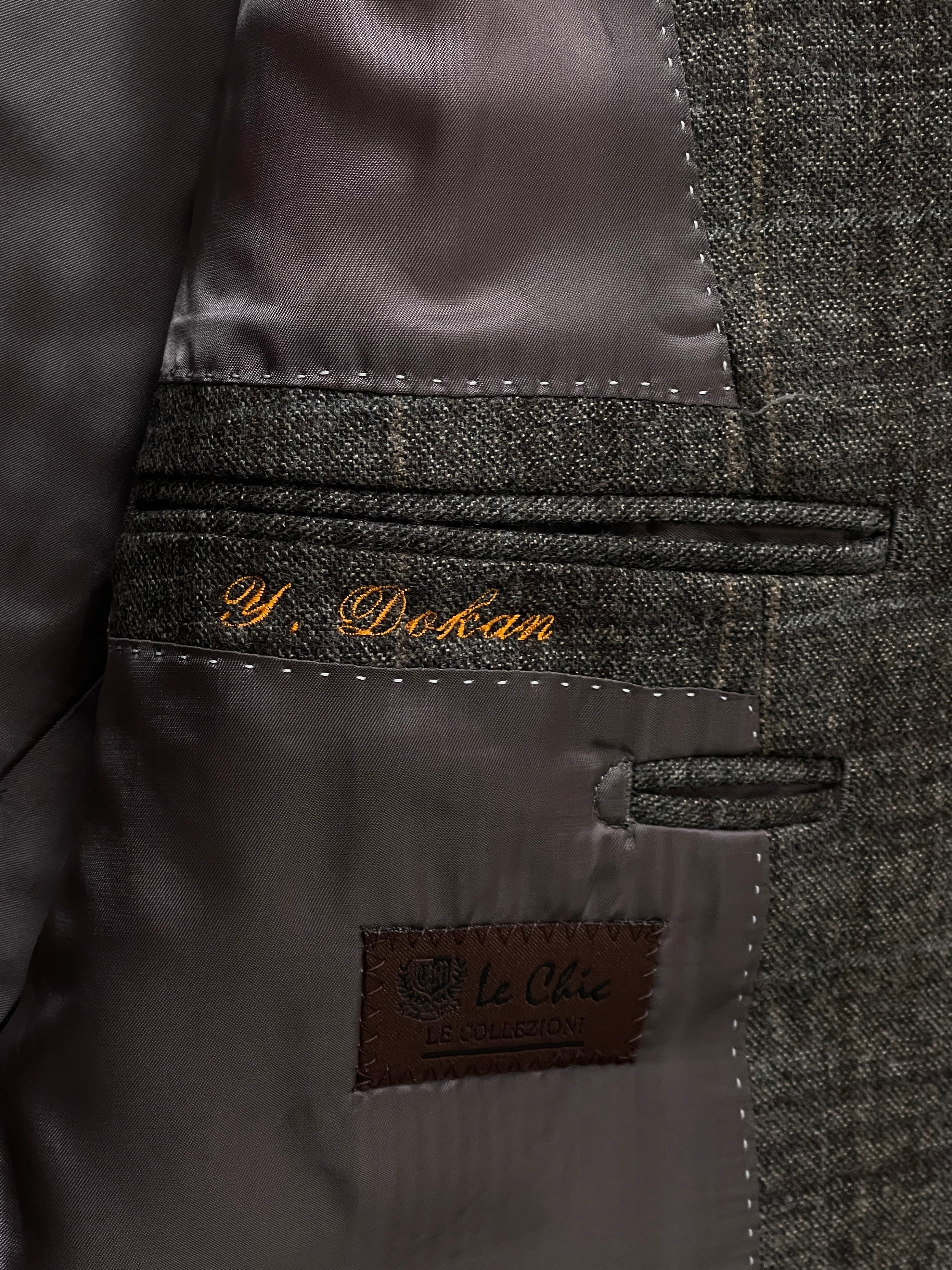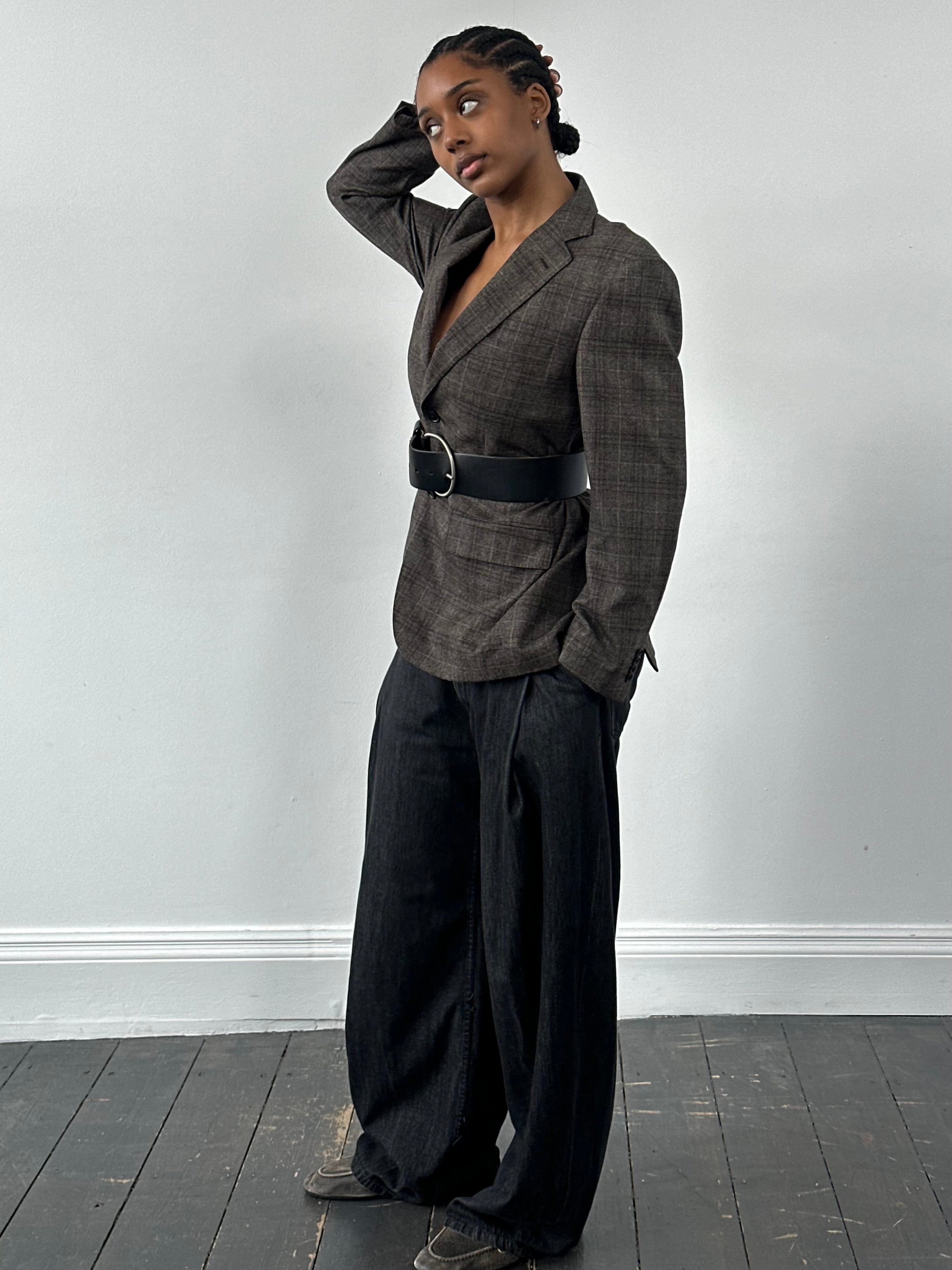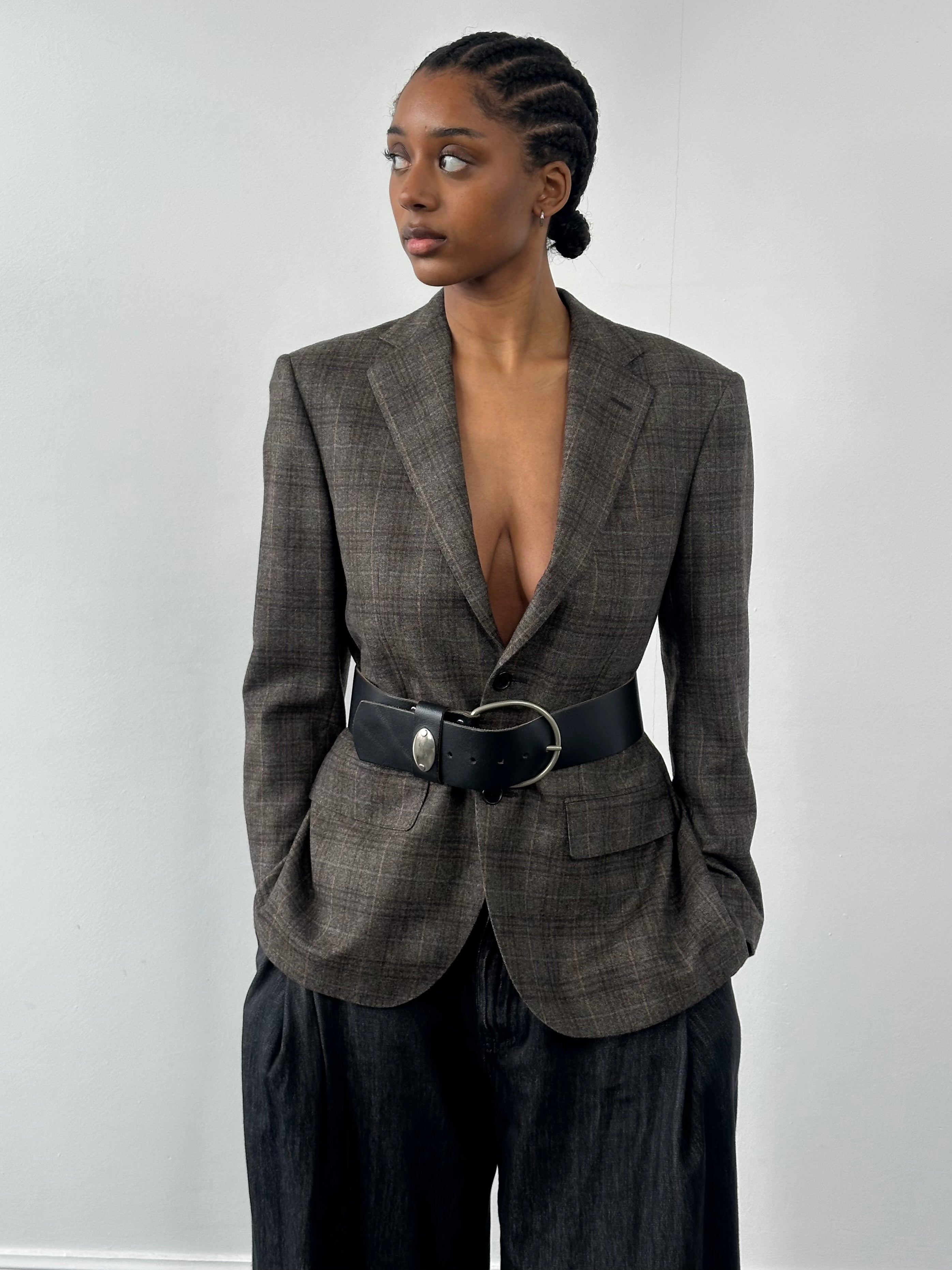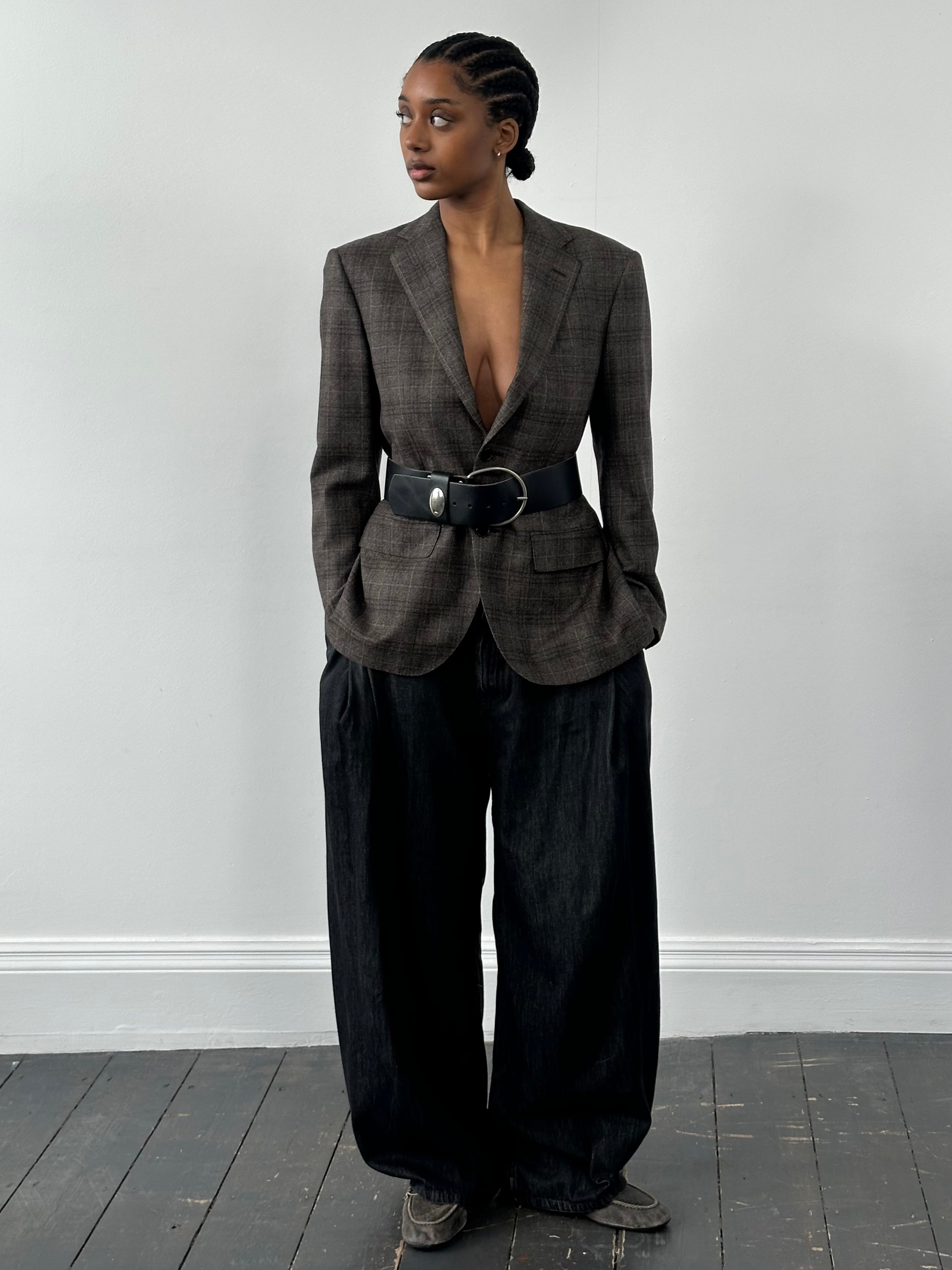 Le Chic x Loro Piana 1990s single breasted blazer in brown check Super 120s soft wool, woven by Loro Piana. Features a soft tailored silhouette with structured shoulders, notch lapels and classic flap pockets.