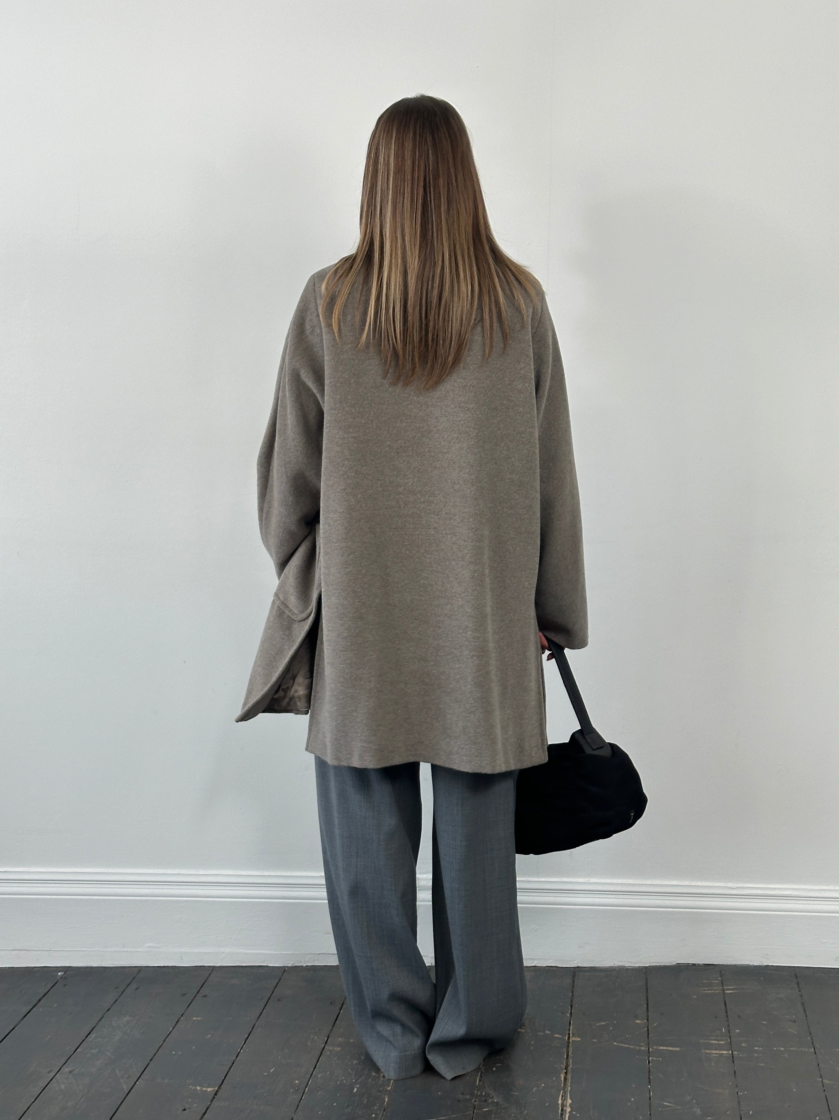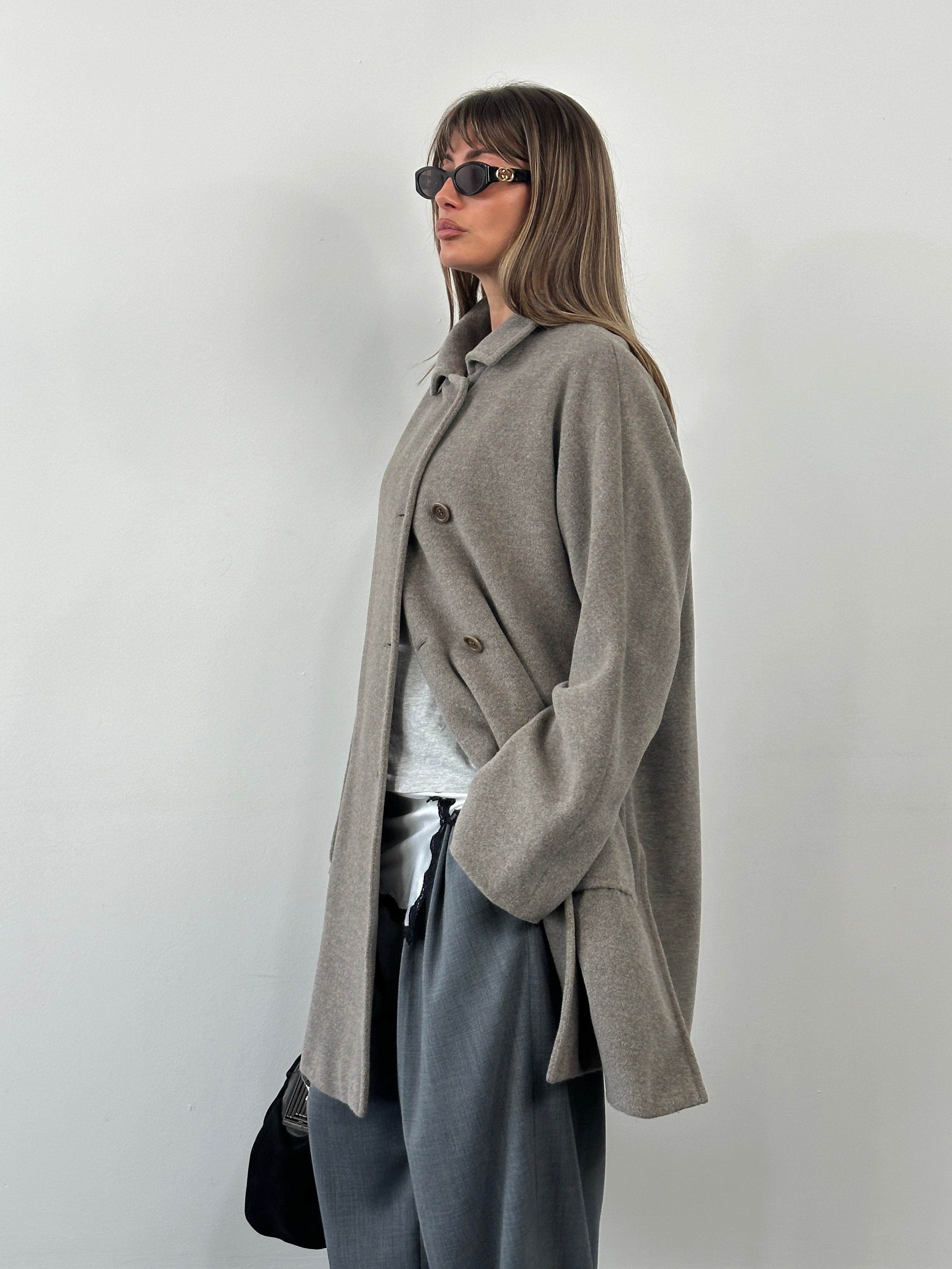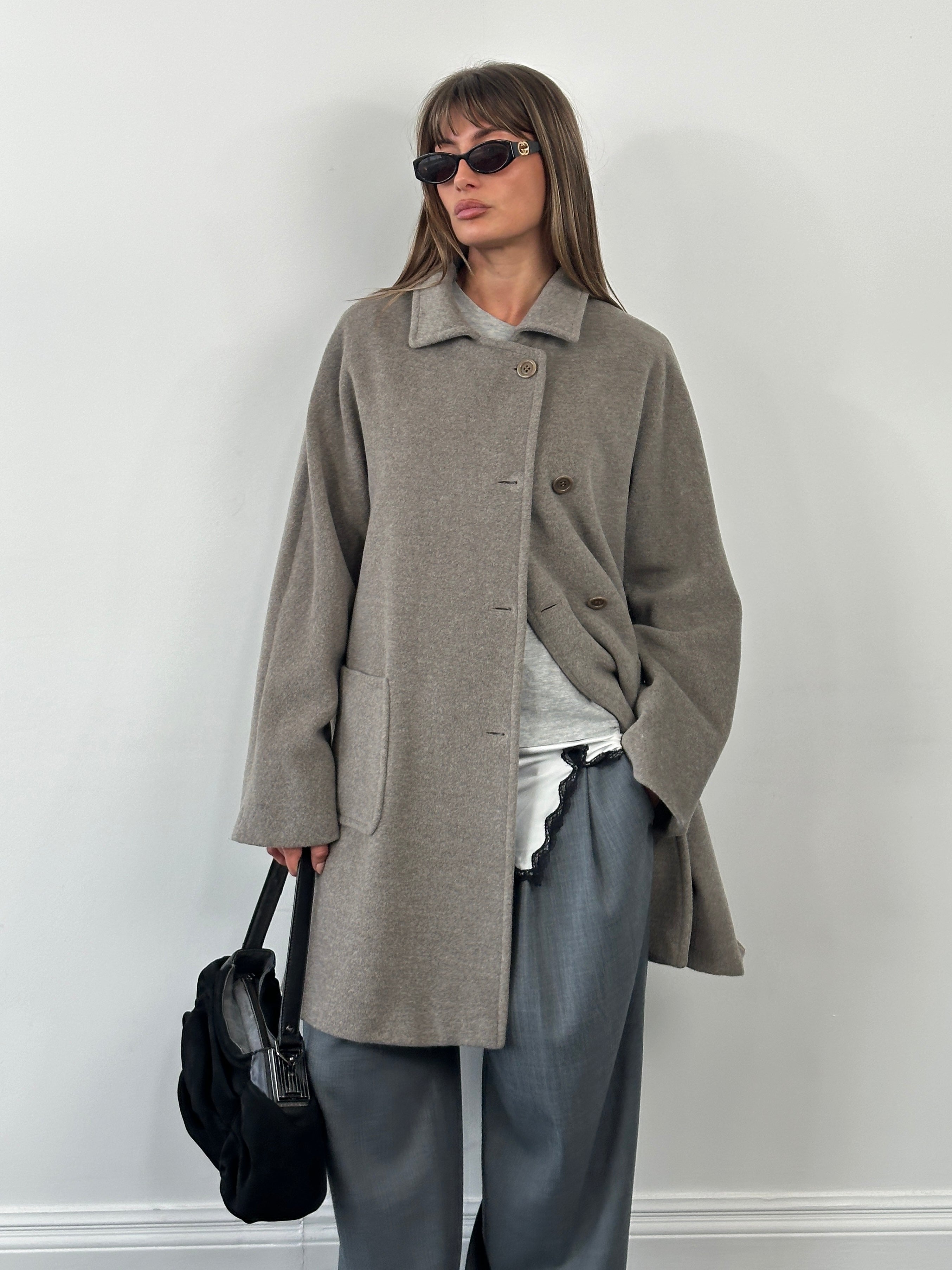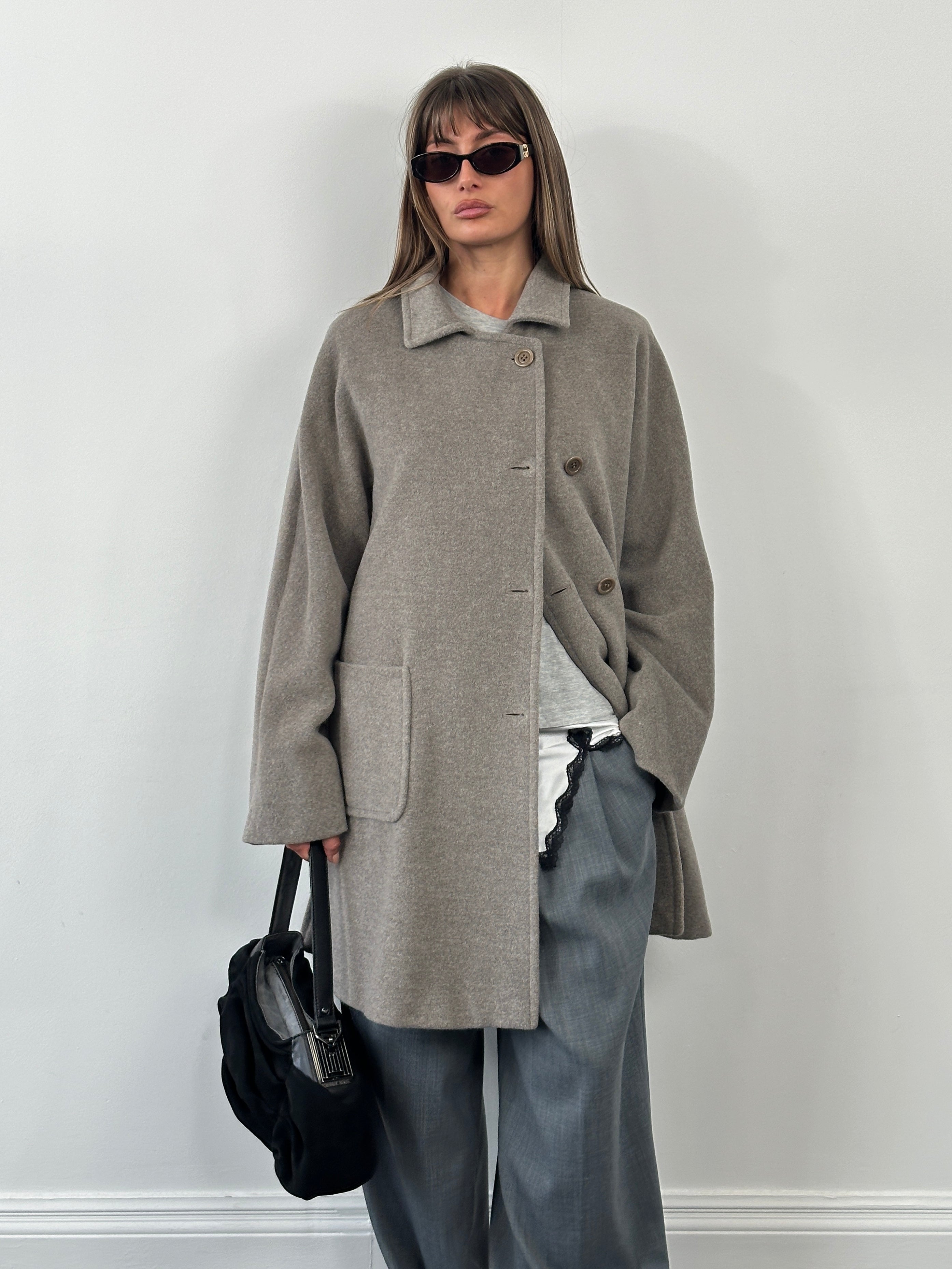 Vintage Marella by Max Mara single breasted coat with a clean tailored silhouette and removable faux fur collar. Designed with a classic straight cut and practical front pockets, finished in a soft taupe tone typical of refined Italian outerwear from the 1990s.