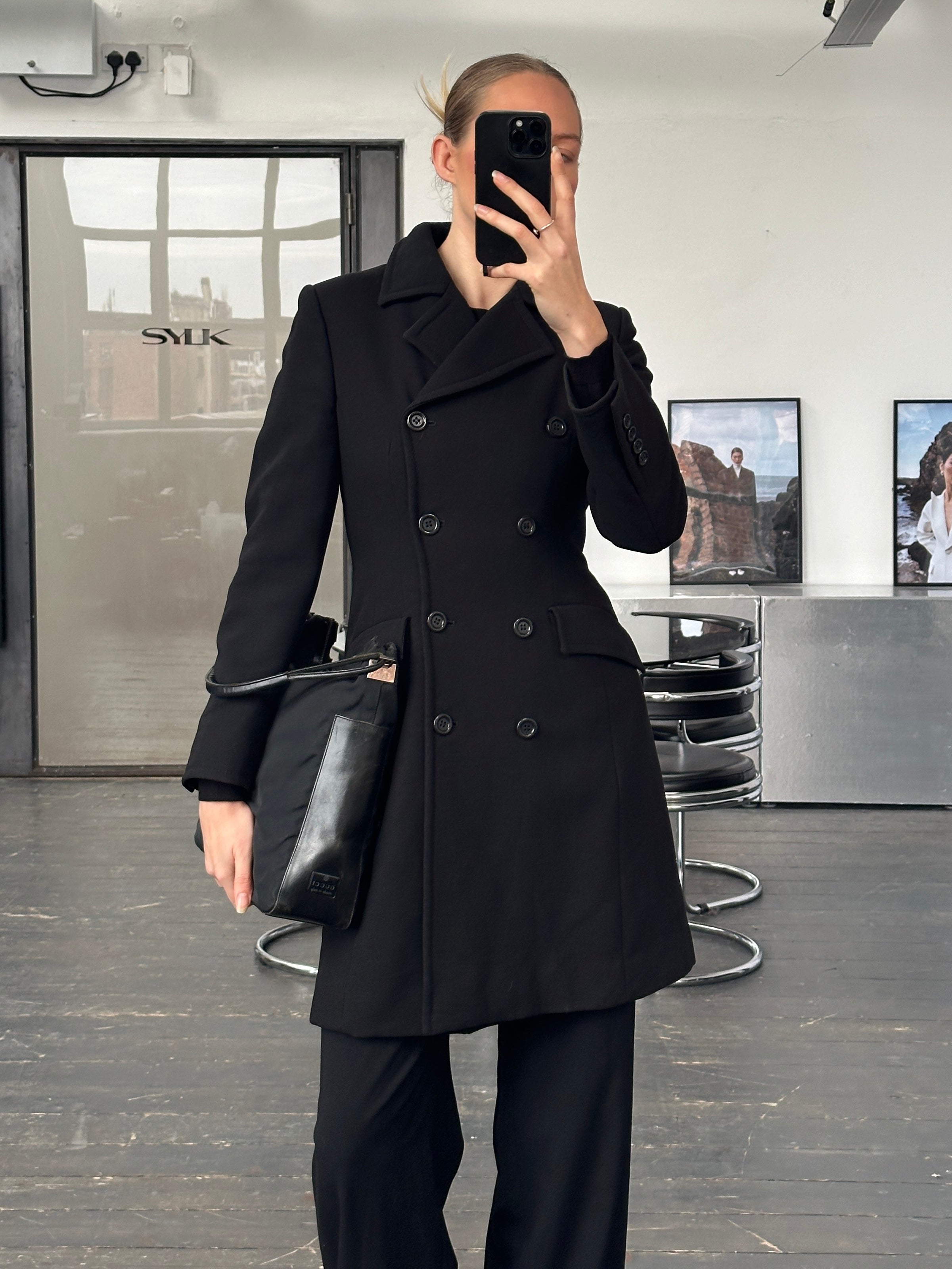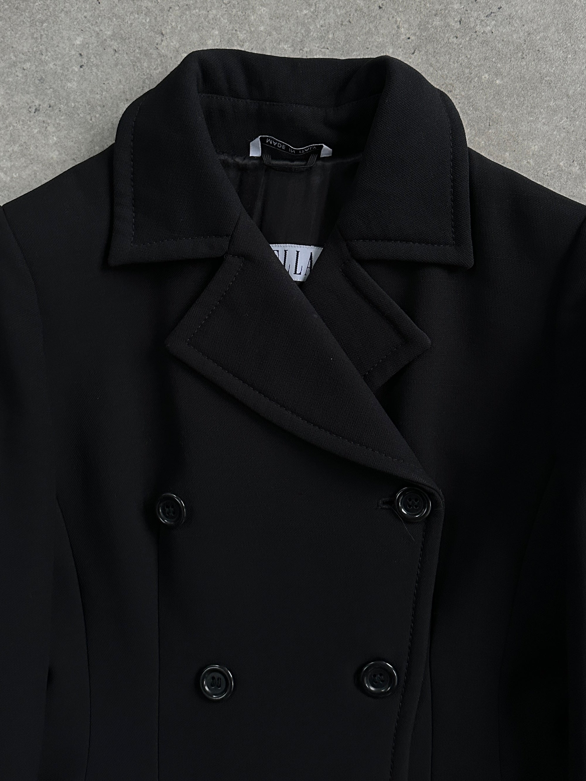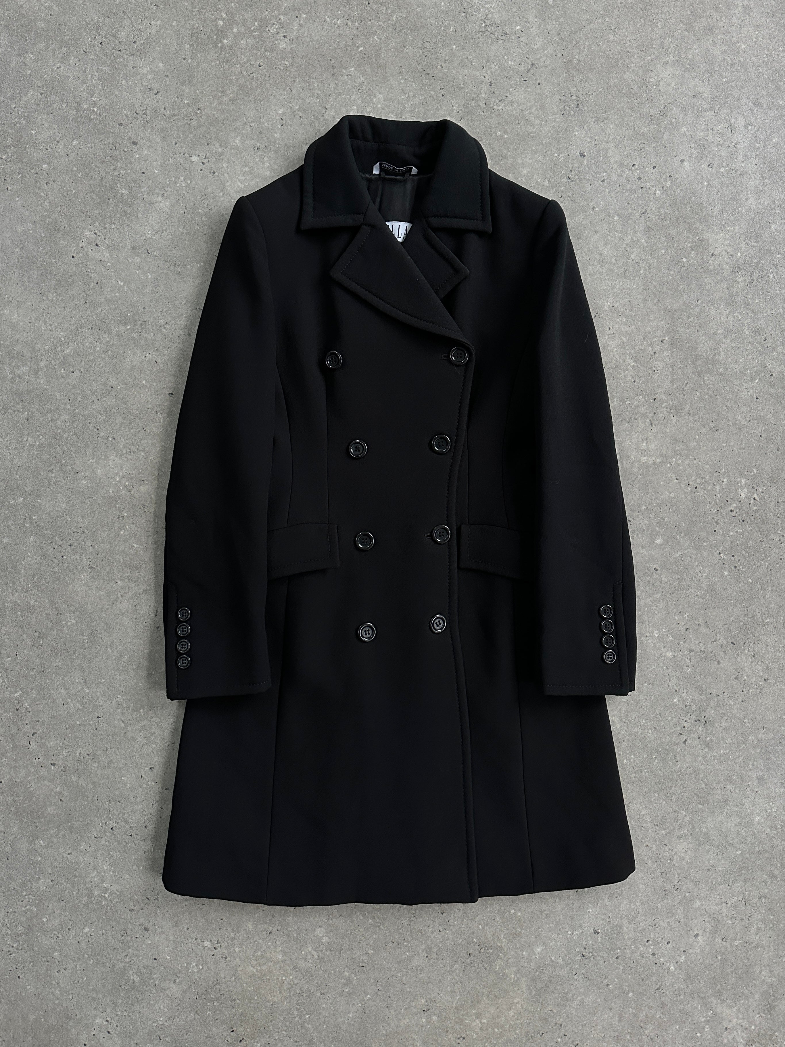 A vintage 2000s Marella double breasted tailored coat in a deep black. A clean feminine silhouette with sharp stitching and a refined, quietly structured finish.