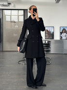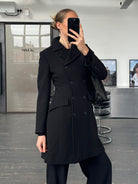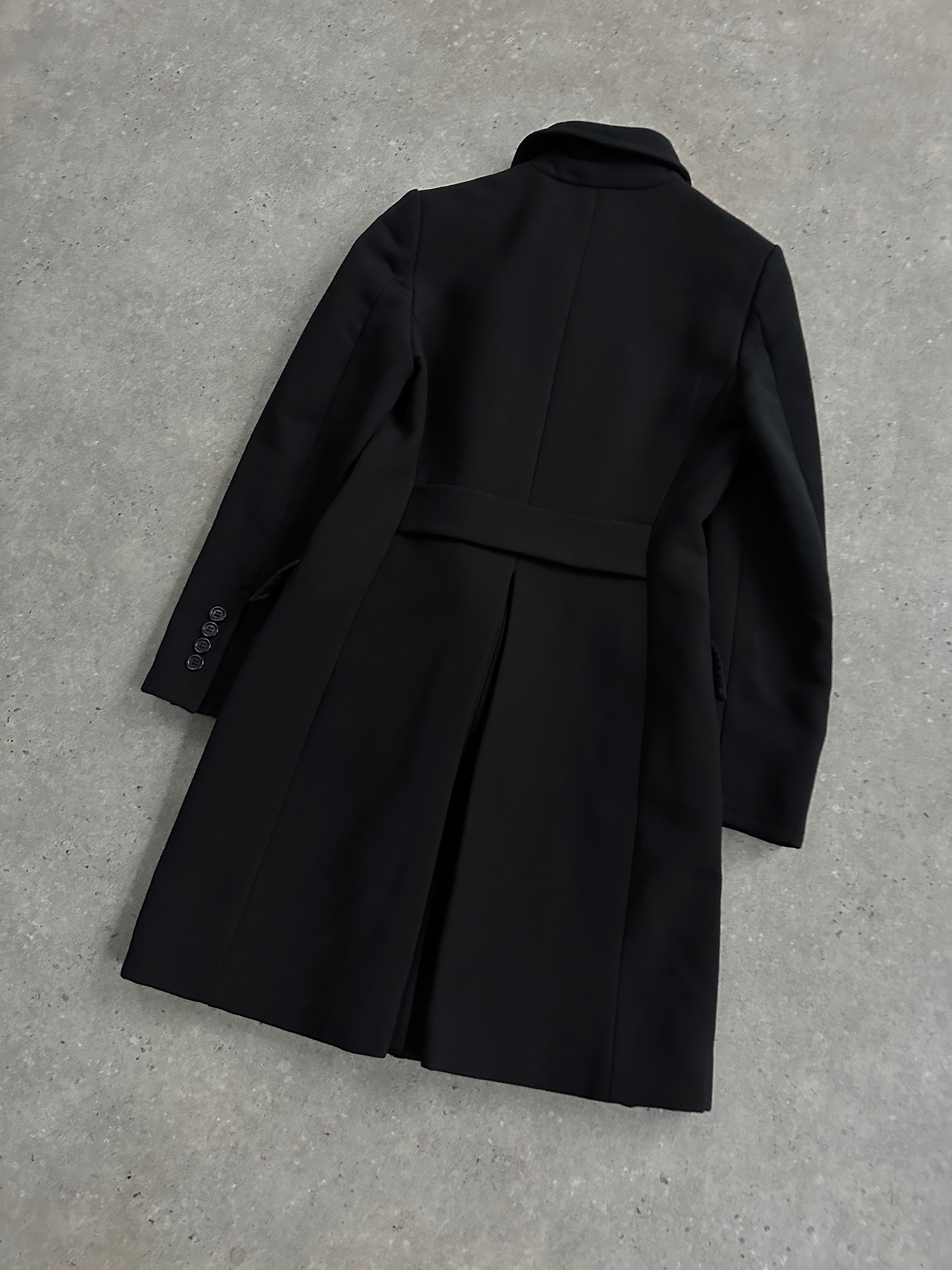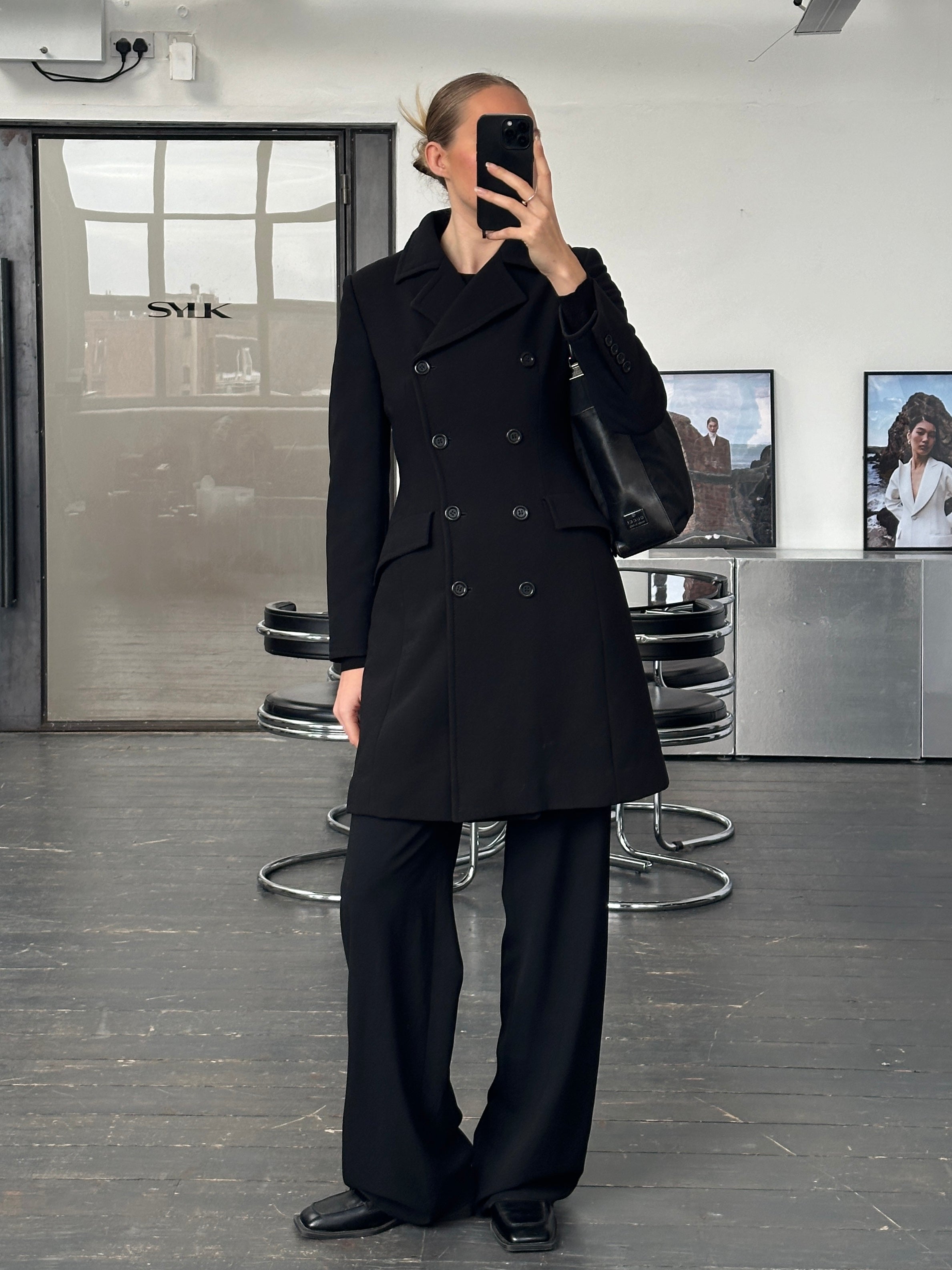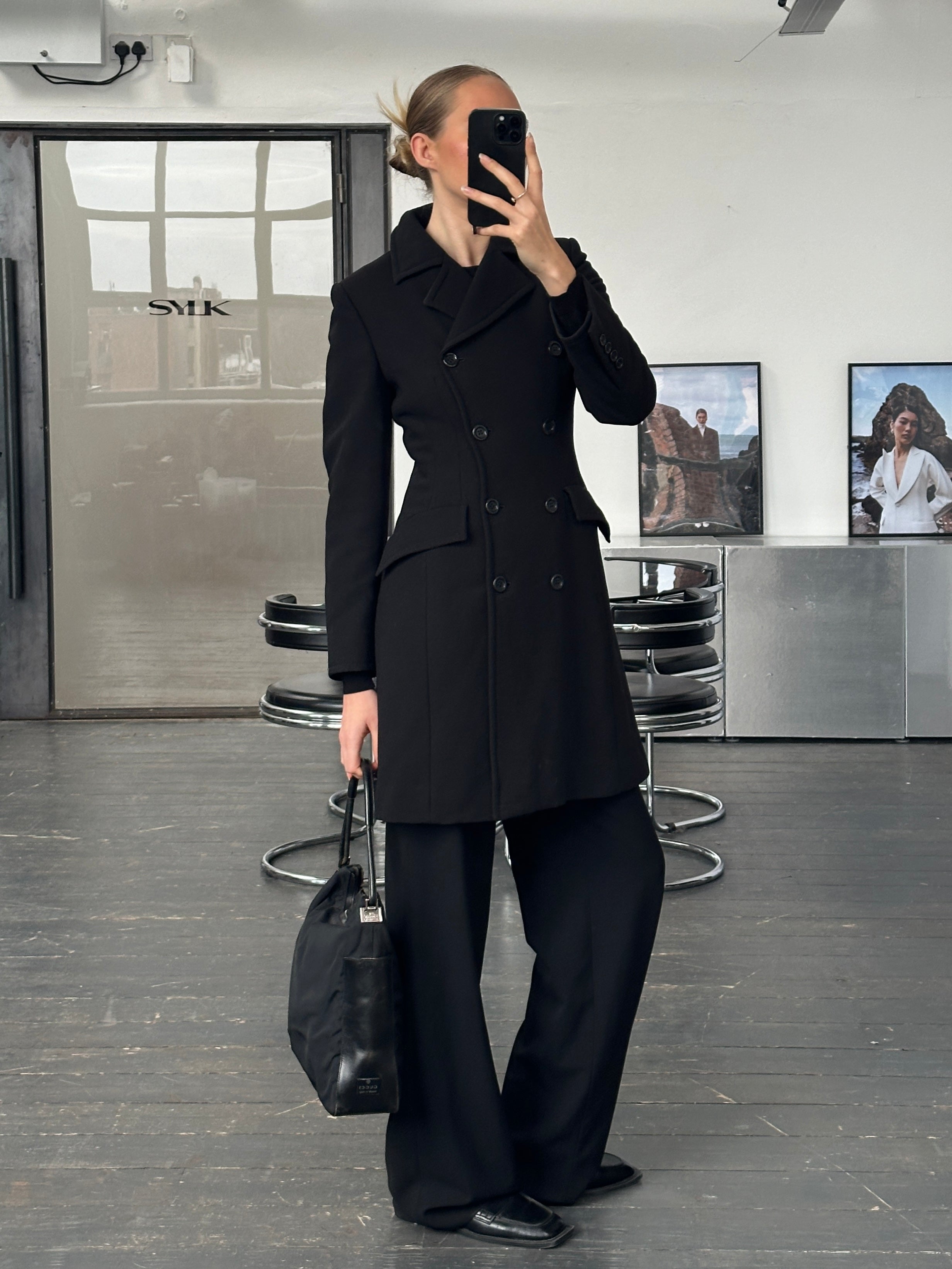 A vintage 2000s Marella double breasted tailored coat in a deep black. A clean feminine silhouette with sharp stitching and a refined, quietly structured finish.