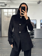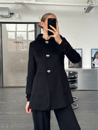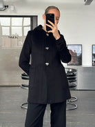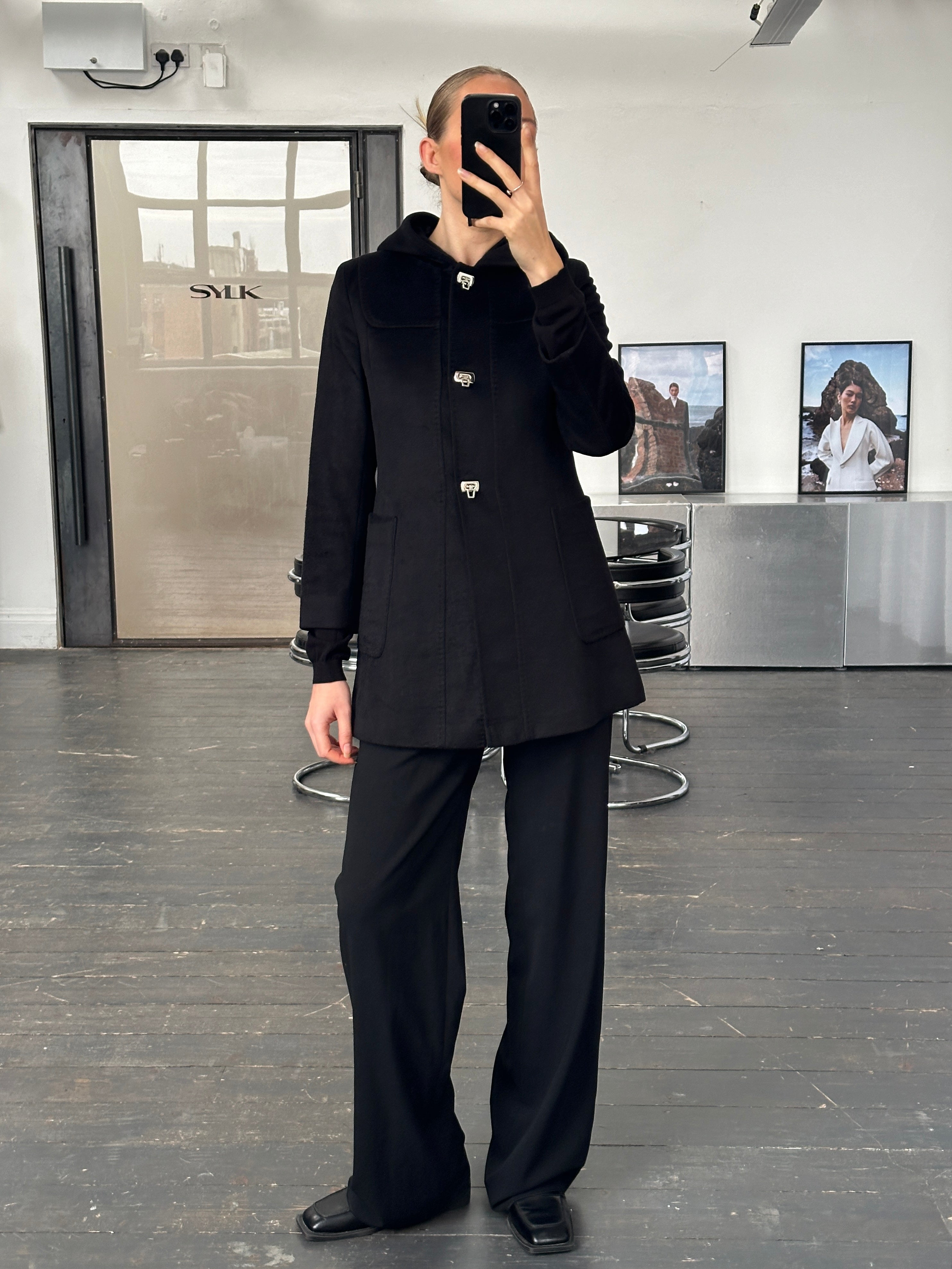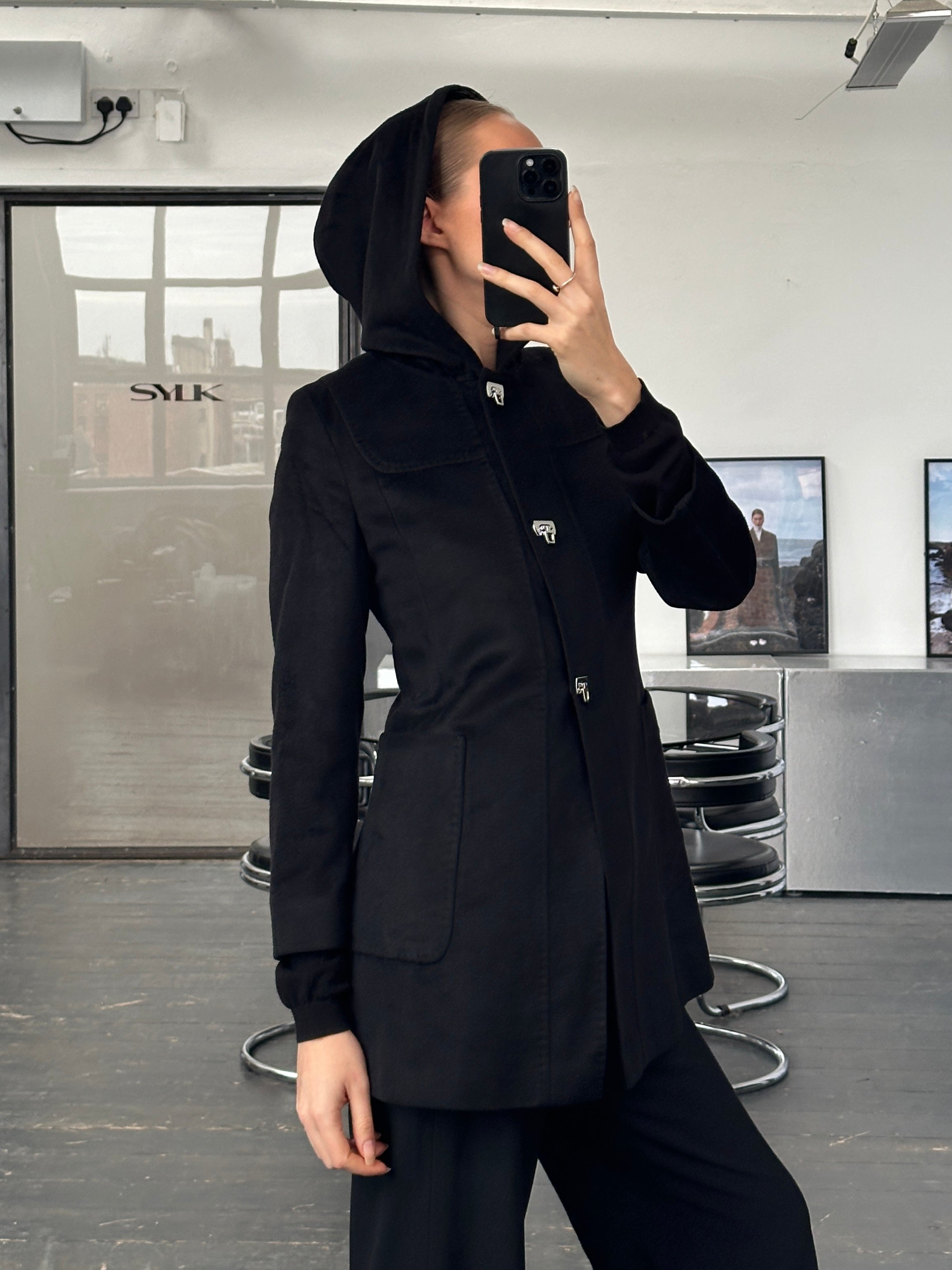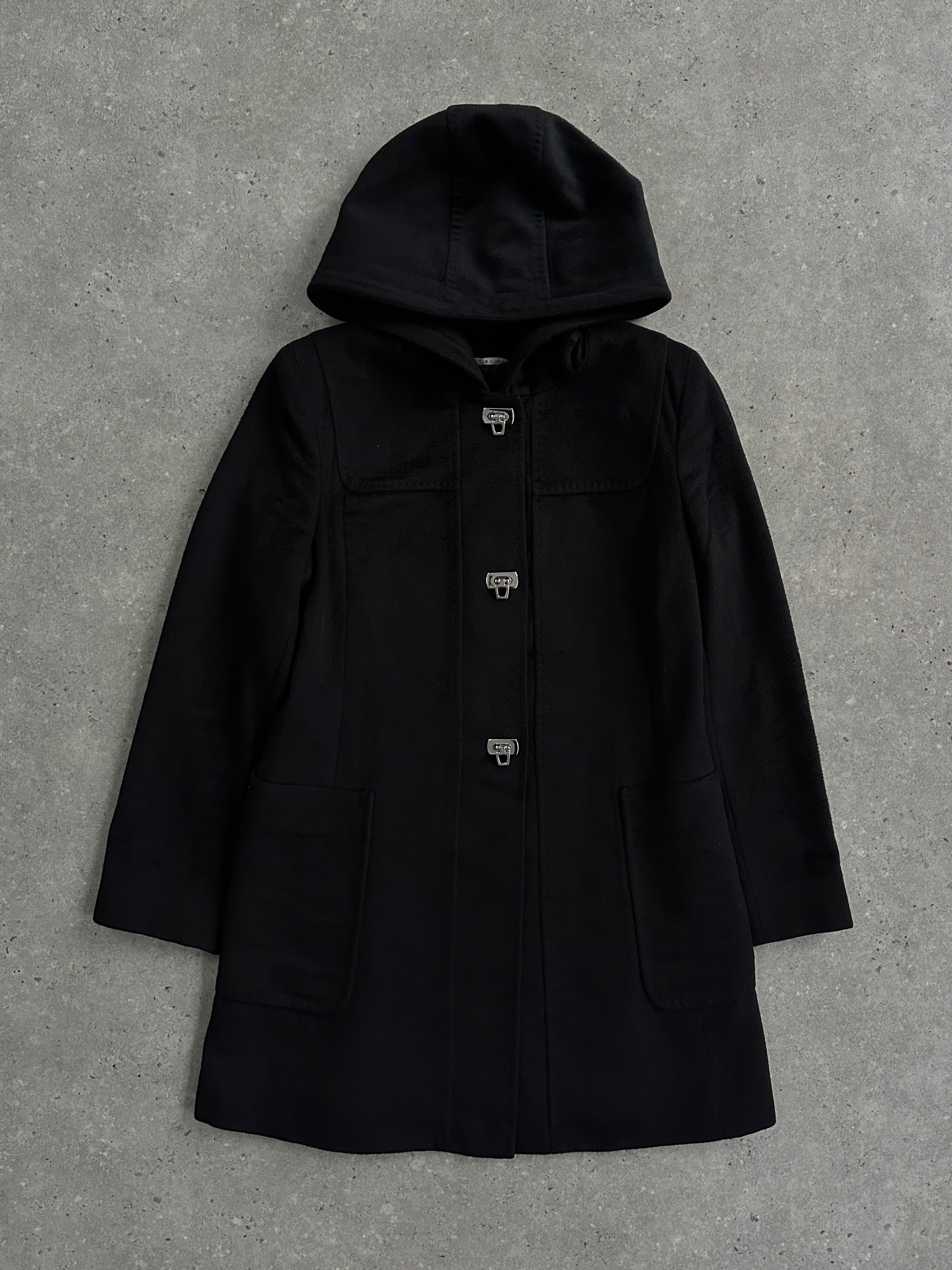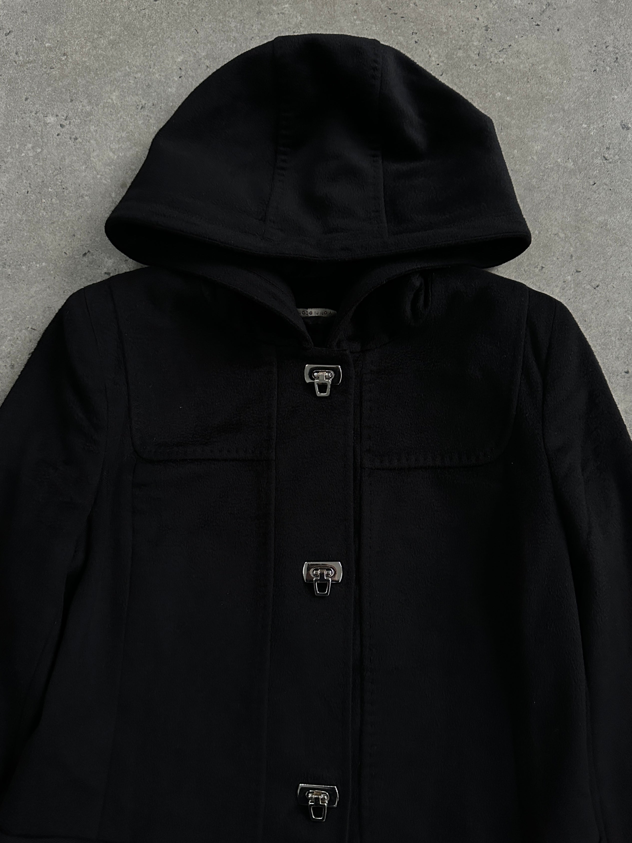 A vintage 2000s Max Mara Studio hooded coat in a deep black tone, crafted from pure brushed wool. A clean, minimal silhouette elevated by sculptural silver hardware and a refined monogram lining.