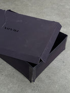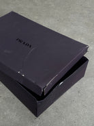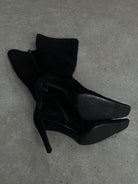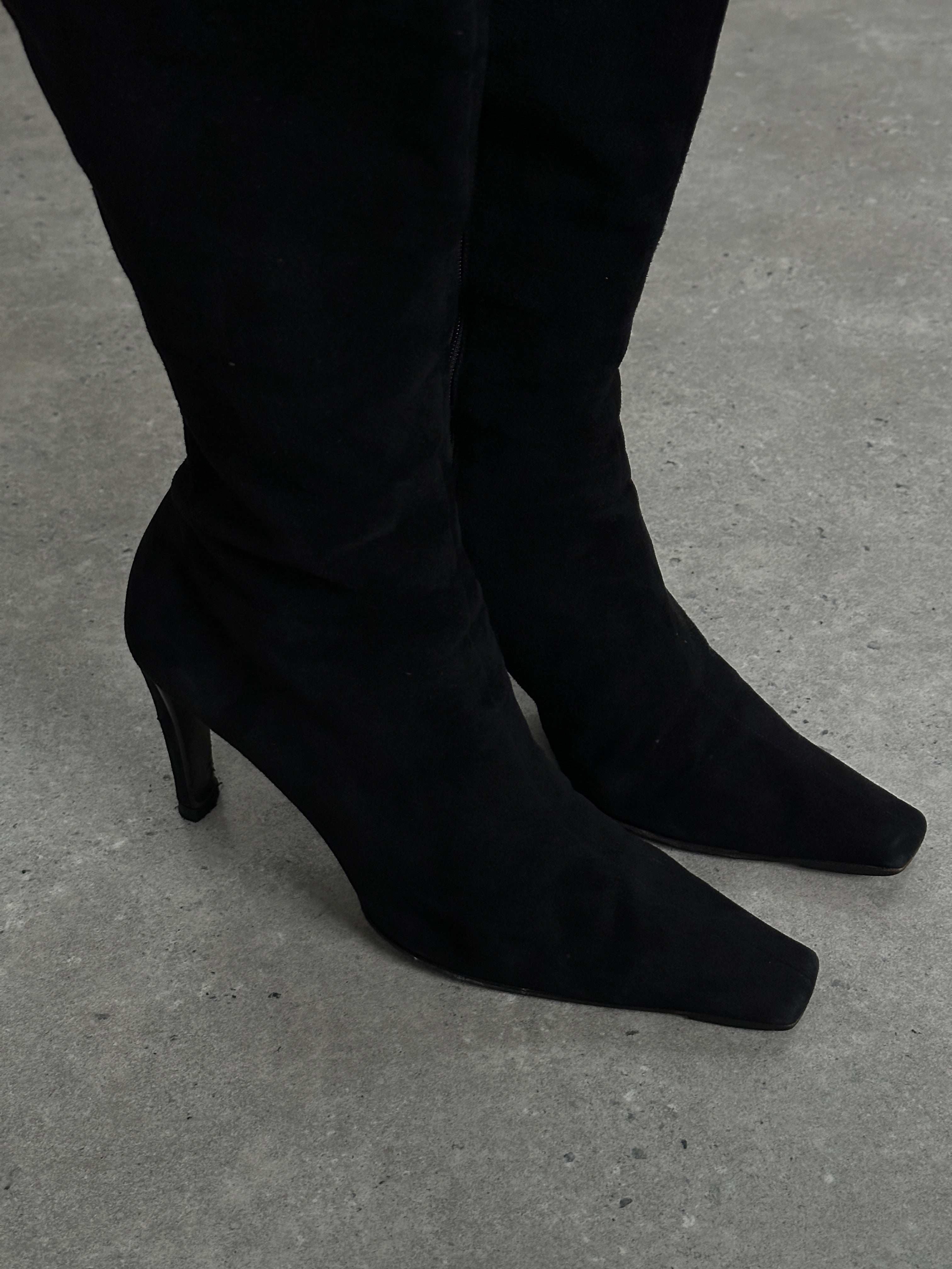 Vintage 2000s Prada square toe heeled knee boots in black velvety goatskin suede. A sharp elongated silhouette that reflects Prada’s refined Y2K footwear design language.