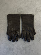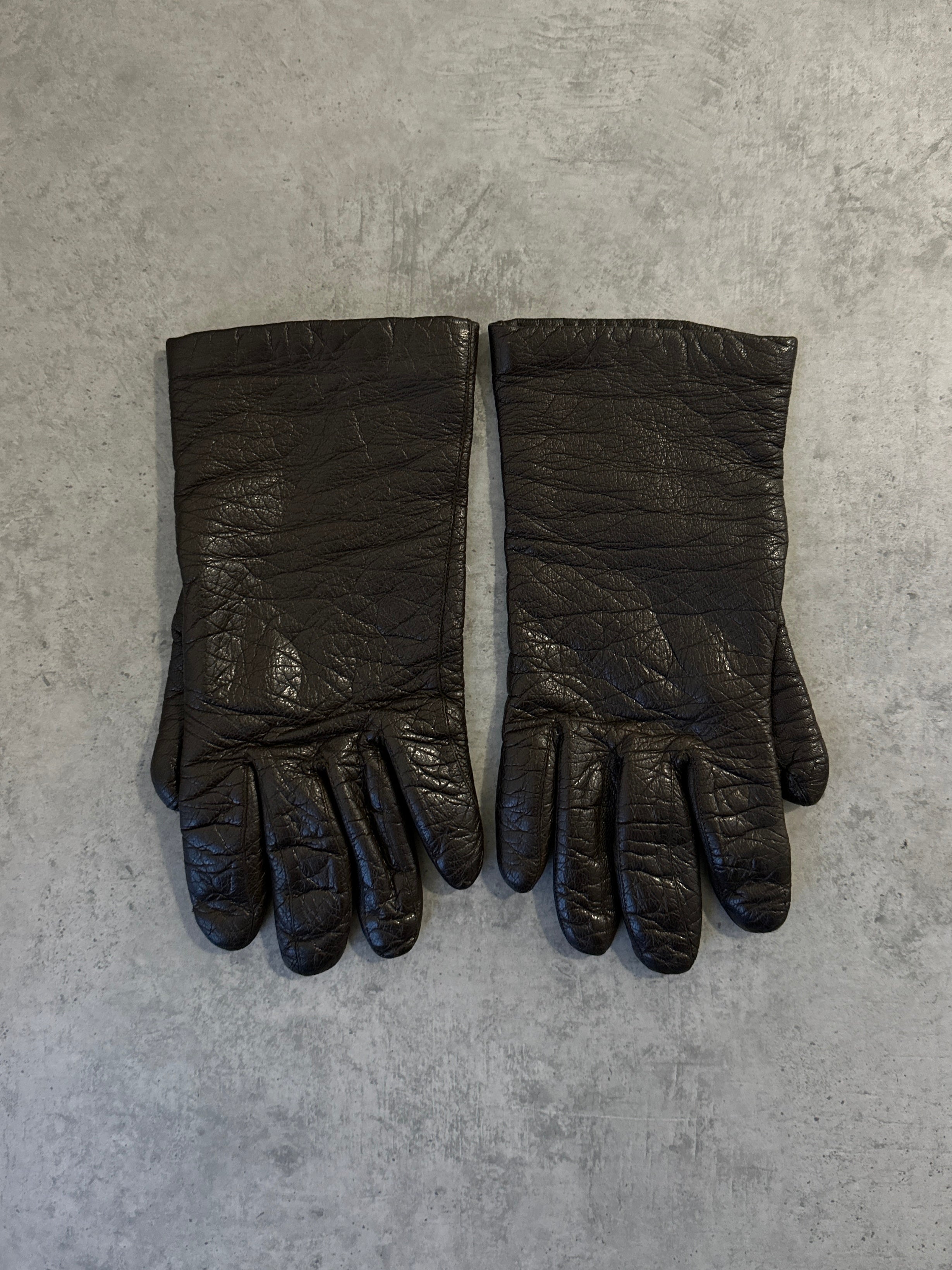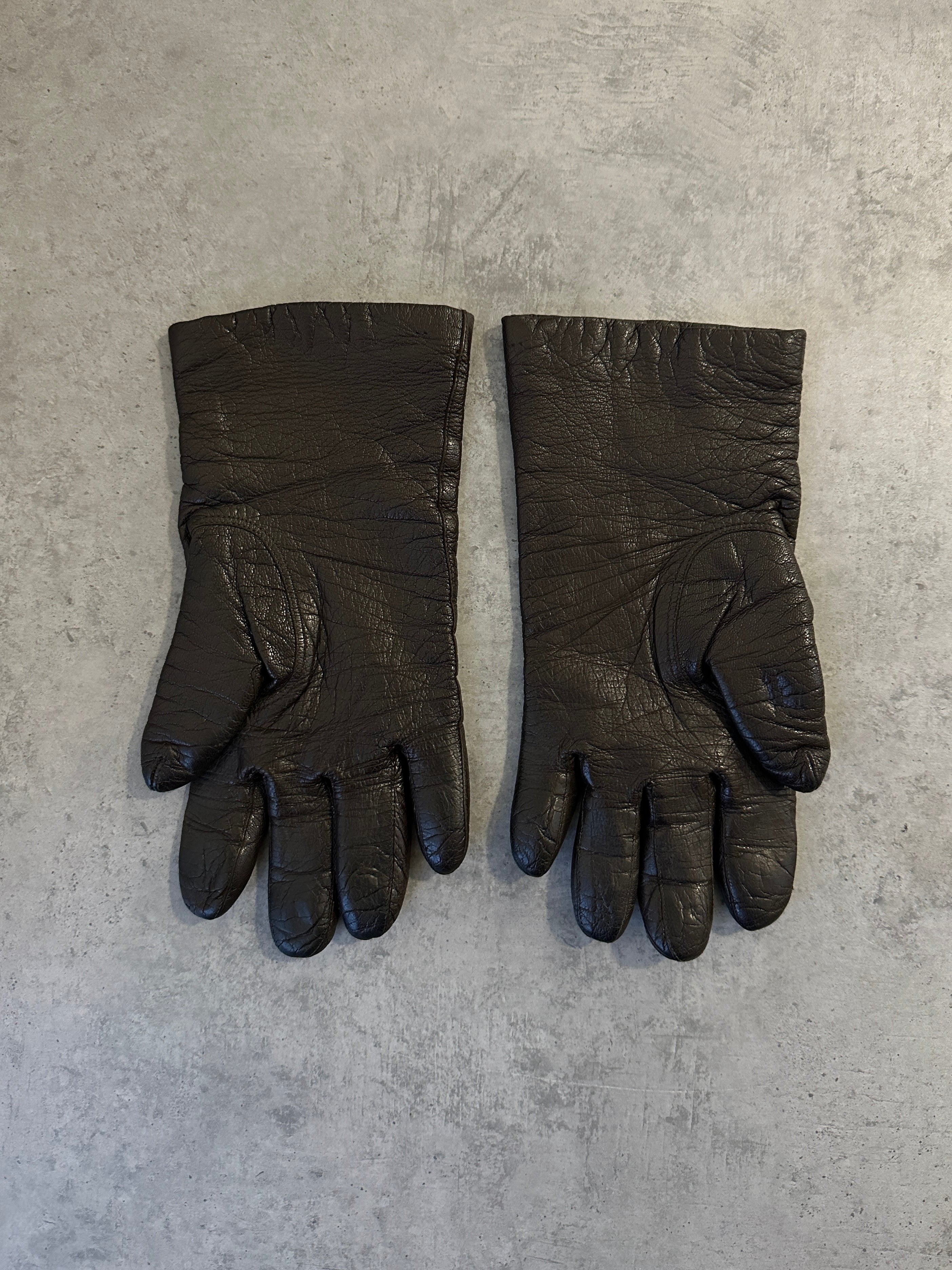 A refined pair of vintage brown leather gloves featuring a softly structured silhouette and a woven knit interior lining. The elongated cuff and natural leather grain give a timeless, understated finish ideal for winter layering.