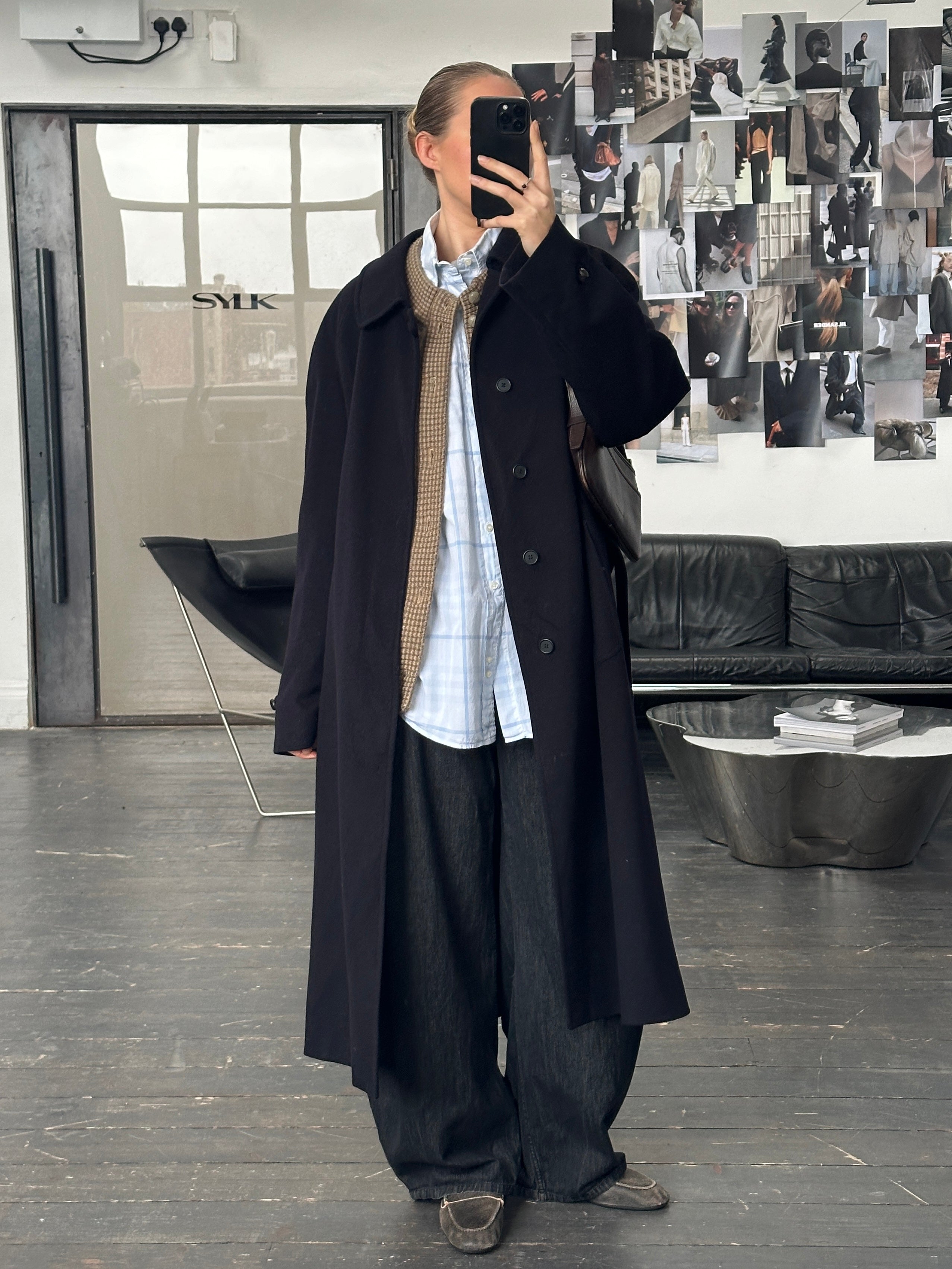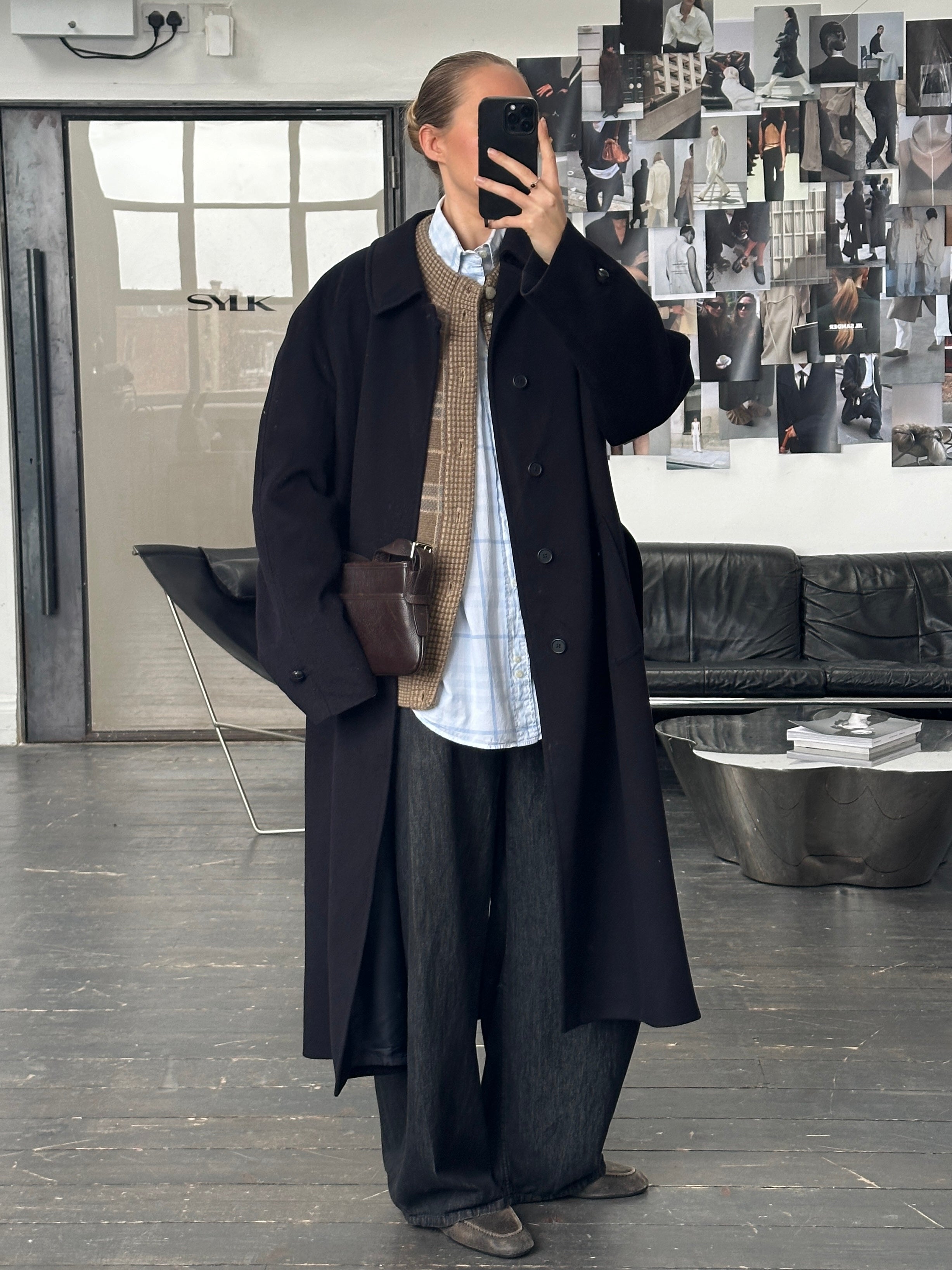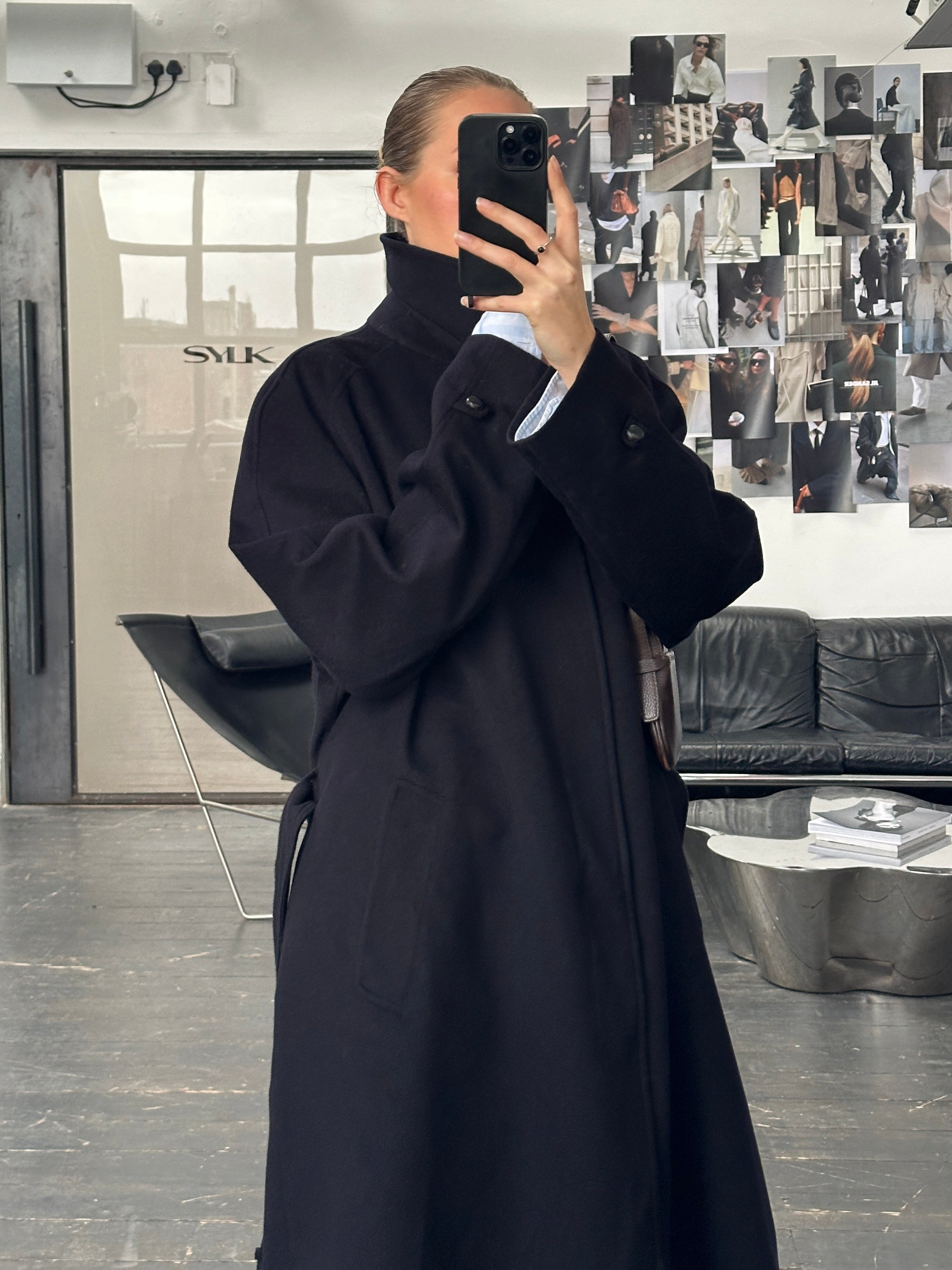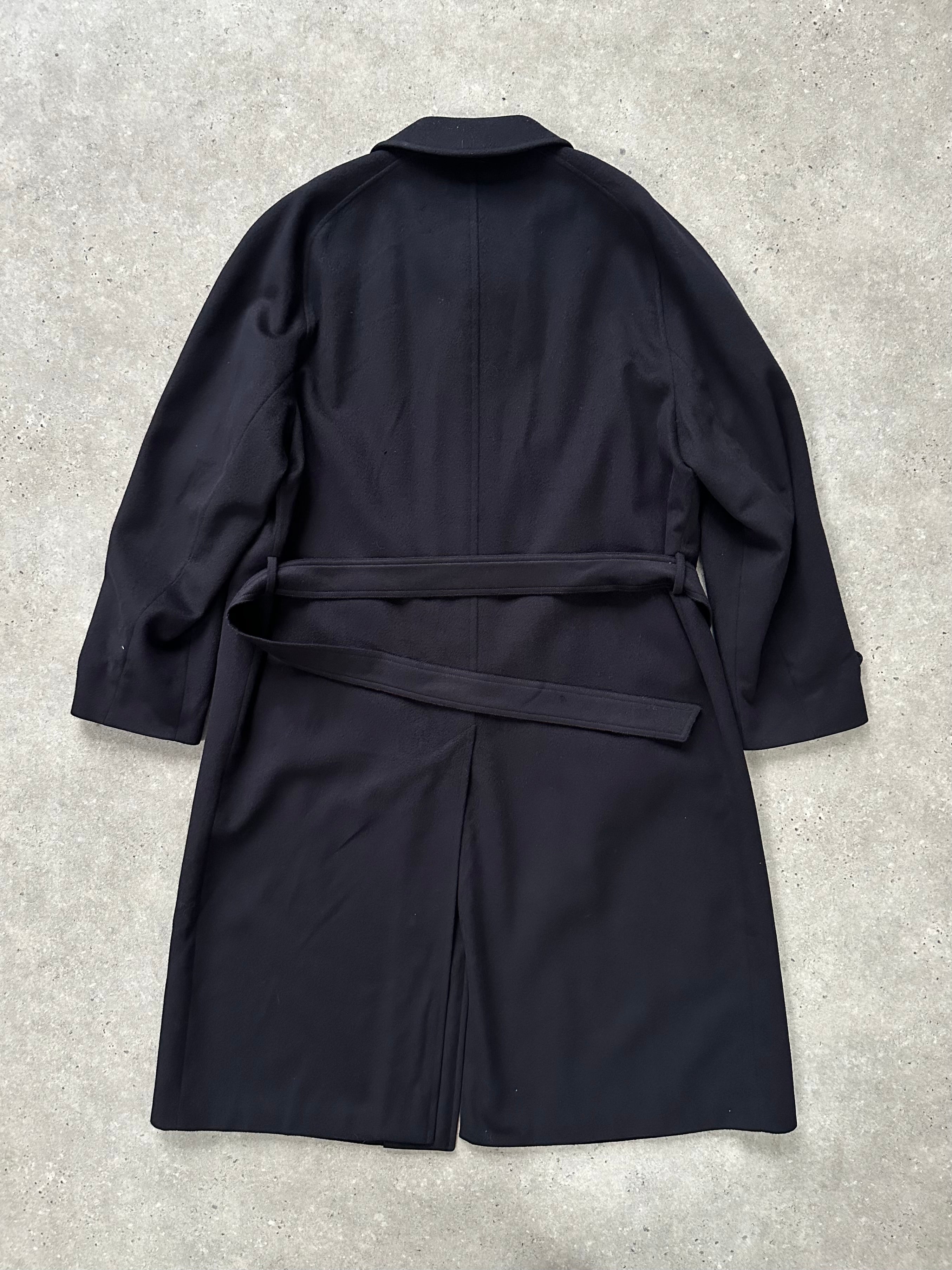 A vintage 1980s navy coat with a clean concealed placket, belted waist, and leather high neck button fastening. A classic European menswear silhouette with strong tailoring and refined outerwear detailing.