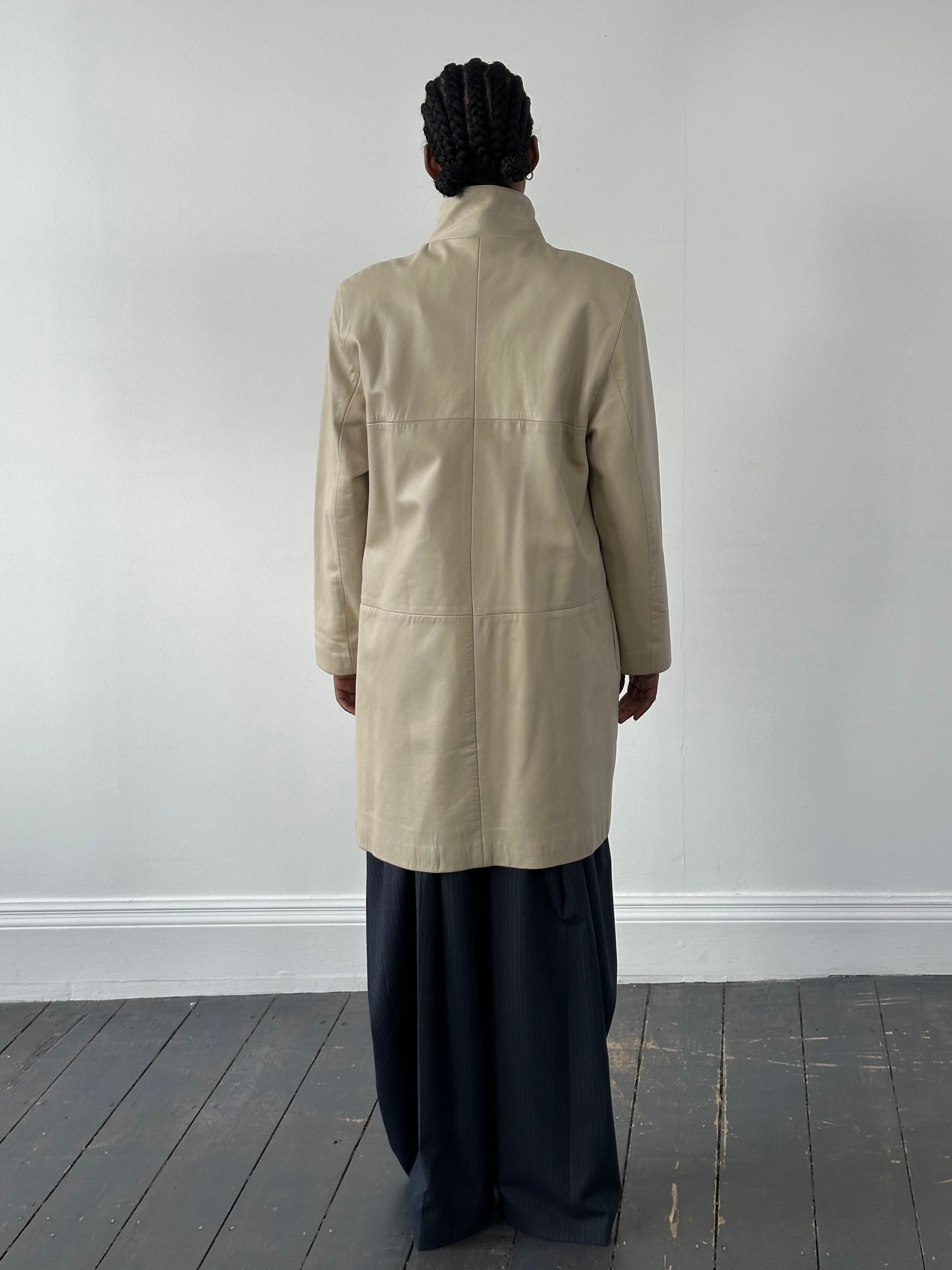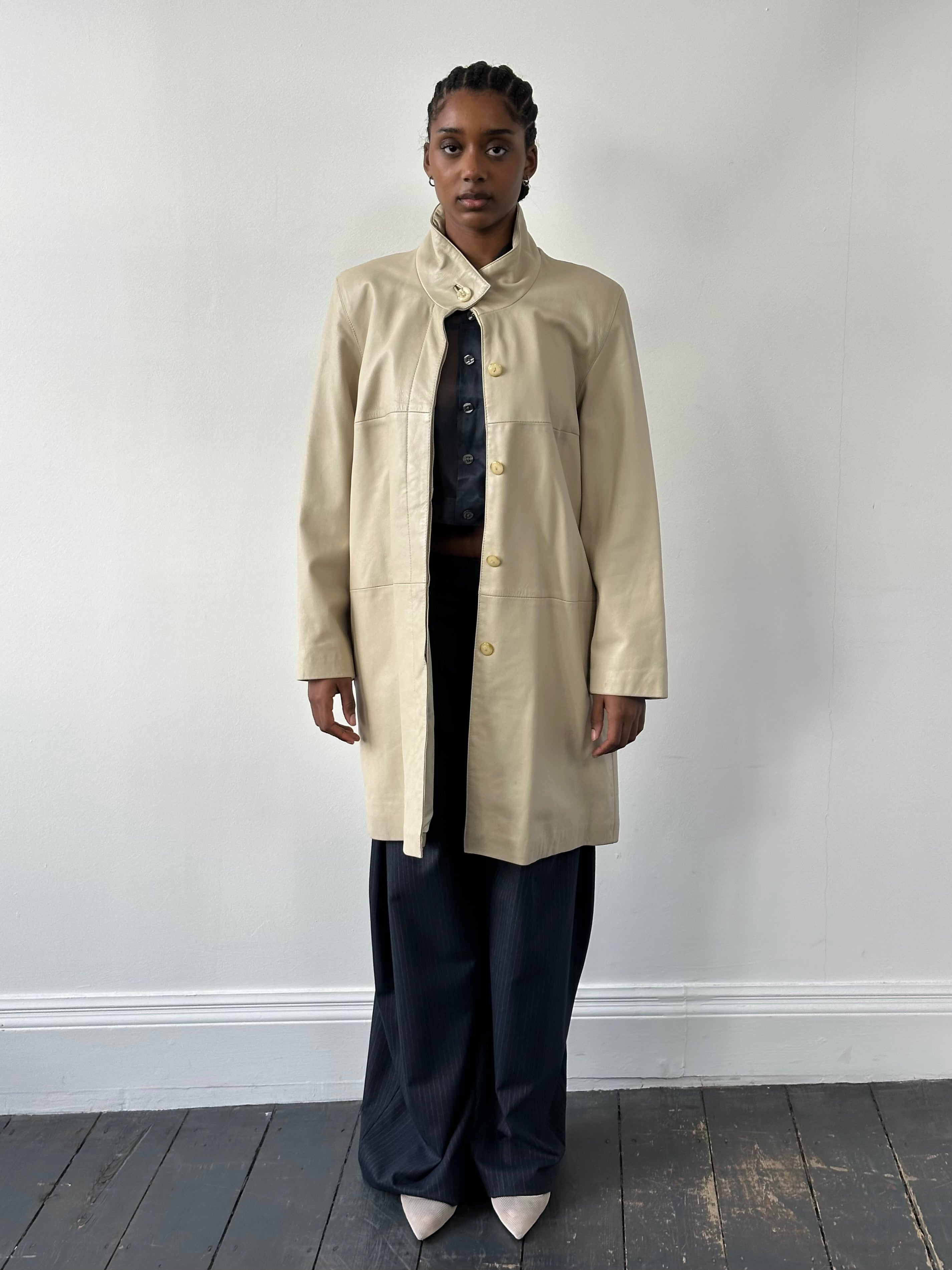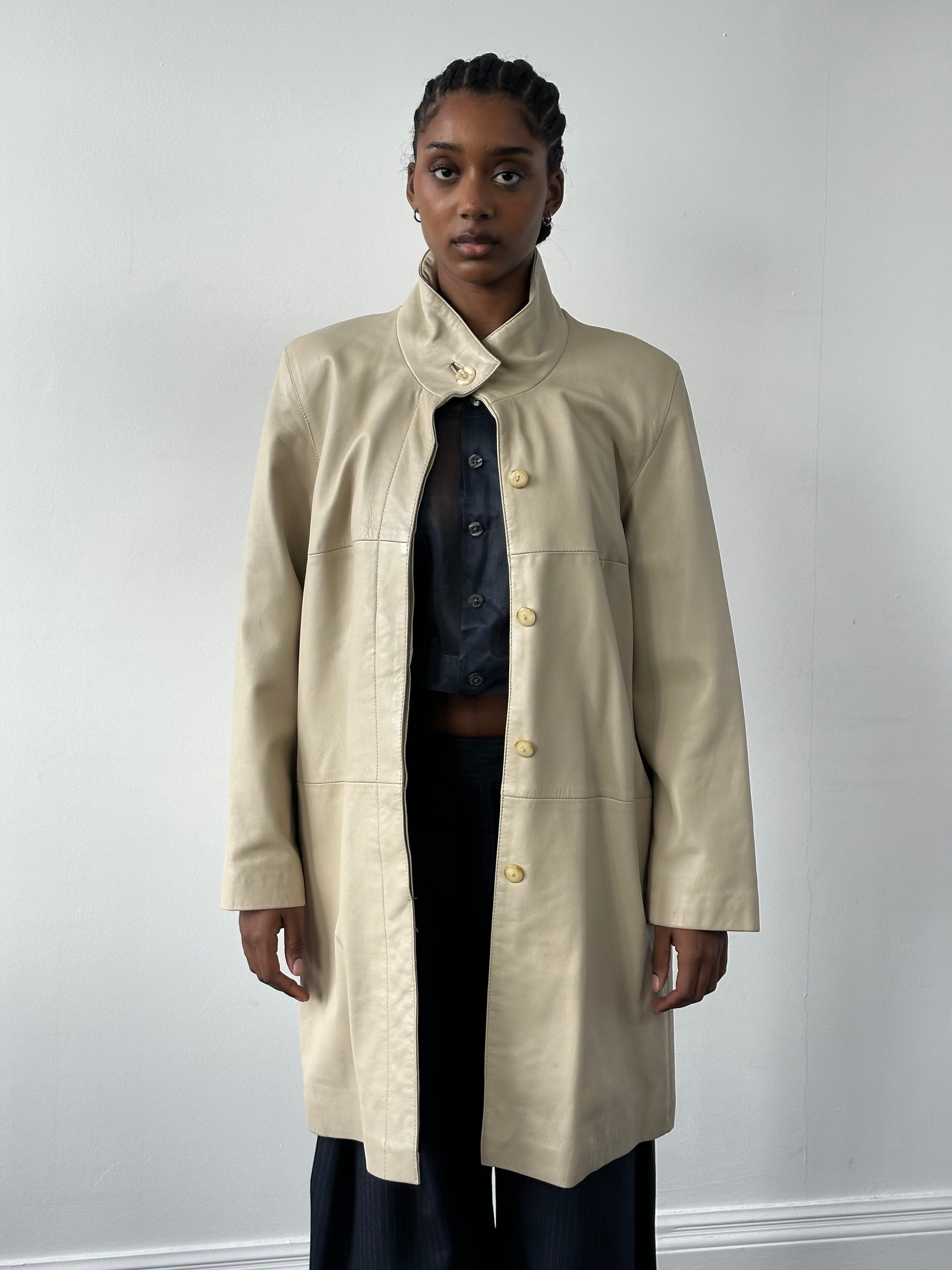 Vintage soft cream leather trench coat with a clean elongated silhouette and high neckline. Designed with a concealed placket and minimal seam detailing, creating a refined, quietly structured 90s profile with understated presence.