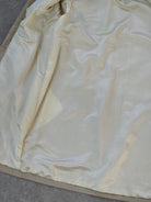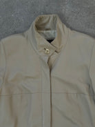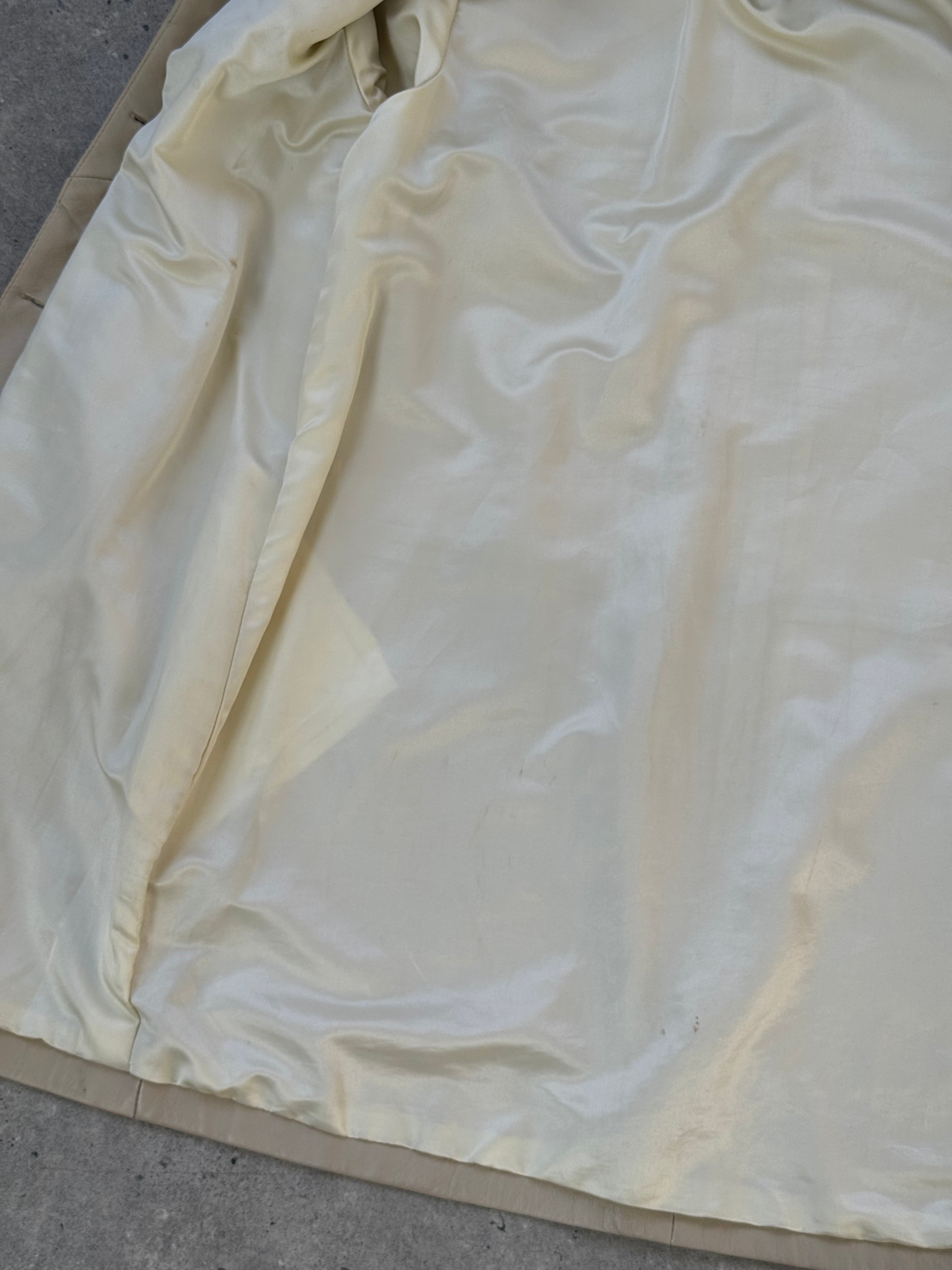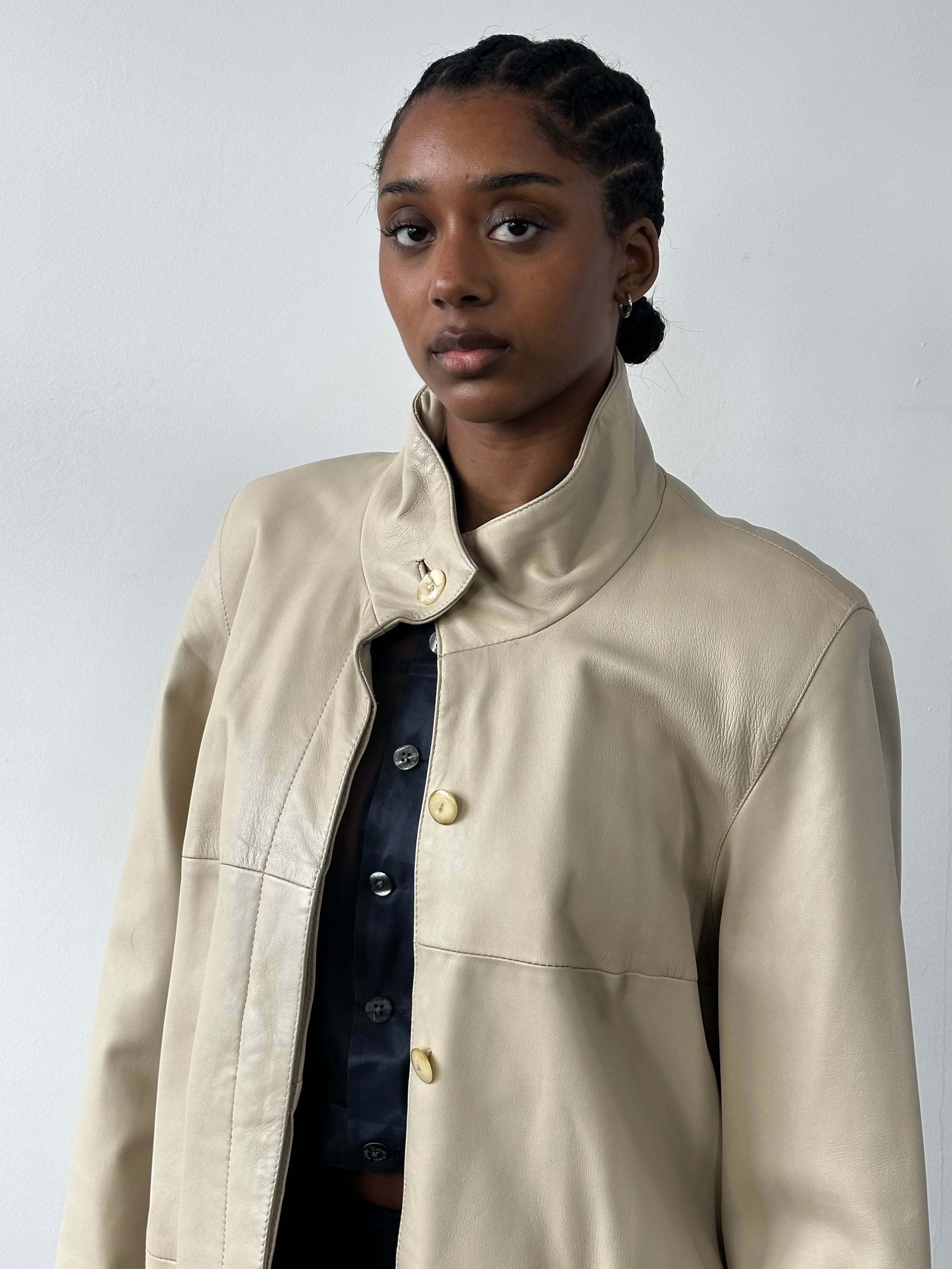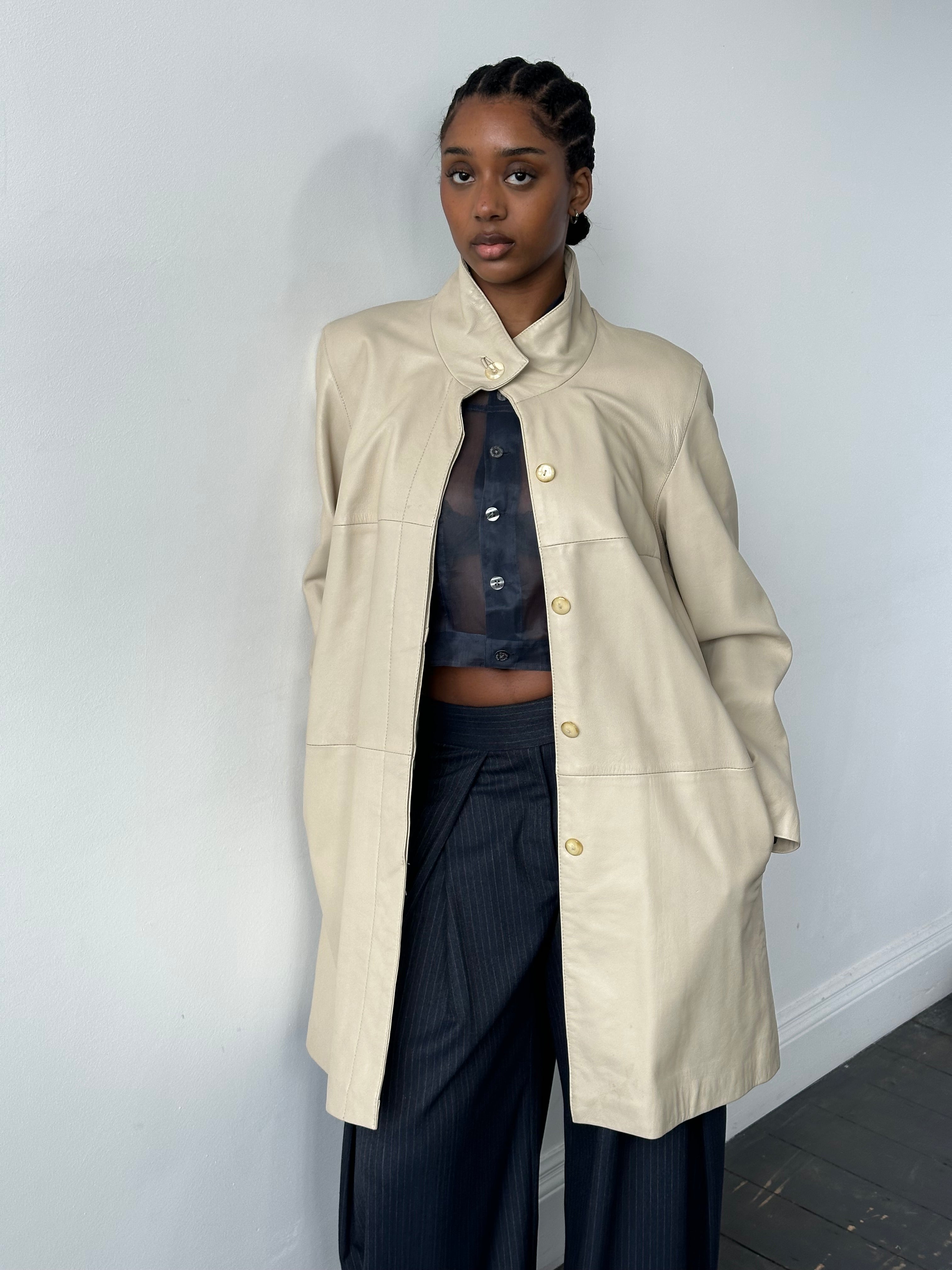 Vintage soft cream leather trench coat with a clean elongated silhouette and high neckline. Designed with a concealed placket and minimal seam detailing, creating a refined, quietly structured 90s profile with understated presence.