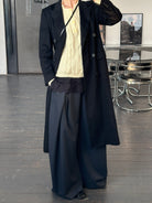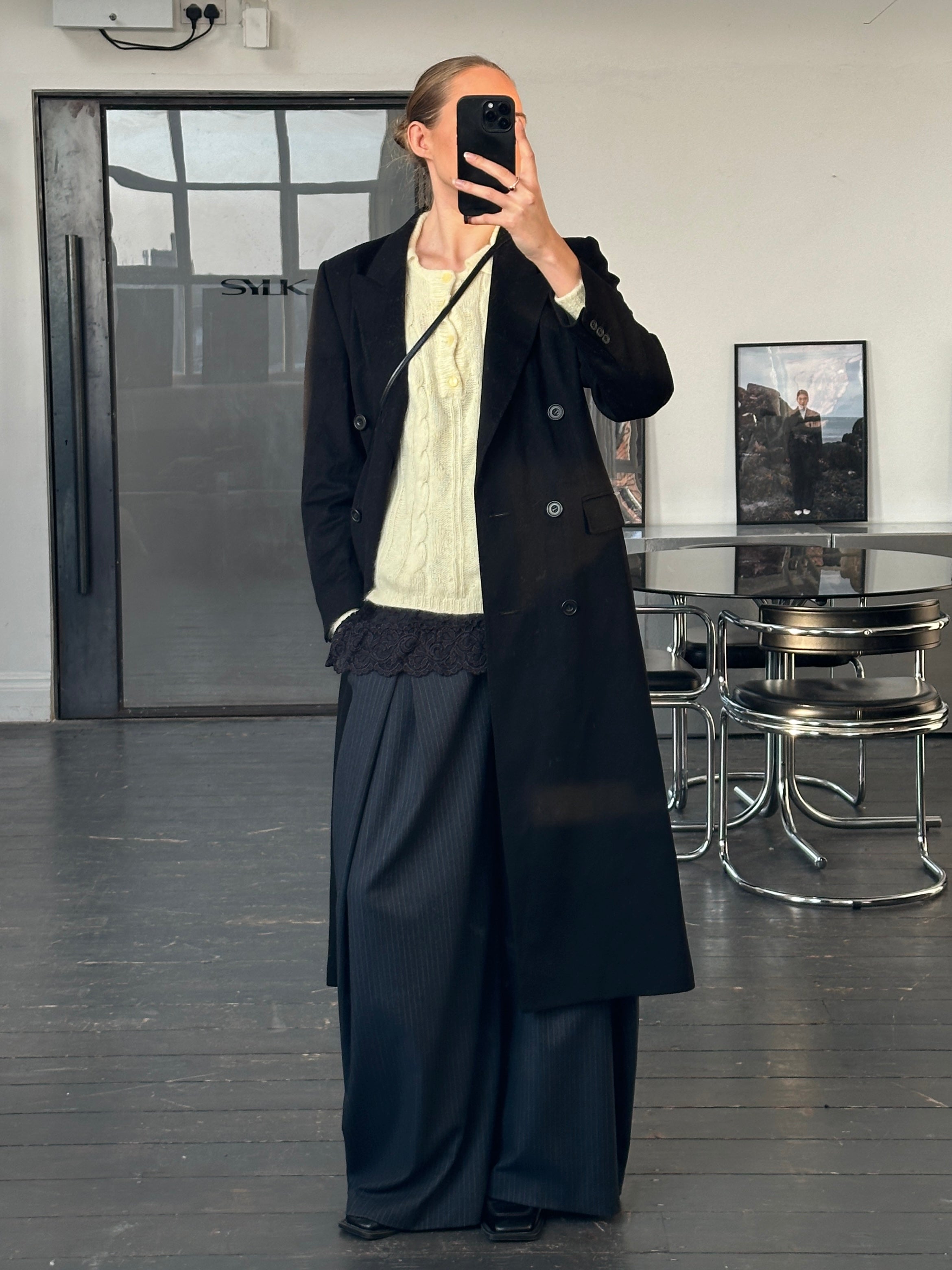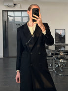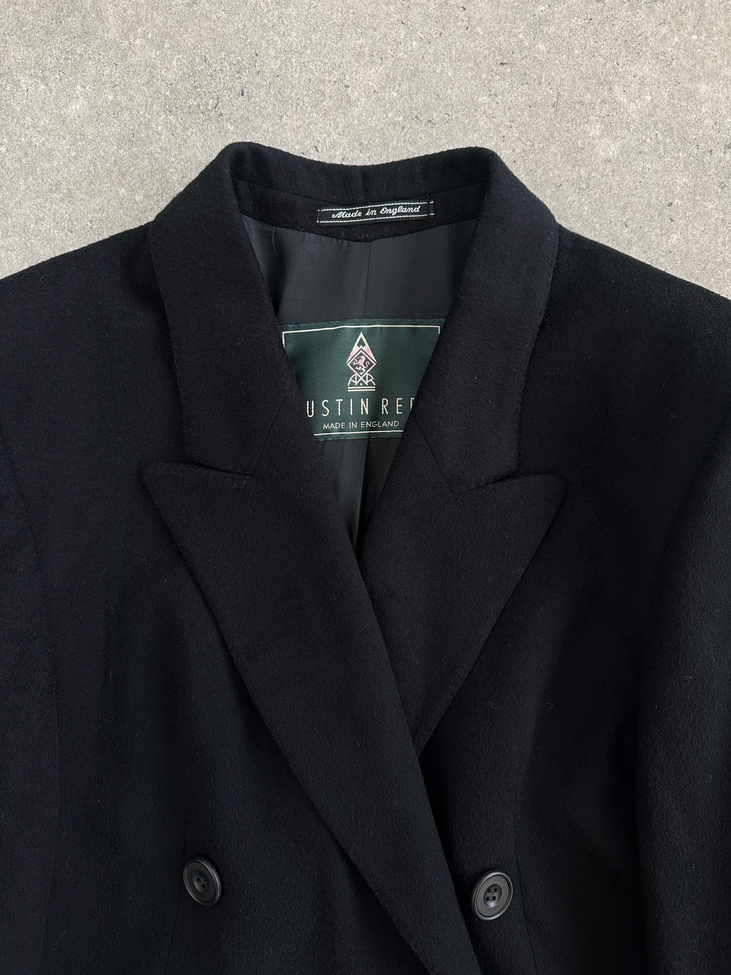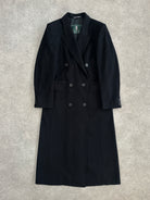A refined Austin Reed 1990s coat in black brushed pure wool, cut in a lighter-weight tailoring fabric for versatile year-round wear. Designed with a classic double breasted front, structured shoulders and a longline silhouette that sits cleanly through the body.