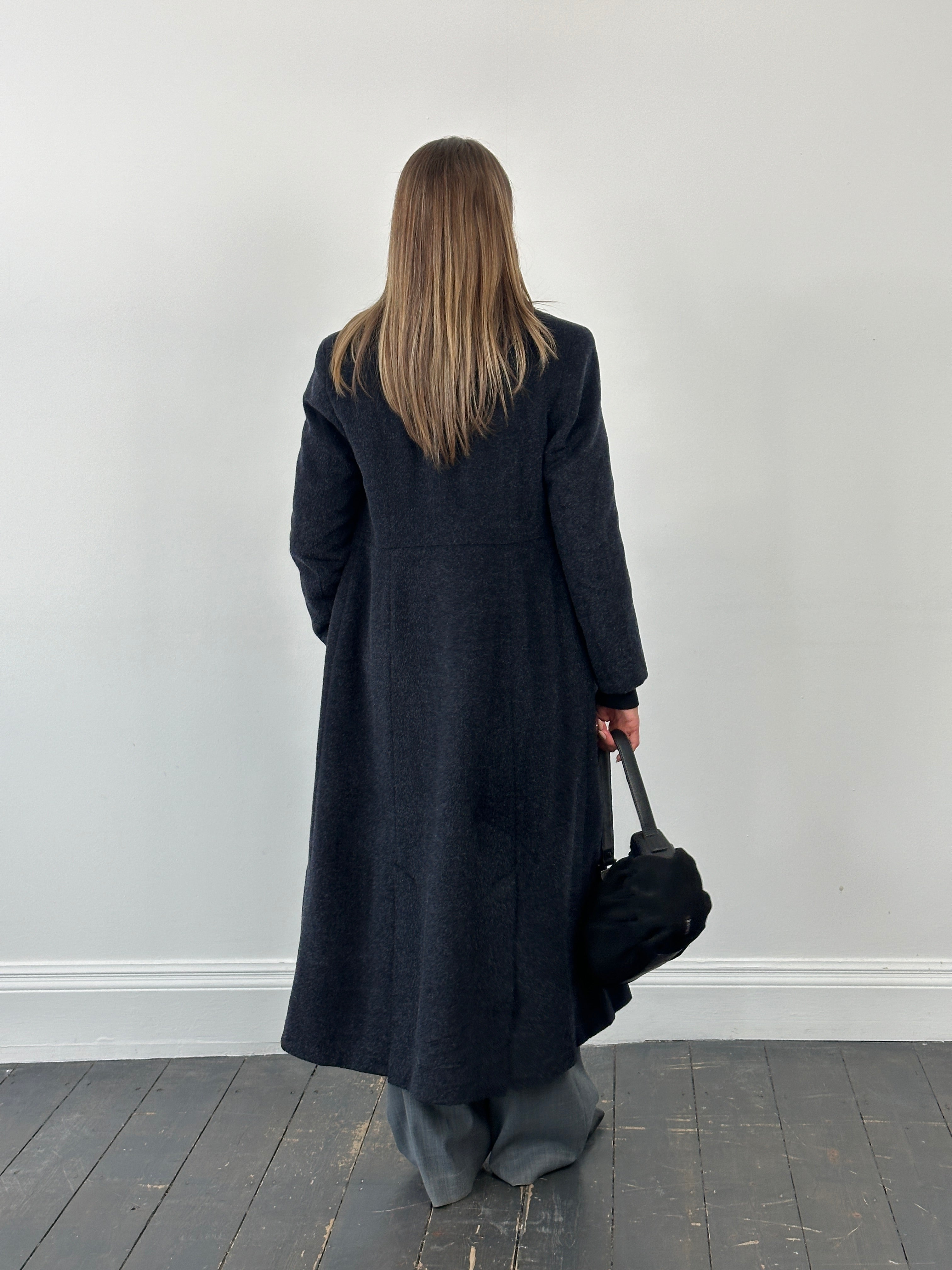 Vintage 1990s double breasted coat by Tatiana with a clean tailored silhouette and structured lapel line. Crafted from brushed pure wool and finished in a soft grey blue tone.