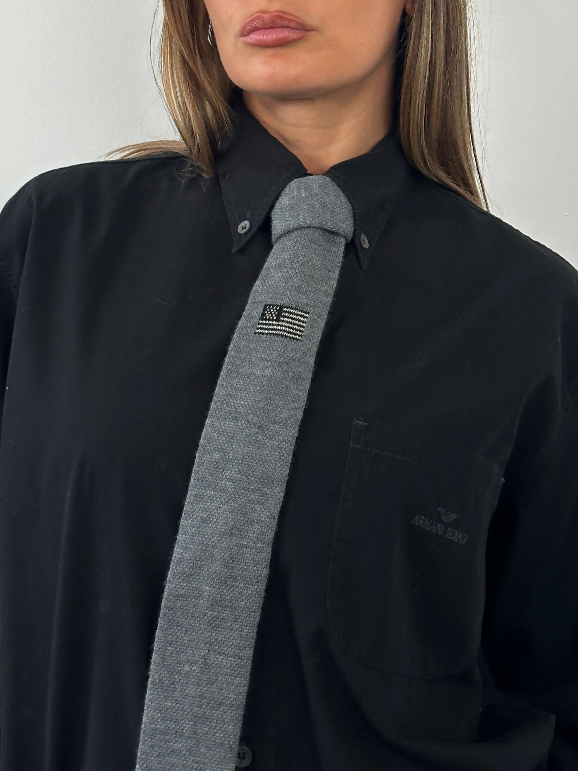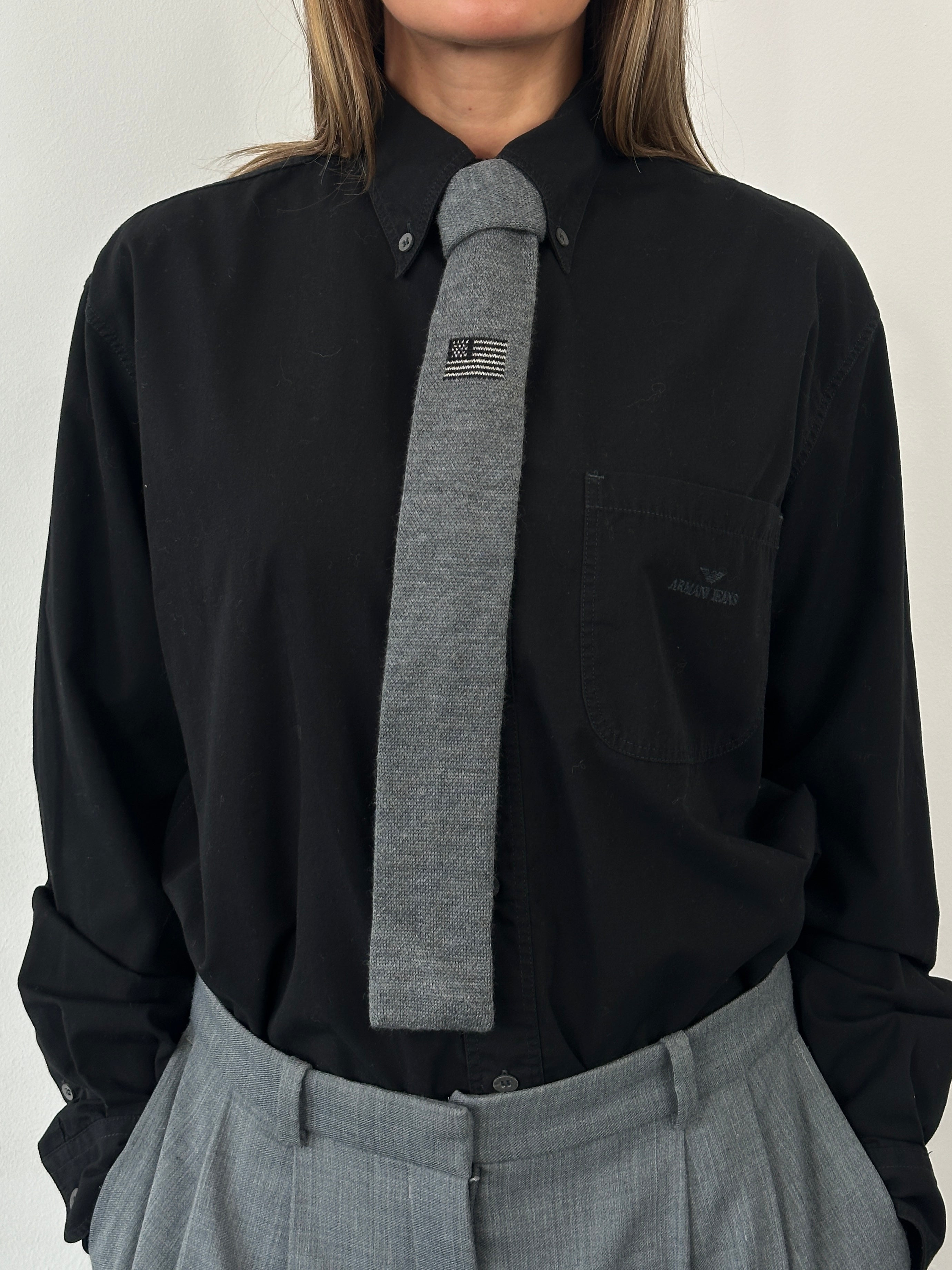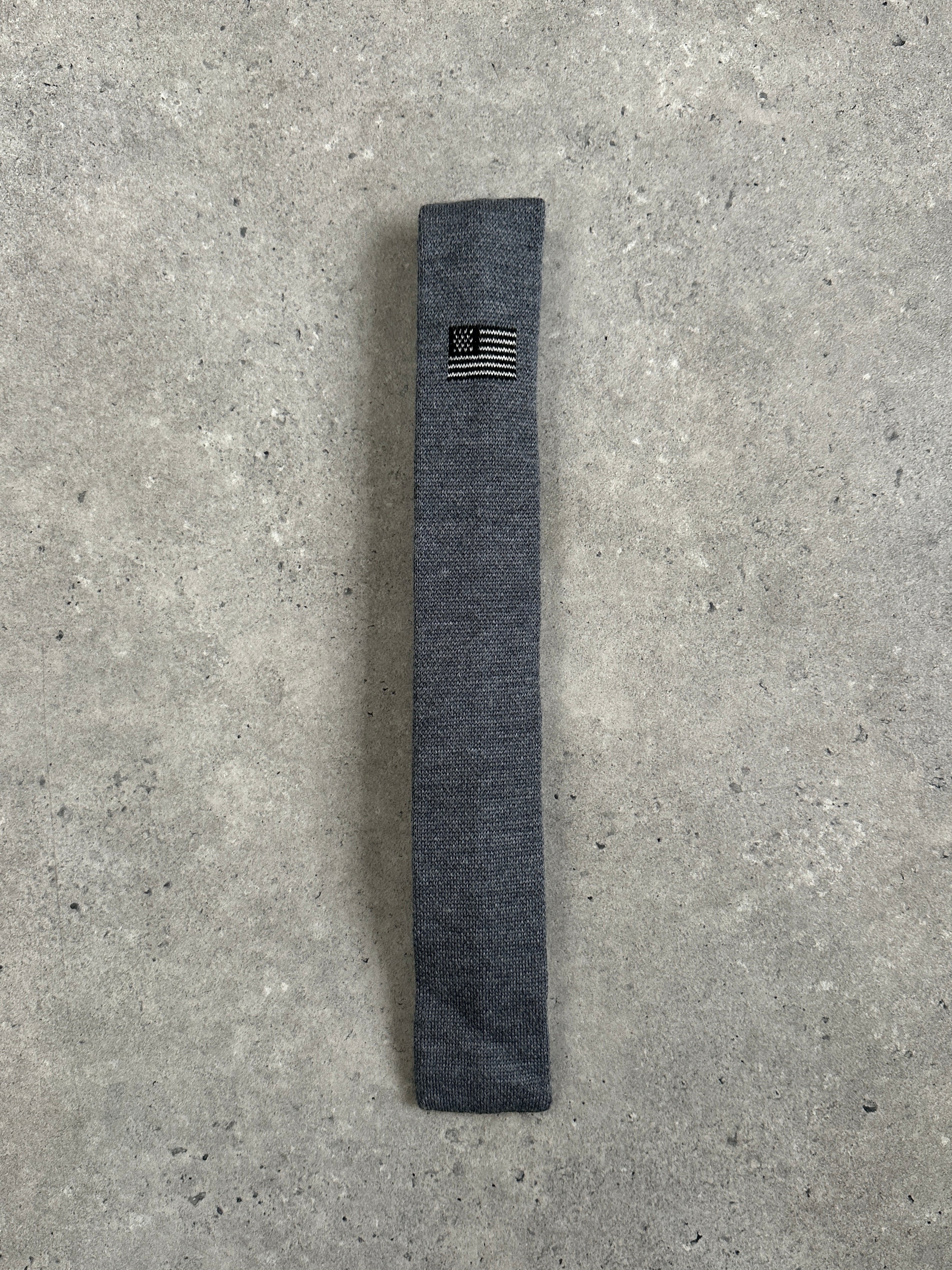 Vintage 1990s grey knitted tie by Beams, featuring a slim straight cut with a subtle woven texture and small embroidered flag detail at the tip. A classic menswear accessory that pairs well with tailored looks and relaxed suiting alike.